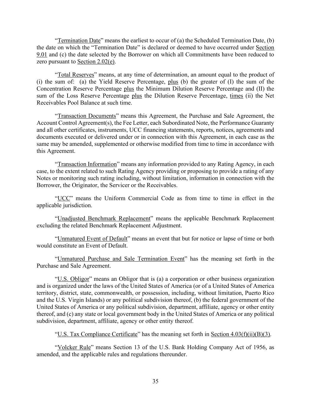 35 “Termination Date” means the earliest to occur of (a) the Scheduled Termination Date, (b) the date on which the “Termination Date” is declared or deemed to have occurred under Section 9.01 and (c) the date selected by the Borrower on which all Commitments have been reduced to zero pursuant to Section 2.02(e). “Total Reserves” means, at any time of determination, an amount equal to the product of (i) the sum of: (a) the Yield Reserve Percentage, plus (b) the greater of (I) the sum of the Concentration Reserve Percentage plus the Minimum Dilution Reserve Percentage and (II) the sum of the Loss Reserve Percentage plus the Dilution Reserve Percentage, times (ii) the Net Receivables Pool Balance at such time. “Transaction Documents” means this Agreement, the Purchase and Sale Agreement, the Account Control Agreement(s), the Fee Letter, each Subordinated Note, the Performance Guaranty and all other certificates, instruments, UCC financing statements, reports, notices, agreements and documents executed or delivered under or in connection with this Agreement, in each case as the same may be amended, supplemented or otherwise modified from time to time in accordance with this Agreement. “Transaction Information” means any information provided to any Rating Agency, in each case, to the extent related to such Rating Agency providing or proposing to provide a rating of any Notes or monitoring such rating including, without limitation, information in connection with the Borrower, the Originator, the Servicer or the Receivables. “UCC” means the Uniform Commercial Code as from time to time in effect in the applicable jurisdiction. “Unadjusted Benchmark Replacement” means the applicable Benchmark Replacement excluding the related Benchmark Replacement Adjustment. “Unmatured Event of Default” means an event that but for notice or lapse of time or both would constitute an Event of Default. “Unmatured Purchase and Sale Termination Event” has the meaning set forth in the Purchase and Sale Agreement. “U.S. Obligor” means an Obligor that is (a) a corporation or other business organization and is organized under the laws of the United States of America (or of a United States of America territory, district, state, commonwealth, or possession, including, without limitation, Puerto Rico and the U.S. Virgin Islands) or any political subdivision thereof, (b) the federal government of the United States of America or any political subdivision, department, affiliate, agency or other entity thereof, and (c) any state or local government body in the United States of America or any political subdivision, department, affiliate, agency or other entity thereof. “U.S. Tax Compliance Certificate” has the meaning set forth in Section 4.03(f)(ii)(B)(3). “Volcker Rule” means Section 13 of the U.S. Bank Holding Company Act of 1956, as amended, and the applicable rules and regulations thereunder.