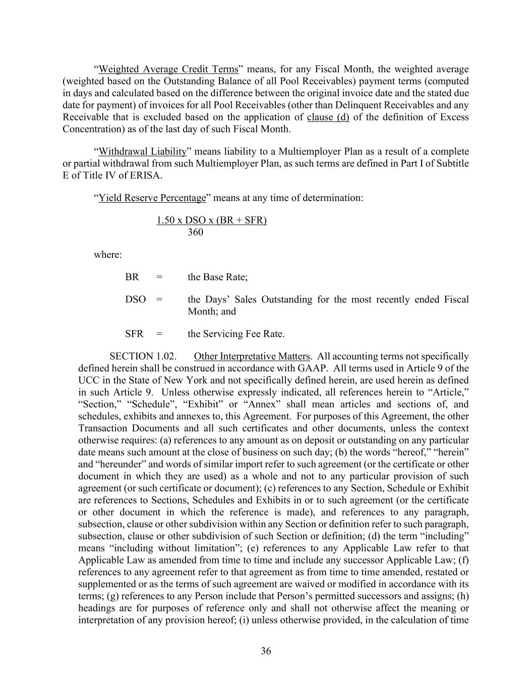 36 “Weighted Average Credit Terms” means, for any Fiscal Month, the weighted average (weighted based on the Outstanding Balance of all Pool Receivables) payment terms (computed in days and calculated based on the difference between the original invoice date and the stated due date for payment) of invoices for all Pool Receivables (other than Delinquent Receivables and any Receivable that is excluded based on the application of clause (d) of the definition of Excess Concentration) as of the last day of such Fiscal Month. “Withdrawal Liability” means liability to a Multiemployer Plan as a result of a complete or partial withdrawal from such Multiemployer Plan, as such terms are defined in Part I of Subtitle E of Title IV of ERISA. “Yield Reserve Percentage” means at any time of determination: 1.50 x DSO x (BR + SFR) 360 where: BR = the Base Rate; DSO = the Days’ Sales Outstanding for the most recently ended Fiscal Month; and SFR = the Servicing Fee Rate. SECTION 1.02. Other Interpretative Matters. All accounting terms not specifically defined herein shall be construed in accordance with GAAP. All terms used in Article 9 of the UCC in the State of New York and not specifically defined herein, are used herein as defined in such Article 9. Unless otherwise expressly indicated, all references herein to “Article,” “Section,” “Schedule”, “Exhibit” or “Annex” shall mean articles and sections of, and schedules, exhibits and annexes to, this Agreement. For purposes of this Agreement, the other Transaction Documents and all such certificates and other documents, unless the context otherwise requires: (a) references to any amount as on deposit or outstanding on any particular date means such amount at the close of business on such day; (b) the words “hereof,” “herein” and “hereunder” and words of similar import refer to such agreement (or the certificate or other document in which they are used) as a whole and not to any particular provision of such agreement (or such certificate or document); (c) references to any Section, Schedule or Exhibit are references to Sections, Schedules and Exhibits in or to such agreement (or the certificate or other document in which the reference is made), and references to any paragraph, subsection, clause or other subdivision within any Section or definition refer to such paragraph, subsection, clause or other subdivision of such Section or definition; (d) the term “including” means “including without limitation”; (e) references to any Applicable Law refer to that Applicable Law as amended from time to time and include any successor Applicable Law; (f) references to any agreement refer to that agreement as from time to time amended, restated or supplemented or as the terms of such agreement are waived or modified in accordance with its terms; (g) references to any Person include that Person’s permitted successors and assigns; (h) headings are for purposes of reference only and shall not otherwise affect the meaning or interpretation of any provision hereof; (i) unless otherwise provided, in the calculation of time