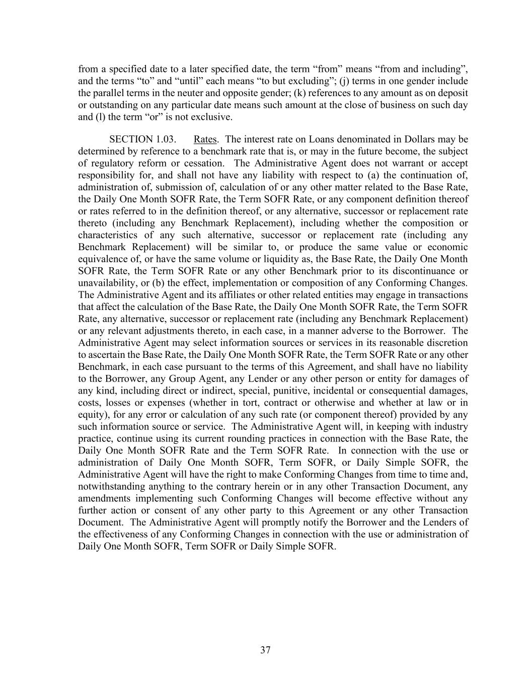37 from a specified date to a later specified date, the term “from” means “from and including”, and the terms “to” and “until” each means “to but excluding”; (j) terms in one gender include the parallel terms in the neuter and opposite gender; (k) references to any amount as on deposit or outstanding on any particular date means such amount at the close of business on such day and (l) the term “or” is not exclusive. SECTION 1.03. Rates. The interest rate on Loans denominated in Dollars may be determined by reference to a benchmark rate that is, or may in the future become, the subject of regulatory reform or cessation. The Administrative Agent does not warrant or accept responsibility for, and shall not have any liability with respect to (a) the continuation of, administration of, submission of, calculation of or any other matter related to the Base Rate, the Daily One Month SOFR Rate, the Term SOFR Rate, or any component definition thereof or rates referred to in the definition thereof, or any alternative, successor or replacement rate thereto (including any Benchmark Replacement), including whether the composition or characteristics of any such alternative, successor or replacement rate (including any Benchmark Replacement) will be similar to, or produce the same value or economic equivalence of, or have the same volume or liquidity as, the Base Rate, the Daily One Month SOFR Rate, the Term SOFR Rate or any other Benchmark prior to its discontinuance or unavailability, or (b) the effect, implementation or composition of any Conforming Changes. The Administrative Agent and its affiliates or other related entities may engage in transactions that affect the calculation of the Base Rate, the Daily One Month SOFR Rate, the Term SOFR Rate, any alternative, successor or replacement rate (including any Benchmark Replacement) or any relevant adjustments thereto, in each case, in a manner adverse to the Borrower. The Administrative Agent may select information sources or services in its reasonable discretion to ascertain the Base Rate, the Daily One Month SOFR Rate, the Term SOFR Rate or any other Benchmark, in each case pursuant to the terms of this Agreement, and shall have no liability to the Borrower, any Group Agent, any Lender or any other person or entity for damages of any kind, including direct or indirect, special, punitive, incidental or consequential damages, costs, losses or expenses (whether in tort, contract or otherwise and whether at law or in equity), for any error or calculation of any such rate (or component thereof) provided by any such information source or service. The Administrative Agent will, in keeping with industry practice, continue using its current rounding practices in connection with the Base Rate, the Daily One Month SOFR Rate and the Term SOFR Rate. In connection with the use or administration of Daily One Month SOFR, Term SOFR, or Daily Simple SOFR, the Administrative Agent will have the right to make Conforming Changes from time to time and, notwithstanding anything to the contrary herein or in any other Transaction Document, any amendments implementing such Conforming Changes will become effective without any further action or consent of any other party to this Agreement or any other Transaction Document. The Administrative Agent will promptly notify the Borrower and the Lenders of the effectiveness of any Conforming Changes in connection with the use or administration of Daily One Month SOFR, Term SOFR or Daily Simple SOFR.