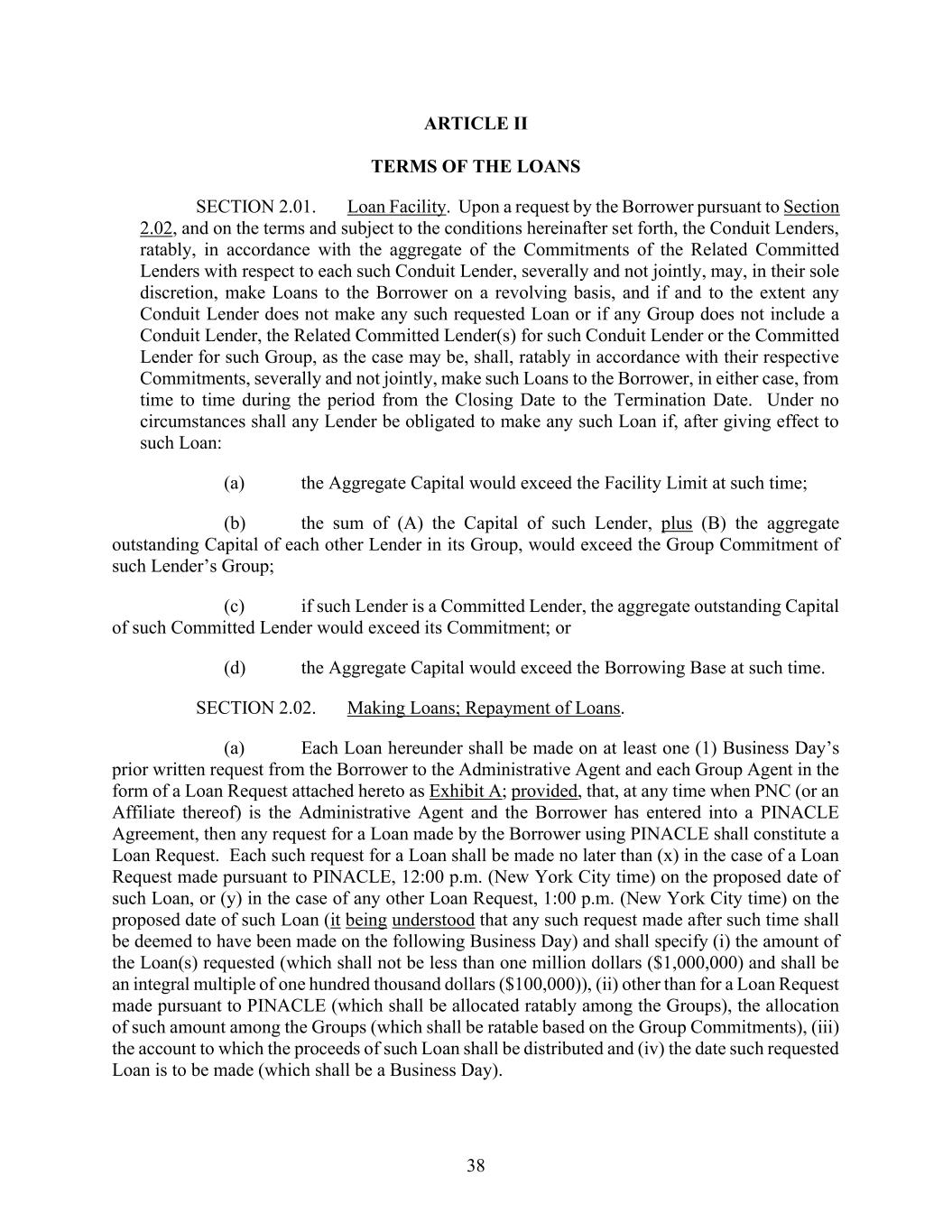 38 ARTICLE II TERMS OF THE LOANS SECTION 2.01. Loan Facility. Upon a request by the Borrower pursuant to Section 2.02, and on the terms and subject to the conditions hereinafter set forth, the Conduit Lenders, ratably, in accordance with the aggregate of the Commitments of the Related Committed Lenders with respect to each such Conduit Lender, severally and not jointly, may, in their sole discretion, make Loans to the Borrower on a revolving basis, and if and to the extent any Conduit Lender does not make any such requested Loan or if any Group does not include a Conduit Lender, the Related Committed Lender(s) for such Conduit Lender or the Committed Lender for such Group, as the case may be, shall, ratably in accordance with their respective Commitments, severally and not jointly, make such Loans to the Borrower, in either case, from time to time during the period from the Closing Date to the Termination Date. Under no circumstances shall any Lender be obligated to make any such Loan if, after giving effect to such Loan: (a) the Aggregate Capital would exceed the Facility Limit at such time; (b) the sum of (A) the Capital of such Lender, plus (B) the aggregate outstanding Capital of each other Lender in its Group, would exceed the Group Commitment of such Lender’s Group; (c) if such Lender is a Committed Lender, the aggregate outstanding Capital of such Committed Lender would exceed its Commitment; or (d) the Aggregate Capital would exceed the Borrowing Base at such time. SECTION 2.02. Making Loans; Repayment of Loans. (a) Each Loan hereunder shall be made on at least one (1) Business Day’s prior written request from the Borrower to the Administrative Agent and each Group Agent in the form of a Loan Request attached hereto as Exhibit A; provided, that, at any time when PNC (or an Affiliate thereof) is the Administrative Agent and the Borrower has entered into a PINACLE Agreement, then any request for a Loan made by the Borrower using PINACLE shall constitute a Loan Request. Each such request for a Loan shall be made no later than (x) in the case of a Loan Request made pursuant to PINACLE, 12:00 p.m. (New York City time) on the proposed date of such Loan, or (y) in the case of any other Loan Request, 1:00 p.m. (New York City time) on the proposed date of such Loan (it being understood that any such request made after such time shall be deemed to have been made on the following Business Day) and shall specify (i) the amount of the Loan(s) requested (which shall not be less than one million dollars ($1,000,000) and shall be an integral multiple of one hundred thousand dollars ($100,000)), (ii) other than for a Loan Request made pursuant to PINACLE (which shall be allocated ratably among the Groups), the allocation of such amount among the Groups (which shall be ratable based on the Group Commitments), (iii) the account to which the proceeds of such Loan shall be distributed and (iv) the date such requested Loan is to be made (which shall be a Business Day).