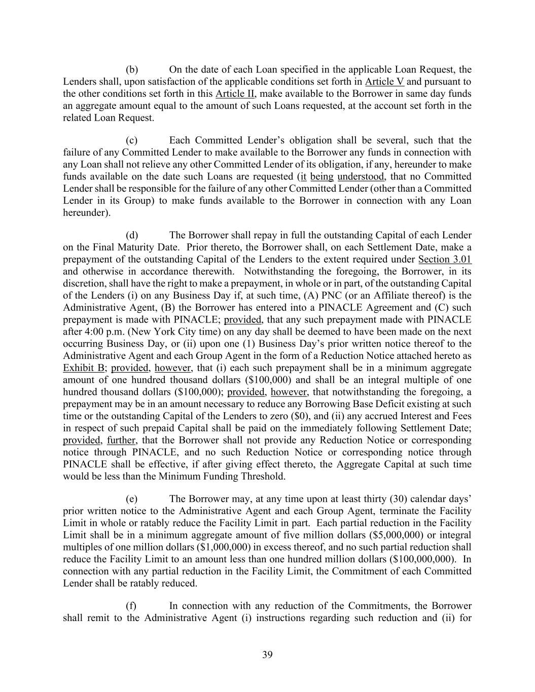 39 (b) On the date of each Loan specified in the applicable Loan Request, the Lenders shall, upon satisfaction of the applicable conditions set forth in Article V and pursuant to the other conditions set forth in this Article II, make available to the Borrower in same day funds an aggregate amount equal to the amount of such Loans requested, at the account set forth in the related Loan Request. (c) Each Committed Lender’s obligation shall be several, such that the failure of any Committed Lender to make available to the Borrower any funds in connection with any Loan shall not relieve any other Committed Lender of its obligation, if any, hereunder to make funds available on the date such Loans are requested (it being understood, that no Committed Lender shall be responsible for the failure of any other Committed Lender (other than a Committed Lender in its Group) to make funds available to the Borrower in connection with any Loan hereunder). (d) The Borrower shall repay in full the outstanding Capital of each Lender on the Final Maturity Date. Prior thereto, the Borrower shall, on each Settlement Date, make a prepayment of the outstanding Capital of the Lenders to the extent required under Section 3.01 and otherwise in accordance therewith. Notwithstanding the foregoing, the Borrower, in its discretion, shall have the right to make a prepayment, in whole or in part, of the outstanding Capital of the Lenders (i) on any Business Day if, at such time, (A) PNC (or an Affiliate thereof) is the Administrative Agent, (B) the Borrower has entered into a PINACLE Agreement and (C) such prepayment is made with PINACLE; provided, that any such prepayment made with PINACLE after 4:00 p.m. (New York City time) on any day shall be deemed to have been made on the next occurring Business Day, or (ii) upon one (1) Business Day’s prior written notice thereof to the Administrative Agent and each Group Agent in the form of a Reduction Notice attached hereto as Exhibit B; provided, however, that (i) each such prepayment shall be in a minimum aggregate amount of one hundred thousand dollars ($100,000) and shall be an integral multiple of one hundred thousand dollars ($100,000); provided, however, that notwithstanding the foregoing, a prepayment may be in an amount necessary to reduce any Borrowing Base Deficit existing at such time or the outstanding Capital of the Lenders to zero ($0), and (ii) any accrued Interest and Fees in respect of such prepaid Capital shall be paid on the immediately following Settlement Date; provided, further, that the Borrower shall not provide any Reduction Notice or corresponding notice through PINACLE, and no such Reduction Notice or corresponding notice through PINACLE shall be effective, if after giving effect thereto, the Aggregate Capital at such time would be less than the Minimum Funding Threshold. (e) The Borrower may, at any time upon at least thirty (30) calendar days’ prior written notice to the Administrative Agent and each Group Agent, terminate the Facility Limit in whole or ratably reduce the Facility Limit in part. Each partial reduction in the Facility Limit shall be in a minimum aggregate amount of five million dollars ($5,000,000) or integral multiples of one million dollars ($1,000,000) in excess thereof, and no such partial reduction shall reduce the Facility Limit to an amount less than one hundred million dollars ($100,000,000). In connection with any partial reduction in the Facility Limit, the Commitment of each Committed Lender shall be ratably reduced. (f) In connection with any reduction of the Commitments, the Borrower shall remit to the Administrative Agent (i) instructions regarding such reduction and (ii) for