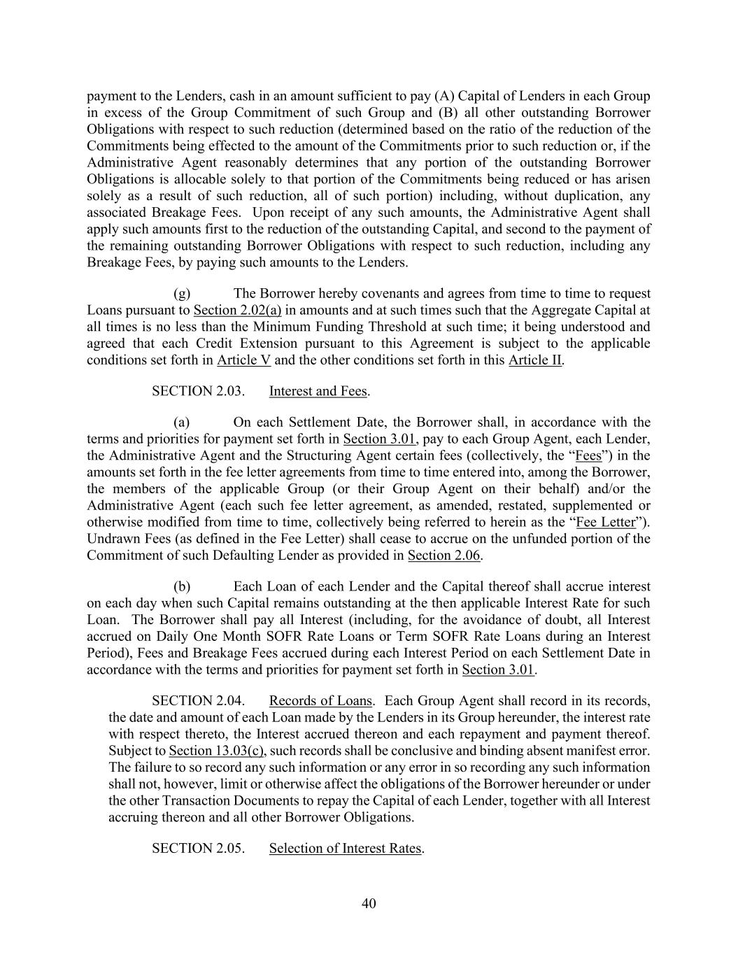 40 payment to the Lenders, cash in an amount sufficient to pay (A) Capital of Lenders in each Group in excess of the Group Commitment of such Group and (B) all other outstanding Borrower Obligations with respect to such reduction (determined based on the ratio of the reduction of the Commitments being effected to the amount of the Commitments prior to such reduction or, if the Administrative Agent reasonably determines that any portion of the outstanding Borrower Obligations is allocable solely to that portion of the Commitments being reduced or has arisen solely as a result of such reduction, all of such portion) including, without duplication, any associated Breakage Fees. Upon receipt of any such amounts, the Administrative Agent shall apply such amounts first to the reduction of the outstanding Capital, and second to the payment of the remaining outstanding Borrower Obligations with respect to such reduction, including any Breakage Fees, by paying such amounts to the Lenders. (g) The Borrower hereby covenants and agrees from time to time to request Loans pursuant to Section 2.02(a) in amounts and at such times such that the Aggregate Capital at all times is no less than the Minimum Funding Threshold at such time; it being understood and agreed that each Credit Extension pursuant to this Agreement is subject to the applicable conditions set forth in Article V and the other conditions set forth in this Article II. SECTION 2.03. Interest and Fees. (a) On each Settlement Date, the Borrower shall, in accordance with the terms and priorities for payment set forth in Section 3.01, pay to each Group Agent, each Lender, the Administrative Agent and the Structuring Agent certain fees (collectively, the “Fees”) in the amounts set forth in the fee letter agreements from time to time entered into, among the Borrower, the members of the applicable Group (or their Group Agent on their behalf) and/or the Administrative Agent (each such fee letter agreement, as amended, restated, supplemented or otherwise modified from time to time, collectively being referred to herein as the “Fee Letter”). Undrawn Fees (as defined in the Fee Letter) shall cease to accrue on the unfunded portion of the Commitment of such Defaulting Lender as provided in Section 2.06. (b) Each Loan of each Lender and the Capital thereof shall accrue interest on each day when such Capital remains outstanding at the then applicable Interest Rate for such Loan. The Borrower shall pay all Interest (including, for the avoidance of doubt, all Interest accrued on Daily One Month SOFR Rate Loans or Term SOFR Rate Loans during an Interest Period), Fees and Breakage Fees accrued during each Interest Period on each Settlement Date in accordance with the terms and priorities for payment set forth in Section 3.01. SECTION 2.04. Records of Loans. Each Group Agent shall record in its records, the date and amount of each Loan made by the Lenders in its Group hereunder, the interest rate with respect thereto, the Interest accrued thereon and each repayment and payment thereof. Subject to Section 13.03(c), such records shall be conclusive and binding absent manifest error. The failure to so record any such information or any error in so recording any such information shall not, however, limit or otherwise affect the obligations of the Borrower hereunder or under the other Transaction Documents to repay the Capital of each Lender, together with all Interest accruing thereon and all other Borrower Obligations. SECTION 2.05. Selection of Interest Rates.