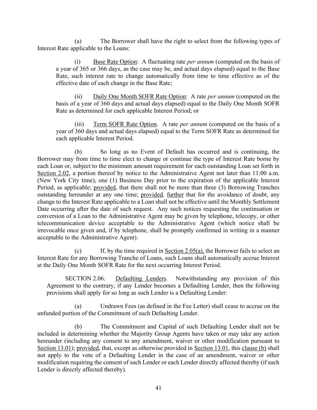 41 (a) The Borrower shall have the right to select from the following types of Interest Rate applicable to the Loans: (i) Base Rate Option: A fluctuating rate per annum (computed on the basis of a year of 365 or 366 days, as the case may be, and actual days elapsed) equal to the Base Rate, such interest rate to change automatically from time to time effective as of the effective date of each change in the Base Rate; (ii) Daily One Month SOFR Rate Option: A rate per annum (computed on the basis of a year of 360 days and actual days elapsed) equal to the Daily One Month SOFR Rate as determined for each applicable Interest Period; or (iii) Term SOFR Rate Option. A rate per annum (computed on the basis of a year of 360 days and actual days elapsed) equal to the Term SOFR Rate as determined for each applicable Interest Period. (b) So long as no Event of Default has occurred and is continuing, the Borrower may from time to time elect to change or continue the type of Interest Rate borne by each Loan or, subject to the minimum amount requirement for each outstanding Loan set forth in Section 2.02, a portion thereof by notice to the Administrative Agent not later than 11:00 a.m. (New York City time), one (1) Business Day prior to the expiration of the applicable Interest Period, as applicable; provided, that there shall not be more than three (3) Borrowing Tranches outstanding hereunder at any one time; provided, further that for the avoidance of doubt, any change to the Interest Rate applicable to a Loan shall not be effective until the Monthly Settlement Date occurring after the date of such request. Any such notices requesting the continuation or conversion of a Loan to the Administrative Agent may be given by telephone, telecopy, or other telecommunication device acceptable to the Administrative Agent (which notice shall be irrevocable once given and, if by telephone, shall be promptly confirmed in writing in a manner acceptable to the Administrative Agent). (c) If, by the time required in Section 2.05(a), the Borrower fails to select an Interest Rate for any Borrowing Tranche of Loans, such Loans shall automatically accrue Interest at the Daily One Month SOFR Rate for the next occurring Interest Period. SECTION 2.06. Defaulting Lenders. Notwithstanding any provision of this Agreement to the contrary, if any Lender becomes a Defaulting Lender, then the following provisions shall apply for so long as such Lender is a Defaulting Lender: (a) Undrawn Fees (as defined in the Fee Letter) shall cease to accrue on the unfunded portion of the Commitment of such Defaulting Lender. (b) The Commitment and Capital of such Defaulting Lender shall not be included in determining whether the Majority Group Agents have taken or may take any action hereunder (including any consent to any amendment, waiver or other modification pursuant to Section 13.01); provided, that, except as otherwise provided in Section 13.01, this clause (b) shall not apply to the vote of a Defaulting Lender in the case of an amendment, waiver or other modification requiring the consent of such Lender or each Lender directly affected thereby (if such Lender is directly affected thereby).