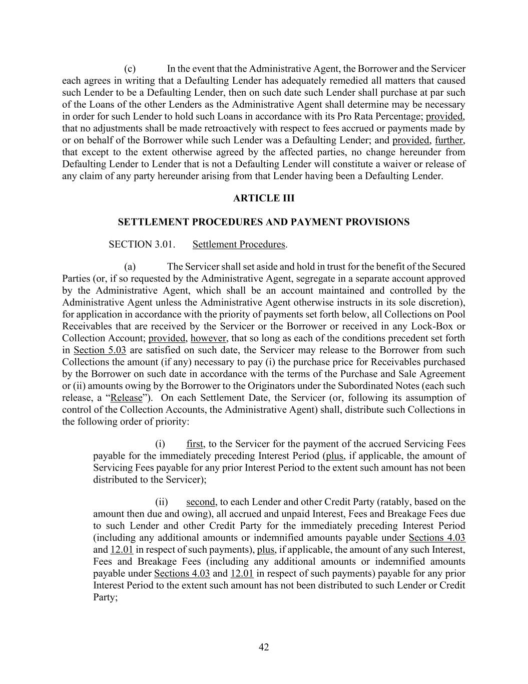42 (c) In the event that the Administrative Agent, the Borrower and the Servicer each agrees in writing that a Defaulting Lender has adequately remedied all matters that caused such Lender to be a Defaulting Lender, then on such date such Lender shall purchase at par such of the Loans of the other Lenders as the Administrative Agent shall determine may be necessary in order for such Lender to hold such Loans in accordance with its Pro Rata Percentage; provided, that no adjustments shall be made retroactively with respect to fees accrued or payments made by or on behalf of the Borrower while such Lender was a Defaulting Lender; and provided, further, that except to the extent otherwise agreed by the affected parties, no change hereunder from Defaulting Lender to Lender that is not a Defaulting Lender will constitute a waiver or release of any claim of any party hereunder arising from that Lender having been a Defaulting Lender. ARTICLE III SETTLEMENT PROCEDURES AND PAYMENT PROVISIONS SECTION 3.01. Settlement Procedures. (a) The Servicer shall set aside and hold in trust for the benefit of the Secured Parties (or, if so requested by the Administrative Agent, segregate in a separate account approved by the Administrative Agent, which shall be an account maintained and controlled by the Administrative Agent unless the Administrative Agent otherwise instructs in its sole discretion), for application in accordance with the priority of payments set forth below, all Collections on Pool Receivables that are received by the Servicer or the Borrower or received in any Lock-Box or Collection Account; provided, however, that so long as each of the conditions precedent set forth in Section 5.03 are satisfied on such date, the Servicer may release to the Borrower from such Collections the amount (if any) necessary to pay (i) the purchase price for Receivables purchased by the Borrower on such date in accordance with the terms of the Purchase and Sale Agreement or (ii) amounts owing by the Borrower to the Originators under the Subordinated Notes (each such release, a “Release”). On each Settlement Date, the Servicer (or, following its assumption of control of the Collection Accounts, the Administrative Agent) shall, distribute such Collections in the following order of priority: (i) first, to the Servicer for the payment of the accrued Servicing Fees payable for the immediately preceding Interest Period (plus, if applicable, the amount of Servicing Fees payable for any prior Interest Period to the extent such amount has not been distributed to the Servicer); (ii) second, to each Lender and other Credit Party (ratably, based on the amount then due and owing), all accrued and unpaid Interest, Fees and Breakage Fees due to such Lender and other Credit Party for the immediately preceding Interest Period (including any additional amounts or indemnified amounts payable under Sections 4.03 and 12.01 in respect of such payments), plus, if applicable, the amount of any such Interest, Fees and Breakage Fees (including any additional amounts or indemnified amounts payable under Sections 4.03 and 12.01 in respect of such payments) payable for any prior Interest Period to the extent such amount has not been distributed to such Lender or Credit Party;