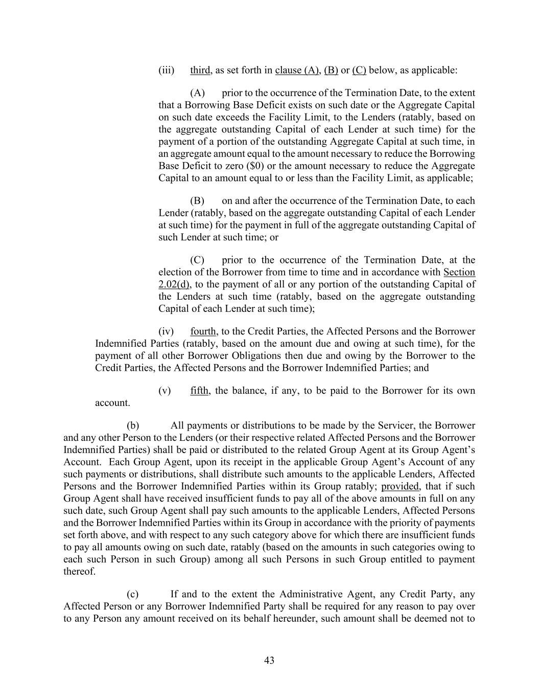 43 (iii) third, as set forth in clause (A), (B) or (C) below, as applicable: (A) prior to the occurrence of the Termination Date, to the extent that a Borrowing Base Deficit exists on such date or the Aggregate Capital on such date exceeds the Facility Limit, to the Lenders (ratably, based on the aggregate outstanding Capital of each Lender at such time) for the payment of a portion of the outstanding Aggregate Capital at such time, in an aggregate amount equal to the amount necessary to reduce the Borrowing Base Deficit to zero ($0) or the amount necessary to reduce the Aggregate Capital to an amount equal to or less than the Facility Limit, as applicable; (B) on and after the occurrence of the Termination Date, to each Lender (ratably, based on the aggregate outstanding Capital of each Lender at such time) for the payment in full of the aggregate outstanding Capital of such Lender at such time; or (C) prior to the occurrence of the Termination Date, at the election of the Borrower from time to time and in accordance with Section 2.02(d), to the payment of all or any portion of the outstanding Capital of the Lenders at such time (ratably, based on the aggregate outstanding Capital of each Lender at such time); (iv) fourth, to the Credit Parties, the Affected Persons and the Borrower Indemnified Parties (ratably, based on the amount due and owing at such time), for the payment of all other Borrower Obligations then due and owing by the Borrower to the Credit Parties, the Affected Persons and the Borrower Indemnified Parties; and (v) fifth, the balance, if any, to be paid to the Borrower for its own account. (b) All payments or distributions to be made by the Servicer, the Borrower and any other Person to the Lenders (or their respective related Affected Persons and the Borrower Indemnified Parties) shall be paid or distributed to the related Group Agent at its Group Agent’s Account. Each Group Agent, upon its receipt in the applicable Group Agent’s Account of any such payments or distributions, shall distribute such amounts to the applicable Lenders, Affected Persons and the Borrower Indemnified Parties within its Group ratably; provided, that if such Group Agent shall have received insufficient funds to pay all of the above amounts in full on any such date, such Group Agent shall pay such amounts to the applicable Lenders, Affected Persons and the Borrower Indemnified Parties within its Group in accordance with the priority of payments set forth above, and with respect to any such category above for which there are insufficient funds to pay all amounts owing on such date, ratably (based on the amounts in such categories owing to each such Person in such Group) among all such Persons in such Group entitled to payment thereof. (c) If and to the extent the Administrative Agent, any Credit Party, any Affected Person or any Borrower Indemnified Party shall be required for any reason to pay over to any Person any amount received on its behalf hereunder, such amount shall be deemed not to