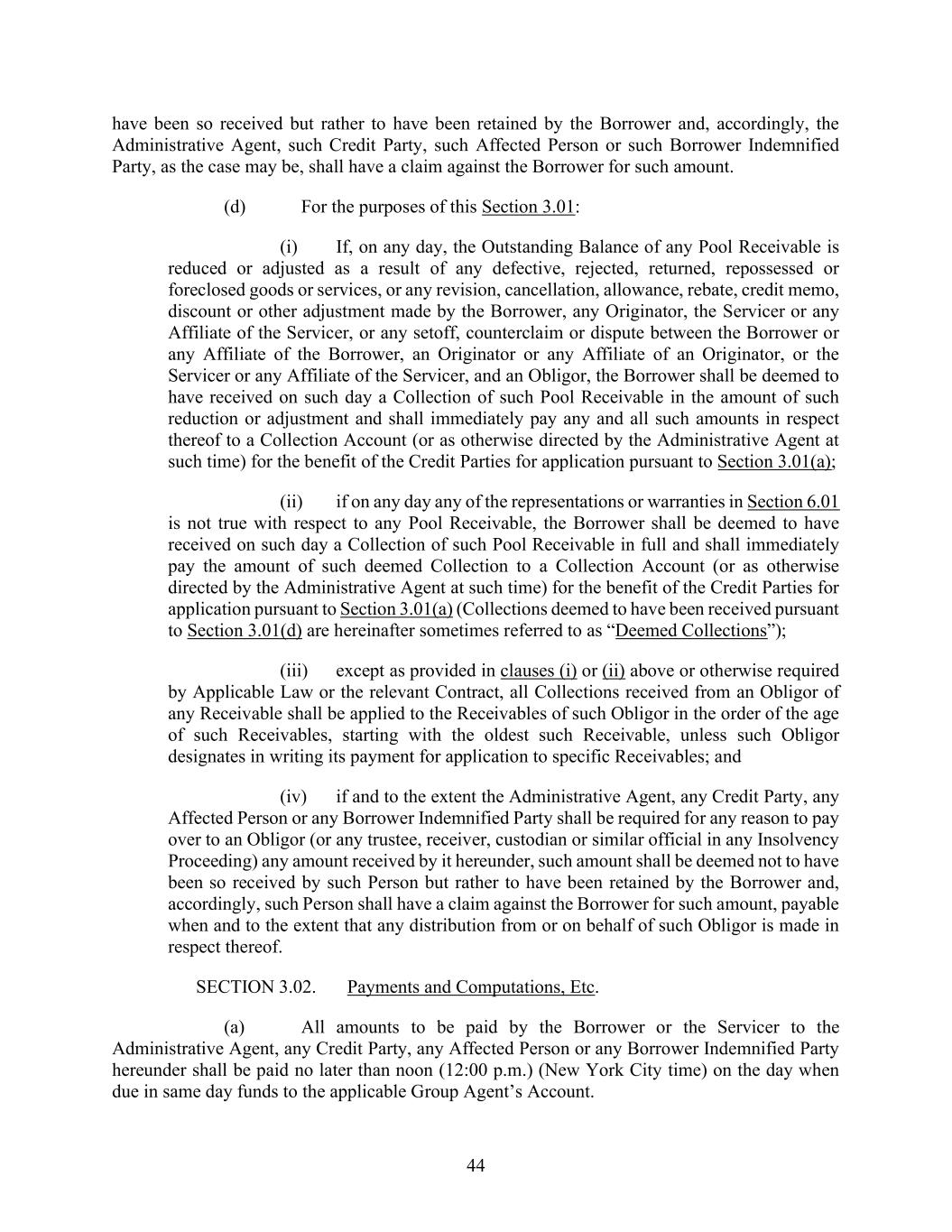 44 have been so received but rather to have been retained by the Borrower and, accordingly, the Administrative Agent, such Credit Party, such Affected Person or such Borrower Indemnified Party, as the case may be, shall have a claim against the Borrower for such amount. (d) For the purposes of this Section 3.01: (i) If, on any day, the Outstanding Balance of any Pool Receivable is reduced or adjusted as a result of any defective, rejected, returned, repossessed or foreclosed goods or services, or any revision, cancellation, allowance, rebate, credit memo, discount or other adjustment made by the Borrower, any Originator, the Servicer or any Affiliate of the Servicer, or any setoff, counterclaim or dispute between the Borrower or any Affiliate of the Borrower, an Originator or any Affiliate of an Originator, or the Servicer or any Affiliate of the Servicer, and an Obligor, the Borrower shall be deemed to have received on such day a Collection of such Pool Receivable in the amount of such reduction or adjustment and shall immediately pay any and all such amounts in respect thereof to a Collection Account (or as otherwise directed by the Administrative Agent at such time) for the benefit of the Credit Parties for application pursuant to Section 3.01(a); (ii) if on any day any of the representations or warranties in Section 6.01 is not true with respect to any Pool Receivable, the Borrower shall be deemed to have received on such day a Collection of such Pool Receivable in full and shall immediately pay the amount of such deemed Collection to a Collection Account (or as otherwise directed by the Administrative Agent at such time) for the benefit of the Credit Parties for application pursuant to Section 3.01(a) (Collections deemed to have been received pursuant to Section 3.01(d) are hereinafter sometimes referred to as “Deemed Collections”); (iii) except as provided in clauses (i) or (ii) above or otherwise required by Applicable Law or the relevant Contract, all Collections received from an Obligor of any Receivable shall be applied to the Receivables of such Obligor in the order of the age of such Receivables, starting with the oldest such Receivable, unless such Obligor designates in writing its payment for application to specific Receivables; and (iv) if and to the extent the Administrative Agent, any Credit Party, any Affected Person or any Borrower Indemnified Party shall be required for any reason to pay over to an Obligor (or any trustee, receiver, custodian or similar official in any Insolvency Proceeding) any amount received by it hereunder, such amount shall be deemed not to have been so received by such Person but rather to have been retained by the Borrower and, accordingly, such Person shall have a claim against the Borrower for such amount, payable when and to the extent that any distribution from or on behalf of such Obligor is made in respect thereof. SECTION 3.02. Payments and Computations, Etc. (a) All amounts to be paid by the Borrower or the Servicer to the Administrative Agent, any Credit Party, any Affected Person or any Borrower Indemnified Party hereunder shall be paid no later than noon (12:00 p.m.) (New York City time) on the day when due in same day funds to the applicable Group Agent’s Account.
