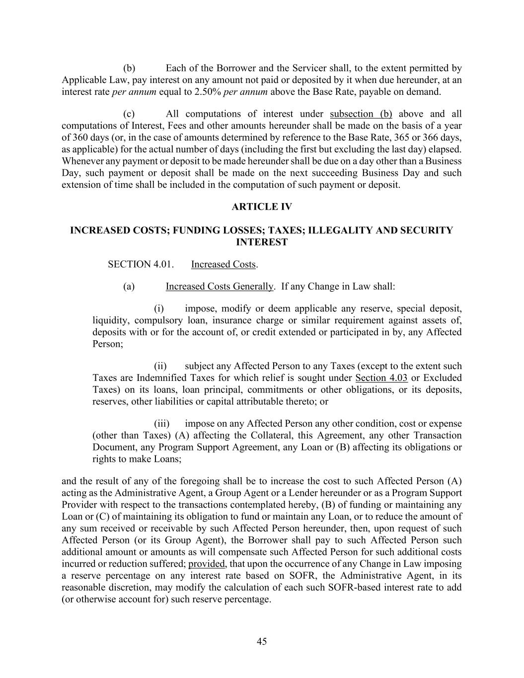 45 (b) Each of the Borrower and the Servicer shall, to the extent permitted by Applicable Law, pay interest on any amount not paid or deposited by it when due hereunder, at an interest rate per annum equal to 2.50% per annum above the Base Rate, payable on demand. (c) All computations of interest under subsection (b) above and all computations of Interest, Fees and other amounts hereunder shall be made on the basis of a year of 360 days (or, in the case of amounts determined by reference to the Base Rate, 365 or 366 days, as applicable) for the actual number of days (including the first but excluding the last day) elapsed. Whenever any payment or deposit to be made hereunder shall be due on a day other than a Business Day, such payment or deposit shall be made on the next succeeding Business Day and such extension of time shall be included in the computation of such payment or deposit. ARTICLE IV INCREASED COSTS; FUNDING LOSSES; TAXES; ILLEGALITY AND SECURITY INTEREST SECTION 4.01. Increased Costs. (a) Increased Costs Generally. If any Change in Law shall: (i) impose, modify or deem applicable any reserve, special deposit, liquidity, compulsory loan, insurance charge or similar requirement against assets of, deposits with or for the account of, or credit extended or participated in by, any Affected Person; (ii) subject any Affected Person to any Taxes (except to the extent such Taxes are Indemnified Taxes for which relief is sought under Section 4.03 or Excluded Taxes) on its loans, loan principal, commitments or other obligations, or its deposits, reserves, other liabilities or capital attributable thereto; or (iii) impose on any Affected Person any other condition, cost or expense (other than Taxes) (A) affecting the Collateral, this Agreement, any other Transaction Document, any Program Support Agreement, any Loan or (B) affecting its obligations or rights to make Loans; and the result of any of the foregoing shall be to increase the cost to such Affected Person (A) acting as the Administrative Agent, a Group Agent or a Lender hereunder or as a Program Support Provider with respect to the transactions contemplated hereby, (B) of funding or maintaining any Loan or (C) of maintaining its obligation to fund or maintain any Loan, or to reduce the amount of any sum received or receivable by such Affected Person hereunder, then, upon request of such Affected Person (or its Group Agent), the Borrower shall pay to such Affected Person such additional amount or amounts as will compensate such Affected Person for such additional costs incurred or reduction suffered; provided, that upon the occurrence of any Change in Law imposing a reserve percentage on any interest rate based on SOFR, the Administrative Agent, in its reasonable discretion, may modify the calculation of each such SOFR-based interest rate to add (or otherwise account for) such reserve percentage.