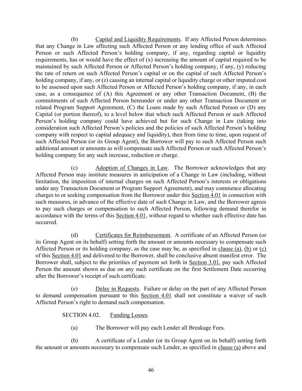 46 (b) Capital and Liquidity Requirements. If any Affected Person determines that any Change in Law affecting such Affected Person or any lending office of such Affected Person or such Affected Person’s holding company, if any, regarding capital or liquidity requirements, has or would have the effect of (x) increasing the amount of capital required to be maintained by such Affected Person or Affected Person’s holding company, if any, (y) reducing the rate of return on such Affected Person’s capital or on the capital of such Affected Person’s holding company, if any, or (z) causing an internal capital or liquidity charge or other imputed cost to be assessed upon such Affected Person or Affected Person’s holding company, if any, in each case, as a consequence of (A) this Agreement or any other Transaction Document, (B) the commitments of such Affected Person hereunder or under any other Transaction Document or related Program Support Agreement, (C) the Loans made by such Affected Person or (D) any Capital (or portion thereof), to a level below that which such Affected Person or such Affected Person’s holding company could have achieved but for such Change in Law (taking into consideration such Affected Person’s policies and the policies of such Affected Person’s holding company with respect to capital adequacy and liquidity), then from time to time, upon request of such Affected Person (or its Group Agent), the Borrower will pay to such Affected Person such additional amount or amounts as will compensate such Affected Person or such Affected Person’s holding company for any such increase, reduction or charge. (c) Adoption of Changes in Law. The Borrower acknowledges that any Affected Person may institute measures in anticipation of a Change in Law (including, without limitation, the imposition of internal charges on such Affected Person’s interests or obligations under any Transaction Document or Program Support Agreement), and may commence allocating charges to or seeking compensation from the Borrower under this Section 4.01 in connection with such measures, in advance of the effective date of such Change in Law, and the Borrower agrees to pay such charges or compensation to such Affected Person, following demand therefor in accordance with the terms of this Section 4.01, without regard to whether such effective date has occurred. (d) Certificates for Reimbursement. A certificate of an Affected Person (or its Group Agent on its behalf) setting forth the amount or amounts necessary to compensate such Affected Person or its holding company, as the case may be, as specified in clause (a), (b) or (c) of this Section 4.01 and delivered to the Borrower, shall be conclusive absent manifest error. The Borrower shall, subject to the priorities of payment set forth in Section 3.01, pay such Affected Person the amount shown as due on any such certificate on the first Settlement Date occurring after the Borrower’s receipt of such certificate. (e) Delay in Requests. Failure or delay on the part of any Affected Person to demand compensation pursuant to this Section 4.01 shall not constitute a waiver of such Affected Person’s right to demand such compensation. SECTION 4.02. Funding Losses. (a) The Borrower will pay each Lender all Breakage Fees. (b) A certificate of a Lender (or its Group Agent on its behalf) setting forth the amount or amounts necessary to compensate such Lender, as specified in clause (a) above and