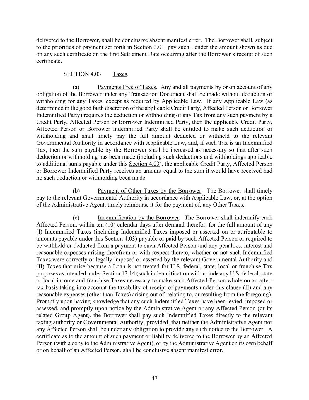 47 delivered to the Borrower, shall be conclusive absent manifest error. The Borrower shall, subject to the priorities of payment set forth in Section 3.01, pay such Lender the amount shown as due on any such certificate on the first Settlement Date occurring after the Borrower’s receipt of such certificate. SECTION 4.03. Taxes. (a) Payments Free of Taxes. Any and all payments by or on account of any obligation of the Borrower under any Transaction Document shall be made without deduction or withholding for any Taxes, except as required by Applicable Law. If any Applicable Law (as determined in the good faith discretion of the applicable Credit Party, Affected Person or Borrower Indemnified Party) requires the deduction or withholding of any Tax from any such payment by a Credit Party, Affected Person or Borrower Indemnified Party, then the applicable Credit Party, Affected Person or Borrower Indemnified Party shall be entitled to make such deduction or withholding and shall timely pay the full amount deducted or withheld to the relevant Governmental Authority in accordance with Applicable Law, and, if such Tax is an Indemnified Tax, then the sum payable by the Borrower shall be increased as necessary so that after such deduction or withholding has been made (including such deductions and withholdings applicable to additional sums payable under this Section 4.03), the applicable Credit Party, Affected Person or Borrower Indemnified Party receives an amount equal to the sum it would have received had no such deduction or withholding been made. (b) Payment of Other Taxes by the Borrower. The Borrower shall timely pay to the relevant Governmental Authority in accordance with Applicable Law, or, at the option of the Administrative Agent, timely reimburse it for the payment of, any Other Taxes. (c) Indemnification by the Borrower. The Borrower shall indemnify each Affected Person, within ten (10) calendar days after demand therefor, for the full amount of any (I) Indemnified Taxes (including Indemnified Taxes imposed or asserted on or attributable to amounts payable under this Section 4.03) payable or paid by such Affected Person or required to be withheld or deducted from a payment to such Affected Person and any penalties, interest and reasonable expenses arising therefrom or with respect thereto, whether or not such Indemnified Taxes were correctly or legally imposed or asserted by the relevant Governmental Authority and (II) Taxes that arise because a Loan is not treated for U.S. federal, state, local or franchise Tax purposes as intended under Section 13.14 (such indemnification will include any U.S. federal, state or local income and franchise Taxes necessary to make such Affected Person whole on an after- tax basis taking into account the taxability of receipt of payments under this clause (II) and any reasonable expenses (other than Taxes) arising out of, relating to, or resulting from the foregoing). Promptly upon having knowledge that any such Indemnified Taxes have been levied, imposed or assessed, and promptly upon notice by the Administrative Agent or any Affected Person (or its related Group Agent), the Borrower shall pay such Indemnified Taxes directly to the relevant taxing authority or Governmental Authority; provided, that neither the Administrative Agent nor any Affected Person shall be under any obligation to provide any such notice to the Borrower. A certificate as to the amount of such payment or liability delivered to the Borrower by an Affected Person (with a copy to the Administrative Agent), or by the Administrative Agent on its own behalf or on behalf of an Affected Person, shall be conclusive absent manifest error.