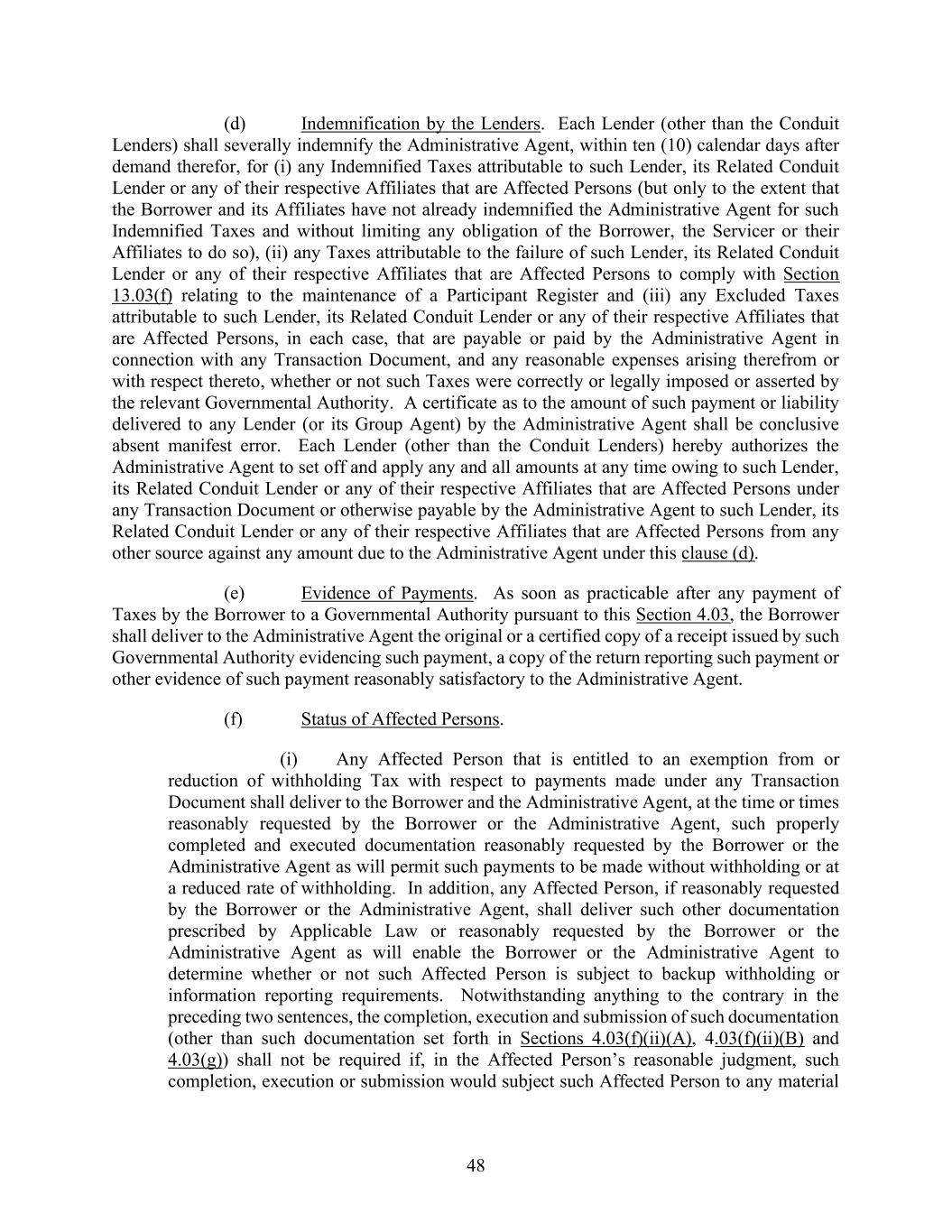 48 (d) Indemnification by the Lenders. Each Lender (other than the Conduit Lenders) shall severally indemnify the Administrative Agent, within ten (10) calendar days after demand therefor, for (i) any Indemnified Taxes attributable to such Lender, its Related Conduit Lender or any of their respective Affiliates that are Affected Persons (but only to the extent that the Borrower and its Affiliates have not already indemnified the Administrative Agent for such Indemnified Taxes and without limiting any obligation of the Borrower, the Servicer or their Affiliates to do so), (ii) any Taxes attributable to the failure of such Lender, its Related Conduit Lender or any of their respective Affiliates that are Affected Persons to comply with Section 13.03(f) relating to the maintenance of a Participant Register and (iii) any Excluded Taxes attributable to such Lender, its Related Conduit Lender or any of their respective Affiliates that are Affected Persons, in each case, that are payable or paid by the Administrative Agent in connection with any Transaction Document, and any reasonable expenses arising therefrom or with respect thereto, whether or not such Taxes were correctly or legally imposed or asserted by the relevant Governmental Authority. A certificate as to the amount of such payment or liability delivered to any Lender (or its Group Agent) by the Administrative Agent shall be conclusive absent manifest error. Each Lender (other than the Conduit Lenders) hereby authorizes the Administrative Agent to set off and apply any and all amounts at any time owing to such Lender, its Related Conduit Lender or any of their respective Affiliates that are Affected Persons under any Transaction Document or otherwise payable by the Administrative Agent to such Lender, its Related Conduit Lender or any of their respective Affiliates that are Affected Persons from any other source against any amount due to the Administrative Agent under this clause (d). (e) Evidence of Payments. As soon as practicable after any payment of Taxes by the Borrower to a Governmental Authority pursuant to this Section 4.03, the Borrower shall deliver to the Administrative Agent the original or a certified copy of a receipt issued by such Governmental Authority evidencing such payment, a copy of the return reporting such payment or other evidence of such payment reasonably satisfactory to the Administrative Agent. (f) Status of Affected Persons. (i) Any Affected Person that is entitled to an exemption from or reduction of withholding Tax with respect to payments made under any Transaction Document shall deliver to the Borrower and the Administrative Agent, at the time or times reasonably requested by the Borrower or the Administrative Agent, such properly completed and executed documentation reasonably requested by the Borrower or the Administrative Agent as will permit such payments to be made without withholding or at a reduced rate of withholding. In addition, any Affected Person, if reasonably requested by the Borrower or the Administrative Agent, shall deliver such other documentation prescribed by Applicable Law or reasonably requested by the Borrower or the Administrative Agent as will enable the Borrower or the Administrative Agent to determine whether or not such Affected Person is subject to backup withholding or information reporting requirements. Notwithstanding anything to the contrary in the preceding two sentences, the completion, execution and submission of such documentation (other than such documentation set forth in Sections 4.03(f)(ii)(A), 4.03(f)(ii)(B) and 4.03(g)) shall not be required if, in the Affected Person’s reasonable judgment, such completion, execution or submission would subject such Affected Person to any material