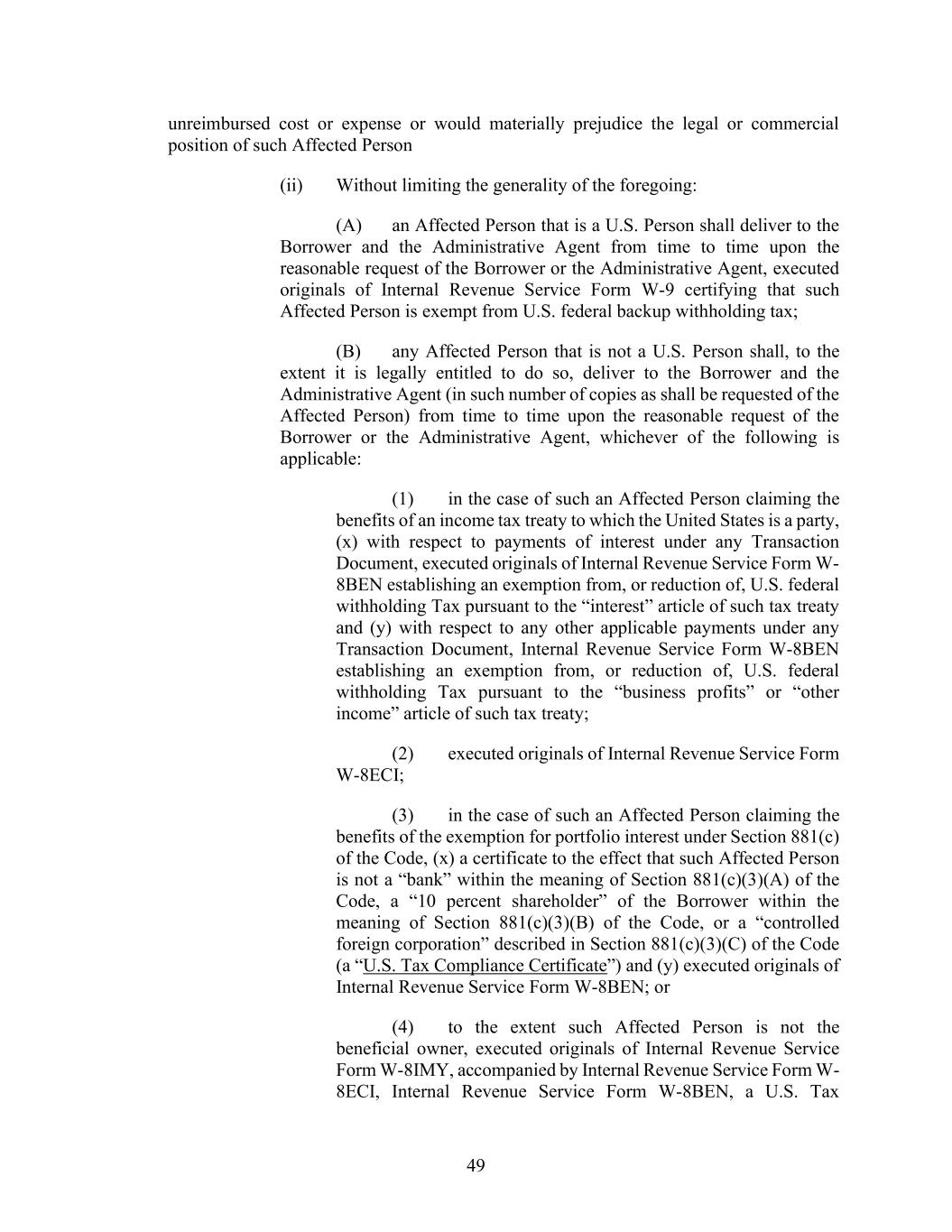 49 unreimbursed cost or expense or would materially prejudice the legal or commercial position of such Affected Person (ii) Without limiting the generality of the foregoing: (A) an Affected Person that is a U.S. Person shall deliver to the Borrower and the Administrative Agent from time to time upon the reasonable request of the Borrower or the Administrative Agent, executed originals of Internal Revenue Service Form W-9 certifying that such Affected Person is exempt from U.S. federal backup withholding tax; (B) any Affected Person that is not a U.S. Person shall, to the extent it is legally entitled to do so, deliver to the Borrower and the Administrative Agent (in such number of copies as shall be requested of the Affected Person) from time to time upon the reasonable request of the Borrower or the Administrative Agent, whichever of the following is applicable: (1) in the case of such an Affected Person claiming the benefits of an income tax treaty to which the United States is a party, (x) with respect to payments of interest under any Transaction Document, executed originals of Internal Revenue Service Form W- 8BEN establishing an exemption from, or reduction of, U.S. federal withholding Tax pursuant to the “interest” article of such tax treaty and (y) with respect to any other applicable payments under any Transaction Document, Internal Revenue Service Form W-8BEN establishing an exemption from, or reduction of, U.S. federal withholding Tax pursuant to the “business profits” or “other income” article of such tax treaty; (2) executed originals of Internal Revenue Service Form W-8ECI; (3) in the case of such an Affected Person claiming the benefits of the exemption for portfolio interest under Section 881(c) of the Code, (x) a certificate to the effect that such Affected Person is not a “bank” within the meaning of Section 881(c)(3)(A) of the Code, a “10 percent shareholder” of the Borrower within the meaning of Section 881(c)(3)(B) of the Code, or a “controlled foreign corporation” described in Section 881(c)(3)(C) of the Code (a “U.S. Tax Compliance Certificate”) and (y) executed originals of Internal Revenue Service Form W-8BEN; or (4) to the extent such Affected Person is not the beneficial owner, executed originals of Internal Revenue Service Form W-8IMY, accompanied by Internal Revenue Service Form W- 8ECI, Internal Revenue Service Form W-8BEN, a U.S. Tax