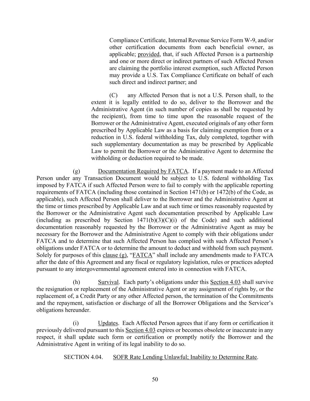 50 Compliance Certificate, Internal Revenue Service Form W-9, and/or other certification documents from each beneficial owner, as applicable; provided, that, if such Affected Person is a partnership and one or more direct or indirect partners of such Affected Person are claiming the portfolio interest exemption, such Affected Person may provide a U.S. Tax Compliance Certificate on behalf of each such direct and indirect partner; and (C) any Affected Person that is not a U.S. Person shall, to the extent it is legally entitled to do so, deliver to the Borrower and the Administrative Agent (in such number of copies as shall be requested by the recipient), from time to time upon the reasonable request of the Borrower or the Administrative Agent, executed originals of any other form prescribed by Applicable Law as a basis for claiming exemption from or a reduction in U.S. federal withholding Tax, duly completed, together with such supplementary documentation as may be prescribed by Applicable Law to permit the Borrower or the Administrative Agent to determine the withholding or deduction required to be made. (g) Documentation Required by FATCA. If a payment made to an Affected Person under any Transaction Document would be subject to U.S. federal withholding Tax imposed by FATCA if such Affected Person were to fail to comply with the applicable reporting requirements of FATCA (including those contained in Section 1471(b) or 1472(b) of the Code, as applicable), such Affected Person shall deliver to the Borrower and the Administrative Agent at the time or times prescribed by Applicable Law and at such time or times reasonably requested by the Borrower or the Administrative Agent such documentation prescribed by Applicable Law (including as prescribed by Section 1471(b)(3)(C)(i) of the Code) and such additional documentation reasonably requested by the Borrower or the Administrative Agent as may be necessary for the Borrower and the Administrative Agent to comply with their obligations under FATCA and to determine that such Affected Person has complied with such Affected Person’s obligations under FATCA or to determine the amount to deduct and withhold from such payment. Solely for purposes of this clause (g), “FATCA” shall include any amendments made to FATCA after the date of this Agreement and any fiscal or regulatory legislation, rules or practices adopted pursuant to any intergovernmental agreement entered into in connection with FATCA. (h) Survival. Each party’s obligations under this Section 4.03 shall survive the resignation or replacement of the Administrative Agent or any assignment of rights by, or the replacement of, a Credit Party or any other Affected person, the termination of the Commitments and the repayment, satisfaction or discharge of all the Borrower Obligations and the Servicer’s obligations hereunder. (i) Updates. Each Affected Person agrees that if any form or certification it previously delivered pursuant to this Section 4.03 expires or becomes obsolete or inaccurate in any respect, it shall update such form or certification or promptly notify the Borrower and the Administrative Agent in writing of its legal inability to do so. SECTION 4.04. SOFR Rate Lending Unlawful; Inability to Determine Rate.