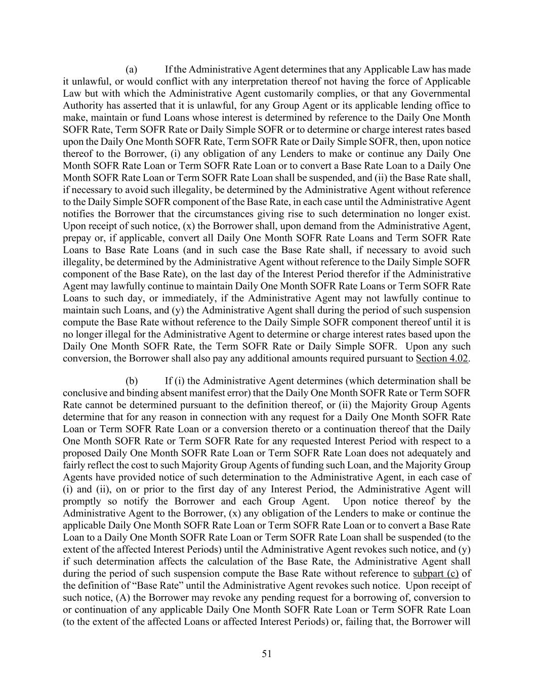 51 (a) If the Administrative Agent determines that any Applicable Law has made it unlawful, or would conflict with any interpretation thereof not having the force of Applicable Law but with which the Administrative Agent customarily complies, or that any Governmental Authority has asserted that it is unlawful, for any Group Agent or its applicable lending office to make, maintain or fund Loans whose interest is determined by reference to the Daily One Month SOFR Rate, Term SOFR Rate or Daily Simple SOFR or to determine or charge interest rates based upon the Daily One Month SOFR Rate, Term SOFR Rate or Daily Simple SOFR, then, upon notice thereof to the Borrower, (i) any obligation of any Lenders to make or continue any Daily One Month SOFR Rate Loan or Term SOFR Rate Loan or to convert a Base Rate Loan to a Daily One Month SOFR Rate Loan or Term SOFR Rate Loan shall be suspended, and (ii) the Base Rate shall, if necessary to avoid such illegality, be determined by the Administrative Agent without reference to the Daily Simple SOFR component of the Base Rate, in each case until the Administrative Agent notifies the Borrower that the circumstances giving rise to such determination no longer exist. Upon receipt of such notice, (x) the Borrower shall, upon demand from the Administrative Agent, prepay or, if applicable, convert all Daily One Month SOFR Rate Loans and Term SOFR Rate Loans to Base Rate Loans (and in such case the Base Rate shall, if necessary to avoid such illegality, be determined by the Administrative Agent without reference to the Daily Simple SOFR component of the Base Rate), on the last day of the Interest Period therefor if the Administrative Agent may lawfully continue to maintain Daily One Month SOFR Rate Loans or Term SOFR Rate Loans to such day, or immediately, if the Administrative Agent may not lawfully continue to maintain such Loans, and (y) the Administrative Agent shall during the period of such suspension compute the Base Rate without reference to the Daily Simple SOFR component thereof until it is no longer illegal for the Administrative Agent to determine or charge interest rates based upon the Daily One Month SOFR Rate, the Term SOFR Rate or Daily Simple SOFR. Upon any such conversion, the Borrower shall also pay any additional amounts required pursuant to Section 4.02. (b) If (i) the Administrative Agent determines (which determination shall be conclusive and binding absent manifest error) that the Daily One Month SOFR Rate or Term SOFR Rate cannot be determined pursuant to the definition thereof, or (ii) the Majority Group Agents determine that for any reason in connection with any request for a Daily One Month SOFR Rate Loan or Term SOFR Rate Loan or a conversion thereto or a continuation thereof that the Daily One Month SOFR Rate or Term SOFR Rate for any requested Interest Period with respect to a proposed Daily One Month SOFR Rate Loan or Term SOFR Rate Loan does not adequately and fairly reflect the cost to such Majority Group Agents of funding such Loan, and the Majority Group Agents have provided notice of such determination to the Administrative Agent, in each case of (i) and (ii), on or prior to the first day of any Interest Period, the Administrative Agent will promptly so notify the Borrower and each Group Agent. Upon notice thereof by the Administrative Agent to the Borrower, (x) any obligation of the Lenders to make or continue the applicable Daily One Month SOFR Rate Loan or Term SOFR Rate Loan or to convert a Base Rate Loan to a Daily One Month SOFR Rate Loan or Term SOFR Rate Loan shall be suspended (to the extent of the affected Interest Periods) until the Administrative Agent revokes such notice, and (y) if such determination affects the calculation of the Base Rate, the Administrative Agent shall during the period of such suspension compute the Base Rate without reference to subpart (c) of the definition of “Base Rate” until the Administrative Agent revokes such notice. Upon receipt of such notice, (A) the Borrower may revoke any pending request for a borrowing of, conversion to or continuation of any applicable Daily One Month SOFR Rate Loan or Term SOFR Rate Loan (to the extent of the affected Loans or affected Interest Periods) or, failing that, the Borrower will