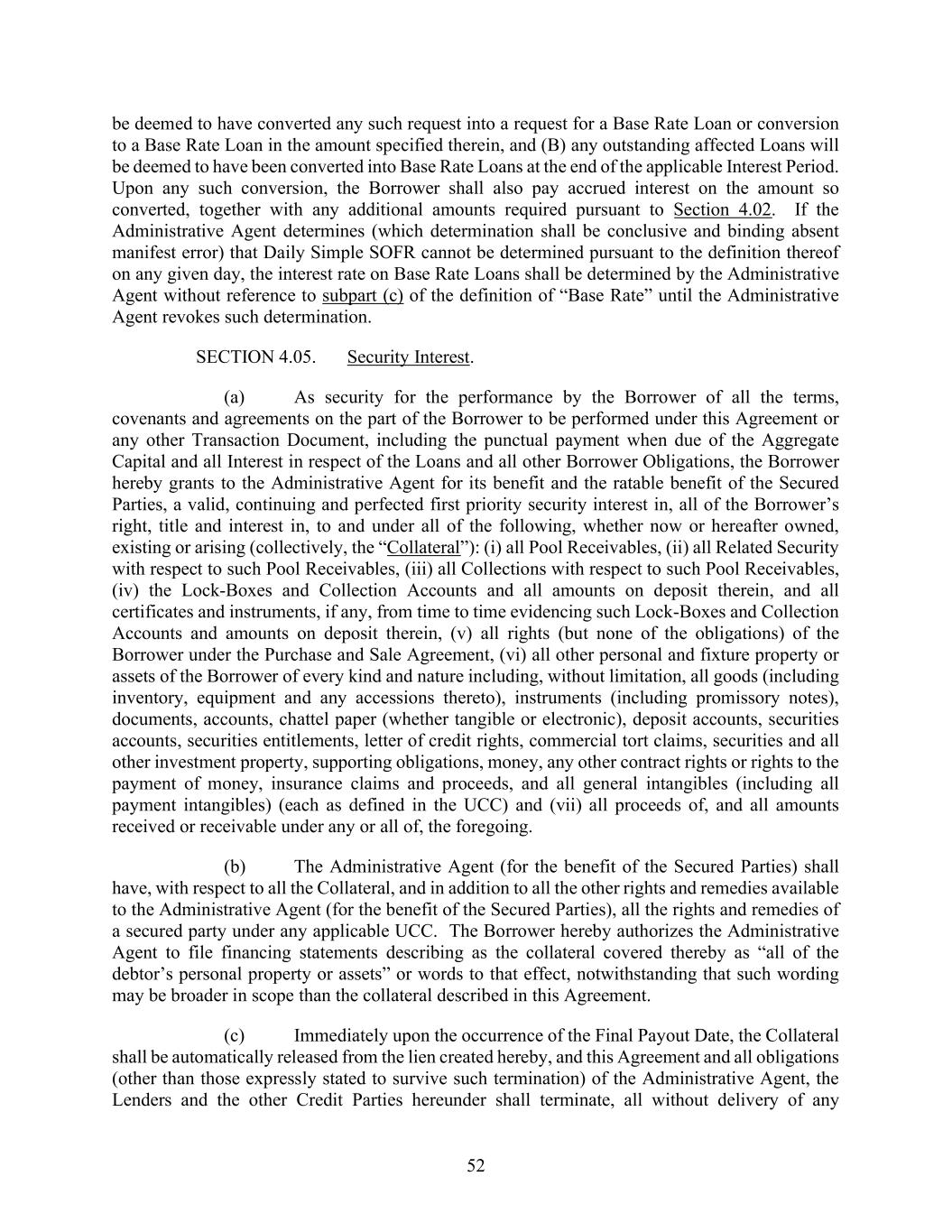 52 be deemed to have converted any such request into a request for a Base Rate Loan or conversion to a Base Rate Loan in the amount specified therein, and (B) any outstanding affected Loans will be deemed to have been converted into Base Rate Loans at the end of the applicable Interest Period. Upon any such conversion, the Borrower shall also pay accrued interest on the amount so converted, together with any additional amounts required pursuant to Section 4.02. If the Administrative Agent determines (which determination shall be conclusive and binding absent manifest error) that Daily Simple SOFR cannot be determined pursuant to the definition thereof on any given day, the interest rate on Base Rate Loans shall be determined by the Administrative Agent without reference to subpart (c) of the definition of “Base Rate” until the Administrative Agent revokes such determination. SECTION 4.05. Security Interest. (a) As security for the performance by the Borrower of all the terms, covenants and agreements on the part of the Borrower to be performed under this Agreement or any other Transaction Document, including the punctual payment when due of the Aggregate Capital and all Interest in respect of the Loans and all other Borrower Obligations, the Borrower hereby grants to the Administrative Agent for its benefit and the ratable benefit of the Secured Parties, a valid, continuing and perfected first priority security interest in, all of the Borrower’s right, title and interest in, to and under all of the following, whether now or hereafter owned, existing or arising (collectively, the “Collateral”): (i) all Pool Receivables, (ii) all Related Security with respect to such Pool Receivables, (iii) all Collections with respect to such Pool Receivables, (iv) the Lock-Boxes and Collection Accounts and all amounts on deposit therein, and all certificates and instruments, if any, from time to time evidencing such Lock-Boxes and Collection Accounts and amounts on deposit therein, (v) all rights (but none of the obligations) of the Borrower under the Purchase and Sale Agreement, (vi) all other personal and fixture property or assets of the Borrower of every kind and nature including, without limitation, all goods (including inventory, equipment and any accessions thereto), instruments (including promissory notes), documents, accounts, chattel paper (whether tangible or electronic), deposit accounts, securities accounts, securities entitlements, letter of credit rights, commercial tort claims, securities and all other investment property, supporting obligations, money, any other contract rights or rights to the payment of money, insurance claims and proceeds, and all general intangibles (including all payment intangibles) (each as defined in the UCC) and (vii) all proceeds of, and all amounts received or receivable under any or all of, the foregoing. (b) The Administrative Agent (for the benefit of the Secured Parties) shall have, with respect to all the Collateral, and in addition to all the other rights and remedies available to the Administrative Agent (for the benefit of the Secured Parties), all the rights and remedies of a secured party under any applicable UCC. The Borrower hereby authorizes the Administrative Agent to file financing statements describing as the collateral covered thereby as “all of the debtor’s personal property or assets” or words to that effect, notwithstanding that such wording may be broader in scope than the collateral described in this Agreement. (c) Immediately upon the occurrence of the Final Payout Date, the Collateral shall be automatically released from the lien created hereby, and this Agreement and all obligations (other than those expressly stated to survive such termination) of the Administrative Agent, the Lenders and the other Credit Parties hereunder shall terminate, all without delivery of any