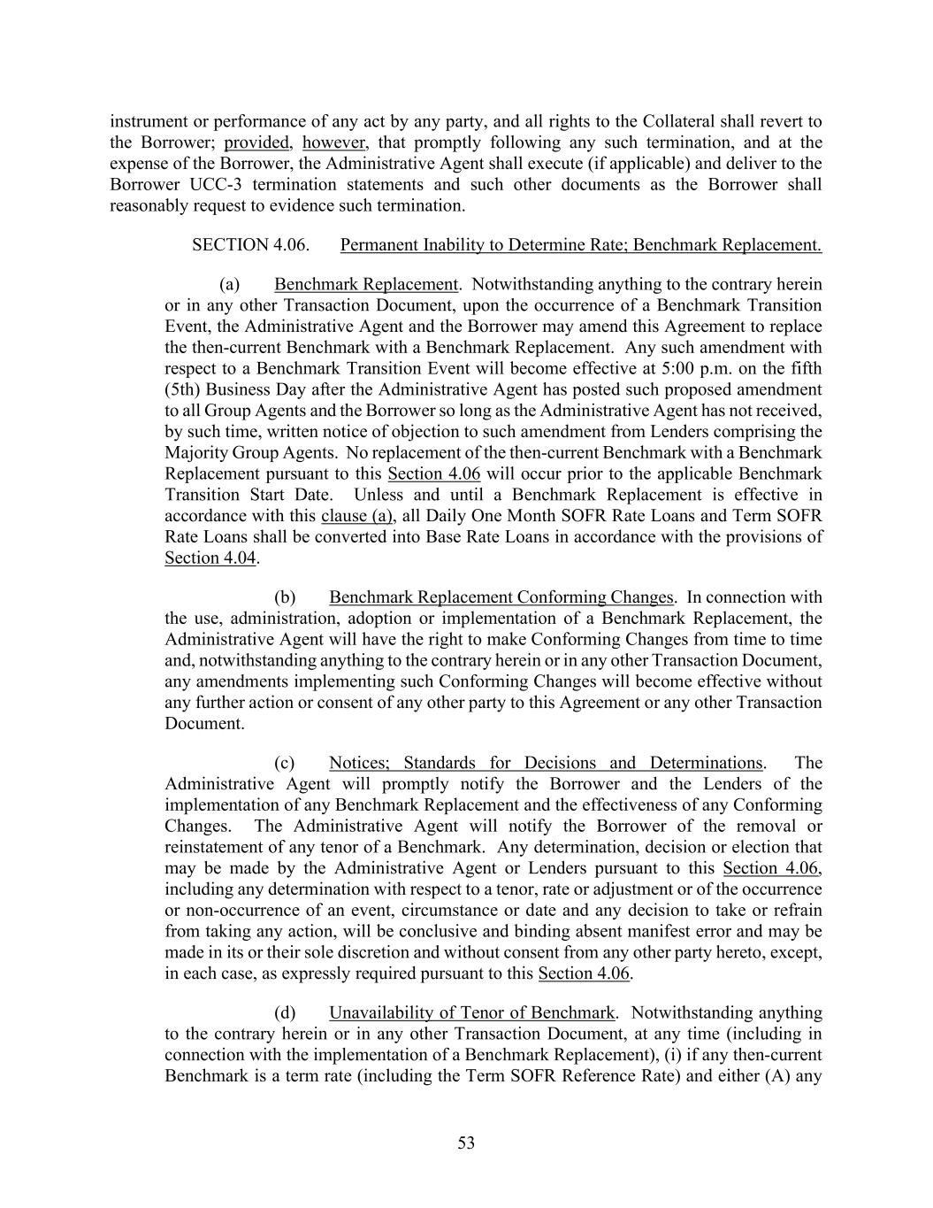 53 instrument or performance of any act by any party, and all rights to the Collateral shall revert to the Borrower; provided, however, that promptly following any such termination, and at the expense of the Borrower, the Administrative Agent shall execute (if applicable) and deliver to the Borrower UCC-3 termination statements and such other documents as the Borrower shall reasonably request to evidence such termination. SECTION 4.06. Permanent Inability to Determine Rate; Benchmark Replacement. (a) Benchmark Replacement. Notwithstanding anything to the contrary herein or in any other Transaction Document, upon the occurrence of a Benchmark Transition Event, the Administrative Agent and the Borrower may amend this Agreement to replace the then-current Benchmark with a Benchmark Replacement. Any such amendment with respect to a Benchmark Transition Event will become effective at 5:00 p.m. on the fifth (5th) Business Day after the Administrative Agent has posted such proposed amendment to all Group Agents and the Borrower so long as the Administrative Agent has not received, by such time, written notice of objection to such amendment from Lenders comprising the Majority Group Agents. No replacement of the then-current Benchmark with a Benchmark Replacement pursuant to this Section 4.06 will occur prior to the applicable Benchmark Transition Start Date. Unless and until a Benchmark Replacement is effective in accordance with this clause (a), all Daily One Month SOFR Rate Loans and Term SOFR Rate Loans shall be converted into Base Rate Loans in accordance with the provisions of Section 4.04. (b) Benchmark Replacement Conforming Changes. In connection with the use, administration, adoption or implementation of a Benchmark Replacement, the Administrative Agent will have the right to make Conforming Changes from time to time and, notwithstanding anything to the contrary herein or in any other Transaction Document, any amendments implementing such Conforming Changes will become effective without any further action or consent of any other party to this Agreement or any other Transaction Document. (c) Notices; Standards for Decisions and Determinations. The Administrative Agent will promptly notify the Borrower and the Lenders of the implementation of any Benchmark Replacement and the effectiveness of any Conforming Changes. The Administrative Agent will notify the Borrower of the removal or reinstatement of any tenor of a Benchmark. Any determination, decision or election that may be made by the Administrative Agent or Lenders pursuant to this Section 4.06, including any determination with respect to a tenor, rate or adjustment or of the occurrence or non-occurrence of an event, circumstance or date and any decision to take or refrain from taking any action, will be conclusive and binding absent manifest error and may be made in its or their sole discretion and without consent from any other party hereto, except, in each case, as expressly required pursuant to this Section 4.06. (d) Unavailability of Tenor of Benchmark. Notwithstanding anything to the contrary herein or in any other Transaction Document, at any time (including in connection with the implementation of a Benchmark Replacement), (i) if any then-current Benchmark is a term rate (including the Term SOFR Reference Rate) and either (A) any