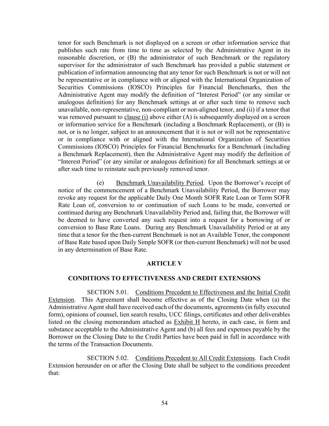 54 tenor for such Benchmark is not displayed on a screen or other information service that publishes such rate from time to time as selected by the Administrative Agent in its reasonable discretion, or (B) the administrator of such Benchmark or the regulatory supervisor for the administrator of such Benchmark has provided a public statement or publication of information announcing that any tenor for such Benchmark is not or will not be representative or in compliance with or aligned with the International Organization of Securities Commissions (IOSCO) Principles for Financial Benchmarks, then the Administrative Agent may modify the definition of “Interest Period” (or any similar or analogous definition) for any Benchmark settings at or after such time to remove such unavailable, non-representative, non-compliant or non-aligned tenor, and (ii) if a tenor that was removed pursuant to clause (i) above either (A) is subsequently displayed on a screen or information service for a Benchmark (including a Benchmark Replacement), or (B) is not, or is no longer, subject to an announcement that it is not or will not be representative or in compliance with or aligned with the International Organization of Securities Commissions (IOSCO) Principles for Financial Benchmarks for a Benchmark (including a Benchmark Replacement), then the Administrative Agent may modify the definition of “Interest Period” (or any similar or analogous definition) for all Benchmark settings at or after such time to reinstate such previously removed tenor. (e) Benchmark Unavailability Period. Upon the Borrower’s receipt of notice of the commencement of a Benchmark Unavailability Period, the Borrower may revoke any request for the applicable Daily One Month SOFR Rate Loan or Term SOFR Rate Loan of, conversion to or continuation of such Loans to be made, converted or continued during any Benchmark Unavailability Period and, failing that, the Borrower will be deemed to have converted any such request into a request for a borrowing of or conversion to Base Rate Loans. During any Benchmark Unavailability Period or at any time that a tenor for the then-current Benchmark is not an Available Tenor, the component of Base Rate based upon Daily Simple SOFR (or then-current Benchmark) will not be used in any determination of Base Rate. ARTICLE V CONDITIONS TO EFFECTIVENESS AND CREDIT EXTENSIONS SECTION 5.01. Conditions Precedent to Effectiveness and the Initial Credit Extension. This Agreement shall become effective as of the Closing Date when (a) the Administrative Agent shall have received each of the documents, agreements (in fully executed form), opinions of counsel, lien search results, UCC filings, certificates and other deliverables listed on the closing memorandum attached as Exhibit H hereto, in each case, in form and substance acceptable to the Administrative Agent and (b) all fees and expenses payable by the Borrower on the Closing Date to the Credit Parties have been paid in full in accordance with the terms of the Transaction Documents. SECTION 5.02. Conditions Precedent to All Credit Extensions. Each Credit Extension hereunder on or after the Closing Date shall be subject to the conditions precedent that: