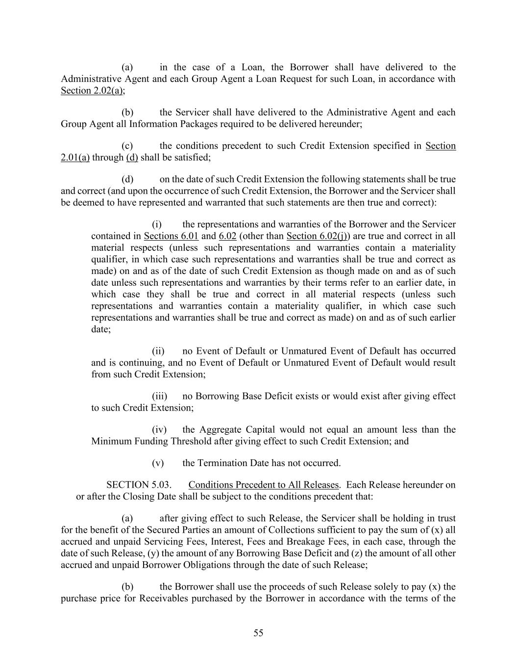 55 (a) in the case of a Loan, the Borrower shall have delivered to the Administrative Agent and each Group Agent a Loan Request for such Loan, in accordance with Section 2.02(a); (b) the Servicer shall have delivered to the Administrative Agent and each Group Agent all Information Packages required to be delivered hereunder; (c) the conditions precedent to such Credit Extension specified in Section 2.01(a) through (d) shall be satisfied; (d) on the date of such Credit Extension the following statements shall be true and correct (and upon the occurrence of such Credit Extension, the Borrower and the Servicer shall be deemed to have represented and warranted that such statements are then true and correct): (i) the representations and warranties of the Borrower and the Servicer contained in Sections 6.01 and 6.02 (other than Section 6.02(j)) are true and correct in all material respects (unless such representations and warranties contain a materiality qualifier, in which case such representations and warranties shall be true and correct as made) on and as of the date of such Credit Extension as though made on and as of such date unless such representations and warranties by their terms refer to an earlier date, in which case they shall be true and correct in all material respects (unless such representations and warranties contain a materiality qualifier, in which case such representations and warranties shall be true and correct as made) on and as of such earlier date; (ii) no Event of Default or Unmatured Event of Default has occurred and is continuing, and no Event of Default or Unmatured Event of Default would result from such Credit Extension; (iii) no Borrowing Base Deficit exists or would exist after giving effect to such Credit Extension; (iv) the Aggregate Capital would not equal an amount less than the Minimum Funding Threshold after giving effect to such Credit Extension; and (v) the Termination Date has not occurred. SECTION 5.03. Conditions Precedent to All Releases. Each Release hereunder on or after the Closing Date shall be subject to the conditions precedent that: (a) after giving effect to such Release, the Servicer shall be holding in trust for the benefit of the Secured Parties an amount of Collections sufficient to pay the sum of (x) all accrued and unpaid Servicing Fees, Interest, Fees and Breakage Fees, in each case, through the date of such Release, (y) the amount of any Borrowing Base Deficit and (z) the amount of all other accrued and unpaid Borrower Obligations through the date of such Release; (b) the Borrower shall use the proceeds of such Release solely to pay (x) the purchase price for Receivables purchased by the Borrower in accordance with the terms of the