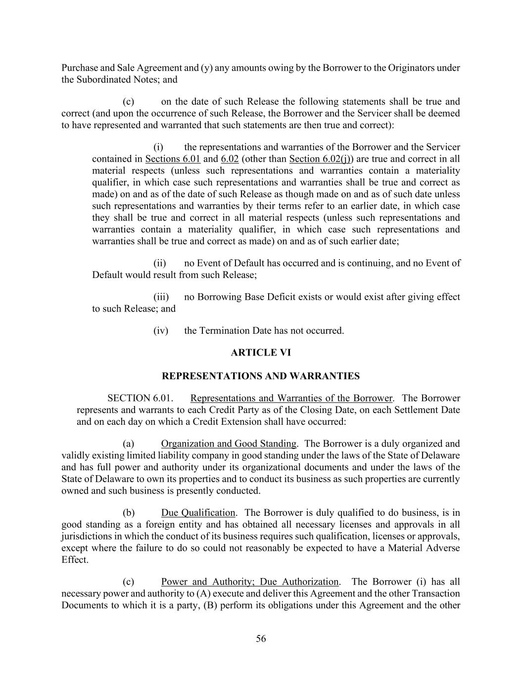 56 Purchase and Sale Agreement and (y) any amounts owing by the Borrower to the Originators under the Subordinated Notes; and (c) on the date of such Release the following statements shall be true and correct (and upon the occurrence of such Release, the Borrower and the Servicer shall be deemed to have represented and warranted that such statements are then true and correct): (i) the representations and warranties of the Borrower and the Servicer contained in Sections 6.01 and 6.02 (other than Section 6.02(j)) are true and correct in all material respects (unless such representations and warranties contain a materiality qualifier, in which case such representations and warranties shall be true and correct as made) on and as of the date of such Release as though made on and as of such date unless such representations and warranties by their terms refer to an earlier date, in which case they shall be true and correct in all material respects (unless such representations and warranties contain a materiality qualifier, in which case such representations and warranties shall be true and correct as made) on and as of such earlier date; (ii) no Event of Default has occurred and is continuing, and no Event of Default would result from such Release; (iii) no Borrowing Base Deficit exists or would exist after giving effect to such Release; and (iv) the Termination Date has not occurred. ARTICLE VI REPRESENTATIONS AND WARRANTIES SECTION 6.01. Representations and Warranties of the Borrower. The Borrower represents and warrants to each Credit Party as of the Closing Date, on each Settlement Date and on each day on which a Credit Extension shall have occurred: (a) Organization and Good Standing. The Borrower is a duly organized and validly existing limited liability company in good standing under the laws of the State of Delaware and has full power and authority under its organizational documents and under the laws of the State of Delaware to own its properties and to conduct its business as such properties are currently owned and such business is presently conducted. (b) Due Qualification. The Borrower is duly qualified to do business, is in good standing as a foreign entity and has obtained all necessary licenses and approvals in all jurisdictions in which the conduct of its business requires such qualification, licenses or approvals, except where the failure to do so could not reasonably be expected to have a Material Adverse Effect. (c) Power and Authority; Due Authorization. The Borrower (i) has all necessary power and authority to (A) execute and deliver this Agreement and the other Transaction Documents to which it is a party, (B) perform its obligations under this Agreement and the other