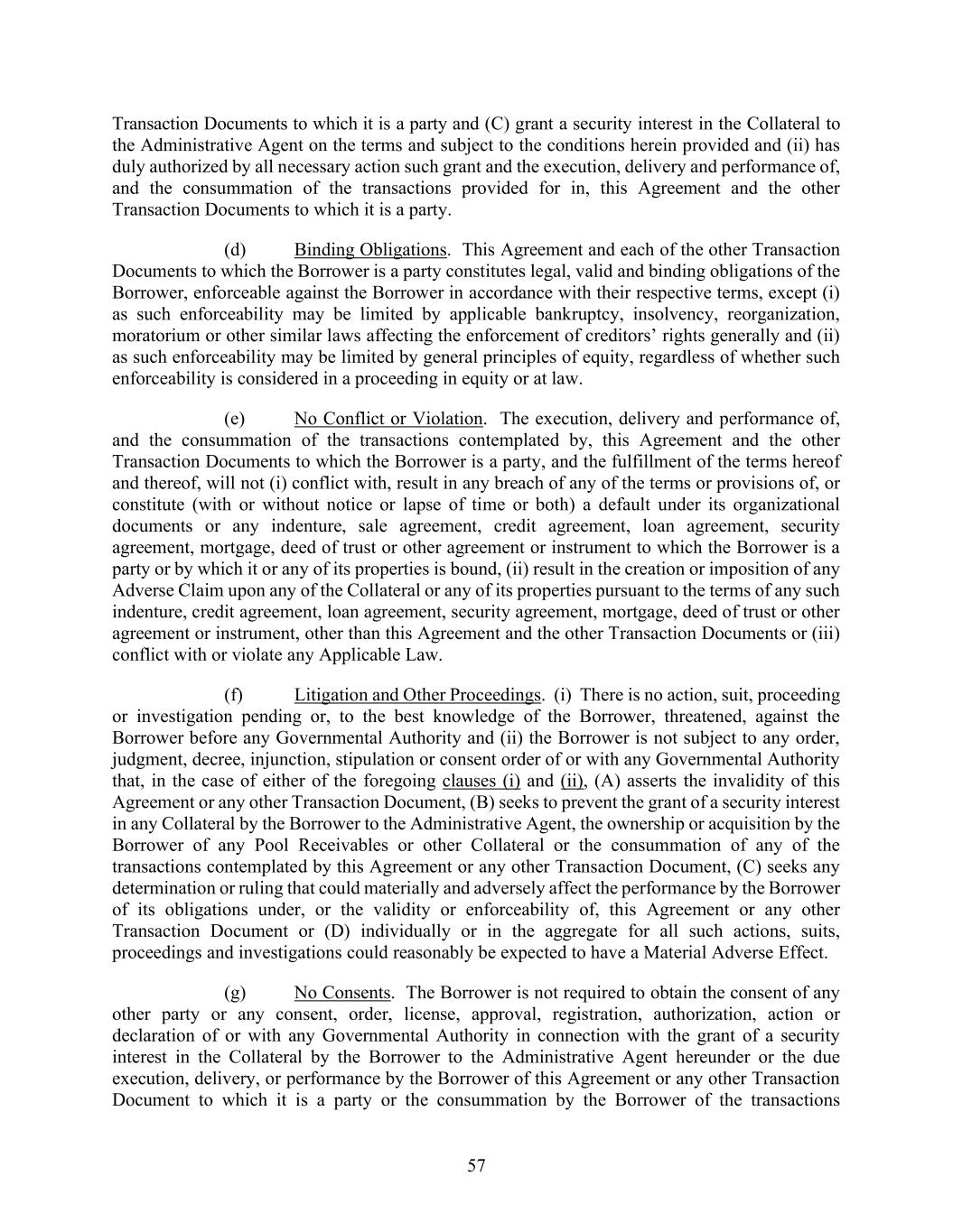 57 Transaction Documents to which it is a party and (C) grant a security interest in the Collateral to the Administrative Agent on the terms and subject to the conditions herein provided and (ii) has duly authorized by all necessary action such grant and the execution, delivery and performance of, and the consummation of the transactions provided for in, this Agreement and the other Transaction Documents to which it is a party. (d) Binding Obligations. This Agreement and each of the other Transaction Documents to which the Borrower is a party constitutes legal, valid and binding obligations of the Borrower, enforceable against the Borrower in accordance with their respective terms, except (i) as such enforceability may be limited by applicable bankruptcy, insolvency, reorganization, moratorium or other similar laws affecting the enforcement of creditors’ rights generally and (ii) as such enforceability may be limited by general principles of equity, regardless of whether such enforceability is considered in a proceeding in equity or at law. (e) No Conflict or Violation. The execution, delivery and performance of, and the consummation of the transactions contemplated by, this Agreement and the other Transaction Documents to which the Borrower is a party, and the fulfillment of the terms hereof and thereof, will not (i) conflict with, result in any breach of any of the terms or provisions of, or constitute (with or without notice or lapse of time or both) a default under its organizational documents or any indenture, sale agreement, credit agreement, loan agreement, security agreement, mortgage, deed of trust or other agreement or instrument to which the Borrower is a party or by which it or any of its properties is bound, (ii) result in the creation or imposition of any Adverse Claim upon any of the Collateral or any of its properties pursuant to the terms of any such indenture, credit agreement, loan agreement, security agreement, mortgage, deed of trust or other agreement or instrument, other than this Agreement and the other Transaction Documents or (iii) conflict with or violate any Applicable Law. (f) Litigation and Other Proceedings. (i) There is no action, suit, proceeding or investigation pending or, to the best knowledge of the Borrower, threatened, against the Borrower before any Governmental Authority and (ii) the Borrower is not subject to any order, judgment, decree, injunction, stipulation or consent order of or with any Governmental Authority that, in the case of either of the foregoing clauses (i) and (ii), (A) asserts the invalidity of this Agreement or any other Transaction Document, (B) seeks to prevent the grant of a security interest in any Collateral by the Borrower to the Administrative Agent, the ownership or acquisition by the Borrower of any Pool Receivables or other Collateral or the consummation of any of the transactions contemplated by this Agreement or any other Transaction Document, (C) seeks any determination or ruling that could materially and adversely affect the performance by the Borrower of its obligations under, or the validity or enforceability of, this Agreement or any other Transaction Document or (D) individually or in the aggregate for all such actions, suits, proceedings and investigations could reasonably be expected to have a Material Adverse Effect. (g) No Consents. The Borrower is not required to obtain the consent of any other party or any consent, order, license, approval, registration, authorization, action or declaration of or with any Governmental Authority in connection with the grant of a security interest in the Collateral by the Borrower to the Administrative Agent hereunder or the due execution, delivery, or performance by the Borrower of this Agreement or any other Transaction Document to which it is a party or the consummation by the Borrower of the transactions