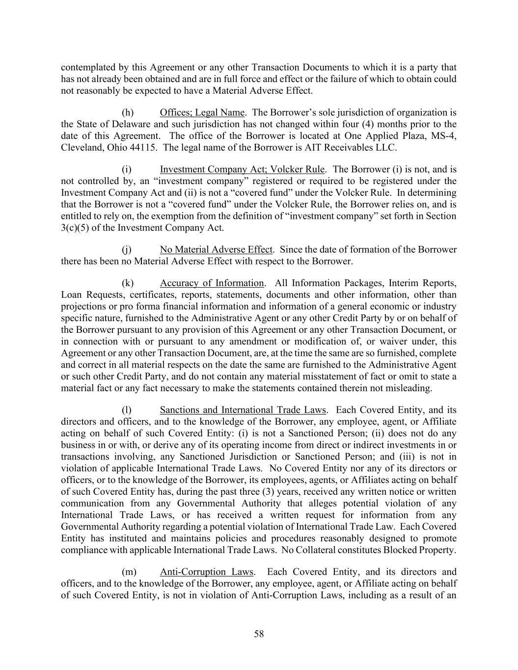 58 contemplated by this Agreement or any other Transaction Documents to which it is a party that has not already been obtained and are in full force and effect or the failure of which to obtain could not reasonably be expected to have a Material Adverse Effect. (h) Offices; Legal Name. The Borrower’s sole jurisdiction of organization is the State of Delaware and such jurisdiction has not changed within four (4) months prior to the date of this Agreement. The office of the Borrower is located at One Applied Plaza, MS-4, Cleveland, Ohio 44115. The legal name of the Borrower is AIT Receivables LLC. (i) Investment Company Act; Volcker Rule. The Borrower (i) is not, and is not controlled by, an “investment company” registered or required to be registered under the Investment Company Act and (ii) is not a “covered fund” under the Volcker Rule. In determining that the Borrower is not a “covered fund” under the Volcker Rule, the Borrower relies on, and is entitled to rely on, the exemption from the definition of “investment company” set forth in Section 3(c)(5) of the Investment Company Act. (j) No Material Adverse Effect. Since the date of formation of the Borrower there has been no Material Adverse Effect with respect to the Borrower. (k) Accuracy of Information. All Information Packages, Interim Reports, Loan Requests, certificates, reports, statements, documents and other information, other than projections or pro forma financial information and information of a general economic or industry specific nature, furnished to the Administrative Agent or any other Credit Party by or on behalf of the Borrower pursuant to any provision of this Agreement or any other Transaction Document, or in connection with or pursuant to any amendment or modification of, or waiver under, this Agreement or any other Transaction Document, are, at the time the same are so furnished, complete and correct in all material respects on the date the same are furnished to the Administrative Agent or such other Credit Party, and do not contain any material misstatement of fact or omit to state a material fact or any fact necessary to make the statements contained therein not misleading. (l) Sanctions and International Trade Laws. Each Covered Entity, and its directors and officers, and to the knowledge of the Borrower, any employee, agent, or Affiliate acting on behalf of such Covered Entity: (i) is not a Sanctioned Person; (ii) does not do any business in or with, or derive any of its operating income from direct or indirect investments in or transactions involving, any Sanctioned Jurisdiction or Sanctioned Person; and (iii) is not in violation of applicable International Trade Laws. No Covered Entity nor any of its directors or officers, or to the knowledge of the Borrower, its employees, agents, or Affiliates acting on behalf of such Covered Entity has, during the past three (3) years, received any written notice or written communication from any Governmental Authority that alleges potential violation of any International Trade Laws, or has received a written request for information from any Governmental Authority regarding a potential violation of International Trade Law. Each Covered Entity has instituted and maintains policies and procedures reasonably designed to promote compliance with applicable International Trade Laws. No Collateral constitutes Blocked Property. (m) Anti-Corruption Laws. Each Covered Entity, and its directors and officers, and to the knowledge of the Borrower, any employee, agent, or Affiliate acting on behalf of such Covered Entity, is not in violation of Anti-Corruption Laws, including as a result of an