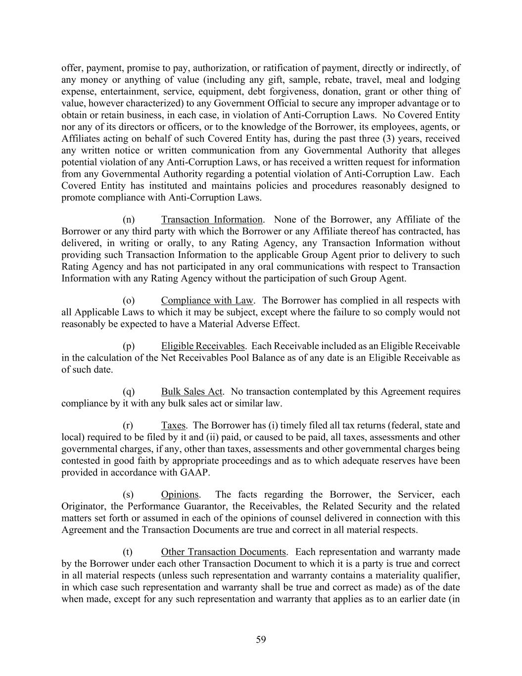 59 offer, payment, promise to pay, authorization, or ratification of payment, directly or indirectly, of any money or anything of value (including any gift, sample, rebate, travel, meal and lodging expense, entertainment, service, equipment, debt forgiveness, donation, grant or other thing of value, however characterized) to any Government Official to secure any improper advantage or to obtain or retain business, in each case, in violation of Anti-Corruption Laws. No Covered Entity nor any of its directors or officers, or to the knowledge of the Borrower, its employees, agents, or Affiliates acting on behalf of such Covered Entity has, during the past three (3) years, received any written notice or written communication from any Governmental Authority that alleges potential violation of any Anti-Corruption Laws, or has received a written request for information from any Governmental Authority regarding a potential violation of Anti-Corruption Law. Each Covered Entity has instituted and maintains policies and procedures reasonably designed to promote compliance with Anti-Corruption Laws. (n) Transaction Information. None of the Borrower, any Affiliate of the Borrower or any third party with which the Borrower or any Affiliate thereof has contracted, has delivered, in writing or orally, to any Rating Agency, any Transaction Information without providing such Transaction Information to the applicable Group Agent prior to delivery to such Rating Agency and has not participated in any oral communications with respect to Transaction Information with any Rating Agency without the participation of such Group Agent. (o) Compliance with Law. The Borrower has complied in all respects with all Applicable Laws to which it may be subject, except where the failure to so comply would not reasonably be expected to have a Material Adverse Effect. (p) Eligible Receivables. Each Receivable included as an Eligible Receivable in the calculation of the Net Receivables Pool Balance as of any date is an Eligible Receivable as of such date. (q) Bulk Sales Act. No transaction contemplated by this Agreement requires compliance by it with any bulk sales act or similar law. (r) Taxes. The Borrower has (i) timely filed all tax returns (federal, state and local) required to be filed by it and (ii) paid, or caused to be paid, all taxes, assessments and other governmental charges, if any, other than taxes, assessments and other governmental charges being contested in good faith by appropriate proceedings and as to which adequate reserves have been provided in accordance with GAAP. (s) Opinions. The facts regarding the Borrower, the Servicer, each Originator, the Performance Guarantor, the Receivables, the Related Security and the related matters set forth or assumed in each of the opinions of counsel delivered in connection with this Agreement and the Transaction Documents are true and correct in all material respects. (t) Other Transaction Documents. Each representation and warranty made by the Borrower under each other Transaction Document to which it is a party is true and correct in all material respects (unless such representation and warranty contains a materiality qualifier, in which case such representation and warranty shall be true and correct as made) as of the date when made, except for any such representation and warranty that applies as to an earlier date (in