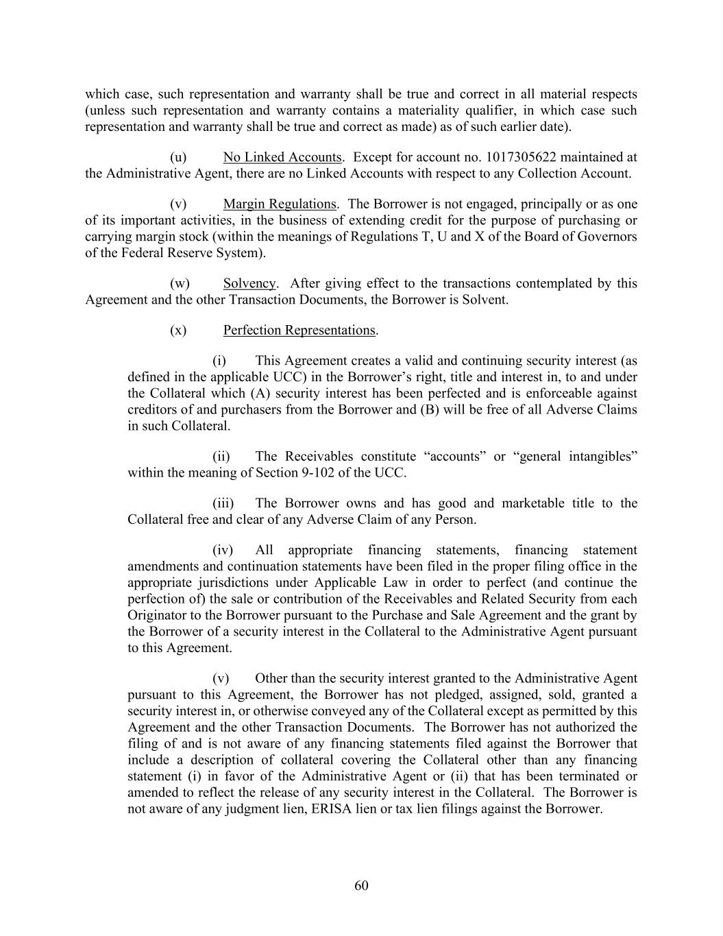 60 which case, such representation and warranty shall be true and correct in all material respects (unless such representation and warranty contains a materiality qualifier, in which case such representation and warranty shall be true and correct as made) as of such earlier date). (u) No Linked Accounts. Except for account no. 1017305622 maintained at the Administrative Agent, there are no Linked Accounts with respect to any Collection Account. (v) Margin Regulations. The Borrower is not engaged, principally or as one of its important activities, in the business of extending credit for the purpose of purchasing or carrying margin stock (within the meanings of Regulations T, U and X of the Board of Governors of the Federal Reserve System). (w) Solvency. After giving effect to the transactions contemplated by this Agreement and the other Transaction Documents, the Borrower is Solvent. (x) Perfection Representations. (i) This Agreement creates a valid and continuing security interest (as defined in the applicable UCC) in the Borrower’s right, title and interest in, to and under the Collateral which (A) security interest has been perfected and is enforceable against creditors of and purchasers from the Borrower and (B) will be free of all Adverse Claims in such Collateral. (ii) The Receivables constitute “accounts” or “general intangibles” within the meaning of Section 9-102 of the UCC. (iii) The Borrower owns and has good and marketable title to the Collateral free and clear of any Adverse Claim of any Person. (iv) All appropriate financing statements, financing statement amendments and continuation statements have been filed in the proper filing office in the appropriate jurisdictions under Applicable Law in order to perfect (and continue the perfection of) the sale or contribution of the Receivables and Related Security from each Originator to the Borrower pursuant to the Purchase and Sale Agreement and the grant by the Borrower of a security interest in the Collateral to the Administrative Agent pursuant to this Agreement. (v) Other than the security interest granted to the Administrative Agent pursuant to this Agreement, the Borrower has not pledged, assigned, sold, granted a security interest in, or otherwise conveyed any of the Collateral except as permitted by this Agreement and the other Transaction Documents. The Borrower has not authorized the filing of and is not aware of any financing statements filed against the Borrower that include a description of collateral covering the Collateral other than any financing statement (i) in favor of the Administrative Agent or (ii) that has been terminated or amended to reflect the release of any security interest in the Collateral. The Borrower is not aware of any judgment lien, ERISA lien or tax lien filings against the Borrower.