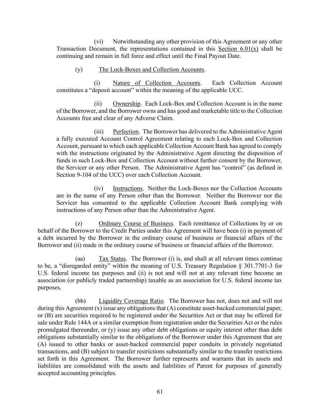 61 (vi) Notwithstanding any other provision of this Agreement or any other Transaction Document, the representations contained in this Section 6.01(x) shall be continuing and remain in full force and effect until the Final Payout Date. (y) The Lock-Boxes and Collection Accounts. (i) Nature of Collection Accounts. Each Collection Account constitutes a “deposit account” within the meaning of the applicable UCC. (ii) Ownership. Each Lock-Box and Collection Account is in the name of the Borrower, and the Borrower owns and has good and marketable title to the Collection Accounts free and clear of any Adverse Claim. (iii) Perfection. The Borrower has delivered to the Administrative Agent a fully executed Account Control Agreement relating to each Lock-Box and Collection Account, pursuant to which each applicable Collection Account Bank has agreed to comply with the instructions originated by the Administrative Agent directing the disposition of funds in such Lock-Box and Collection Account without further consent by the Borrower, the Servicer or any other Person. The Administrative Agent has “control” (as defined in Section 9-104 of the UCC) over each Collection Account. (iv) Instructions. Neither the Lock-Boxes nor the Collection Accounts are in the name of any Person other than the Borrower. Neither the Borrower nor the Servicer has consented to the applicable Collection Account Bank complying with instructions of any Person other than the Administrative Agent. (z) Ordinary Course of Business. Each remittance of Collections by or on behalf of the Borrower to the Credit Parties under this Agreement will have been (i) in payment of a debt incurred by the Borrower in the ordinary course of business or financial affairs of the Borrower and (ii) made in the ordinary course of business or financial affairs of the Borrower. (aa) Tax Status. The Borrower (i) is, and shall at all relevant times continue to be, a “disregarded entity” within the meaning of U.S. Treasury Regulation § 301.7701-3 for U.S. federal income tax purposes and (ii) is not and will not at any relevant time become an association (or publicly traded partnership) taxable as an association for U.S. federal income tax purposes. (bb) Liquidity Coverage Ratio. The Borrower has not, does not and will not during this Agreement (x) issue any obligations that (A) constitute asset-backed commercial paper, or (B) are securities required to be registered under the Securities Act or that may be offered for sale under Rule 144A or a similar exemption from registration under the Securities Act or the rules promulgated thereunder, or (y) issue any other debt obligations or equity interest other than debt obligations substantially similar to the obligations of the Borrower under this Agreement that are (A) issued to other banks or asset-backed commercial paper conduits in privately negotiated transactions, and (B) subject to transfer restrictions substantially similar to the transfer restrictions set forth in this Agreement. The Borrower further represents and warrants that its assets and liabilities are consolidated with the assets and liabilities of Parent for purposes of generally accepted accounting principles.