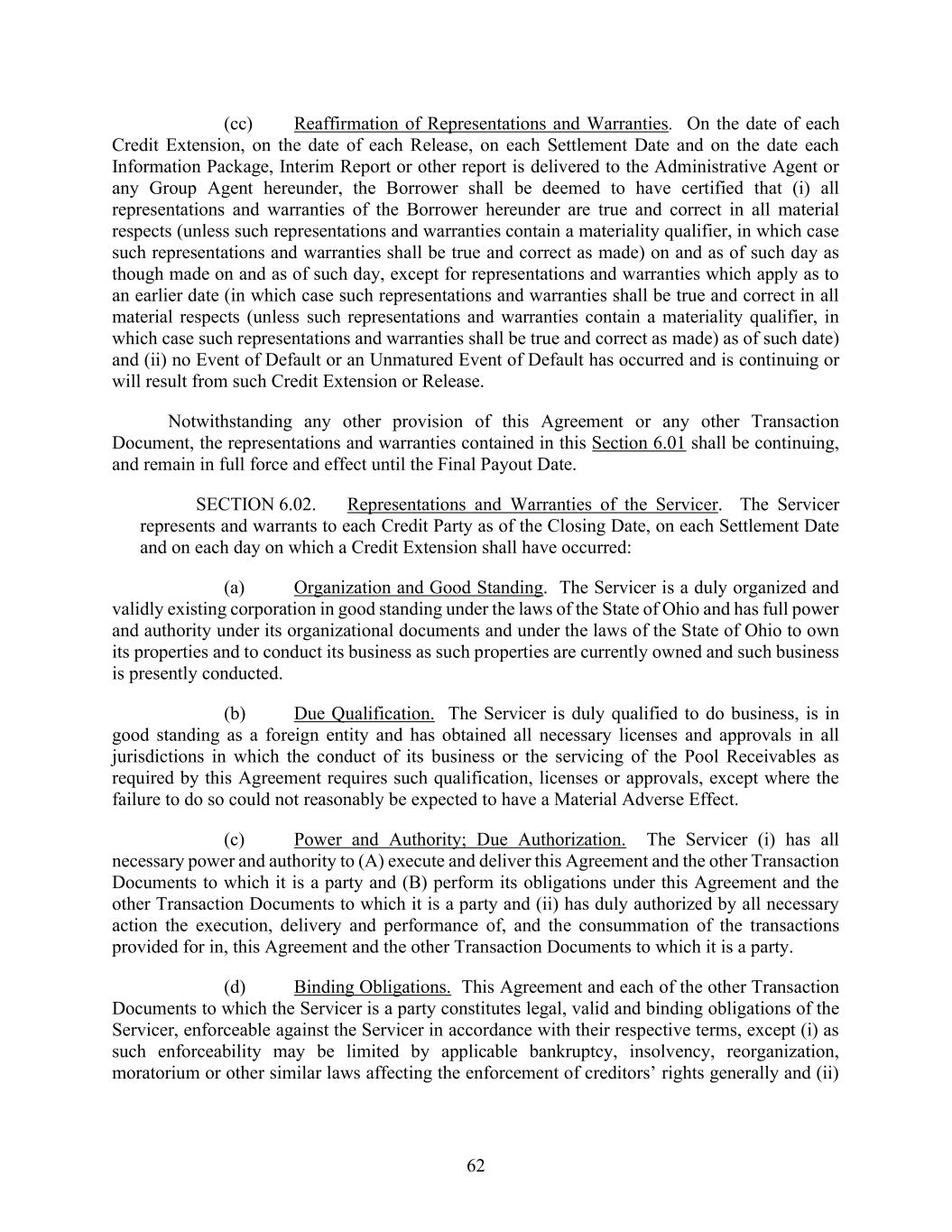 62 (cc) Reaffirmation of Representations and Warranties. On the date of each Credit Extension, on the date of each Release, on each Settlement Date and on the date each Information Package, Interim Report or other report is delivered to the Administrative Agent or any Group Agent hereunder, the Borrower shall be deemed to have certified that (i) all representations and warranties of the Borrower hereunder are true and correct in all material respects (unless such representations and warranties contain a materiality qualifier, in which case such representations and warranties shall be true and correct as made) on and as of such day as though made on and as of such day, except for representations and warranties which apply as to an earlier date (in which case such representations and warranties shall be true and correct in all material respects (unless such representations and warranties contain a materiality qualifier, in which case such representations and warranties shall be true and correct as made) as of such date) and (ii) no Event of Default or an Unmatured Event of Default has occurred and is continuing or will result from such Credit Extension or Release. Notwithstanding any other provision of this Agreement or any other Transaction Document, the representations and warranties contained in this Section 6.01 shall be continuing, and remain in full force and effect until the Final Payout Date. SECTION 6.02. Representations and Warranties of the Servicer. The Servicer represents and warrants to each Credit Party as of the Closing Date, on each Settlement Date and on each day on which a Credit Extension shall have occurred: (a) Organization and Good Standing. The Servicer is a duly organized and validly existing corporation in good standing under the laws of the State of Ohio and has full power and authority under its organizational documents and under the laws of the State of Ohio to own its properties and to conduct its business as such properties are currently owned and such business is presently conducted. (b) Due Qualification. The Servicer is duly qualified to do business, is in good standing as a foreign entity and has obtained all necessary licenses and approvals in all jurisdictions in which the conduct of its business or the servicing of the Pool Receivables as required by this Agreement requires such qualification, licenses or approvals, except where the failure to do so could not reasonably be expected to have a Material Adverse Effect. (c) Power and Authority; Due Authorization. The Servicer (i) has all necessary power and authority to (A) execute and deliver this Agreement and the other Transaction Documents to which it is a party and (B) perform its obligations under this Agreement and the other Transaction Documents to which it is a party and (ii) has duly authorized by all necessary action the execution, delivery and performance of, and the consummation of the transactions provided for in, this Agreement and the other Transaction Documents to which it is a party. (d) Binding Obligations. This Agreement and each of the other Transaction Documents to which the Servicer is a party constitutes legal, valid and binding obligations of the Servicer, enforceable against the Servicer in accordance with their respective terms, except (i) as such enforceability may be limited by applicable bankruptcy, insolvency, reorganization, moratorium or other similar laws affecting the enforcement of creditors’ rights generally and (ii)