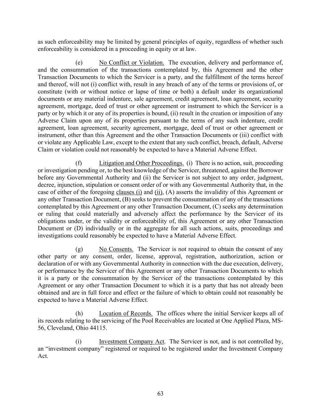 63 as such enforceability may be limited by general principles of equity, regardless of whether such enforceability is considered in a proceeding in equity or at law. (e) No Conflict or Violation. The execution, delivery and performance of, and the consummation of the transactions contemplated by, this Agreement and the other Transaction Documents to which the Servicer is a party, and the fulfillment of the terms hereof and thereof, will not (i) conflict with, result in any breach of any of the terms or provisions of, or constitute (with or without notice or lapse of time or both) a default under its organizational documents or any material indenture, sale agreement, credit agreement, loan agreement, security agreement, mortgage, deed of trust or other agreement or instrument to which the Servicer is a party or by which it or any of its properties is bound, (ii) result in the creation or imposition of any Adverse Claim upon any of its properties pursuant to the terms of any such indenture, credit agreement, loan agreement, security agreement, mortgage, deed of trust or other agreement or instrument, other than this Agreement and the other Transaction Documents or (iii) conflict with or violate any Applicable Law, except to the extent that any such conflict, breach, default, Adverse Claim or violation could not reasonably be expected to have a Material Adverse Effect. (f) Litigation and Other Proceedings. (i) There is no action, suit, proceeding or investigation pending or, to the best knowledge of the Servicer, threatened, against the Borrower before any Governmental Authority and (ii) the Servicer is not subject to any order, judgment, decree, injunction, stipulation or consent order of or with any Governmental Authority that, in the case of either of the foregoing clauses (i) and (ii), (A) asserts the invalidity of this Agreement or any other Transaction Document, (B) seeks to prevent the consummation of any of the transactions contemplated by this Agreement or any other Transaction Document, (C) seeks any determination or ruling that could materially and adversely affect the performance by the Servicer of its obligations under, or the validity or enforceability of, this Agreement or any other Transaction Document or (D) individually or in the aggregate for all such actions, suits, proceedings and investigations could reasonably be expected to have a Material Adverse Effect. (g) No Consents. The Servicer is not required to obtain the consent of any other party or any consent, order, license, approval, registration, authorization, action or declaration of or with any Governmental Authority in connection with the due execution, delivery, or performance by the Servicer of this Agreement or any other Transaction Documents to which it is a party or the consummation by the Servicer of the transactions contemplated by this Agreement or any other Transaction Document to which it is a party that has not already been obtained and are in full force and effect or the failure of which to obtain could not reasonably be expected to have a Material Adverse Effect. (h) Location of Records. The offices where the initial Servicer keeps all of its records relating to the servicing of the Pool Receivables are located at One Applied Plaza, MS- 56, Cleveland, Ohio 44115. (i) Investment Company Act. The Servicer is not, and is not controlled by, an “investment company” registered or required to be registered under the Investment Company Act.