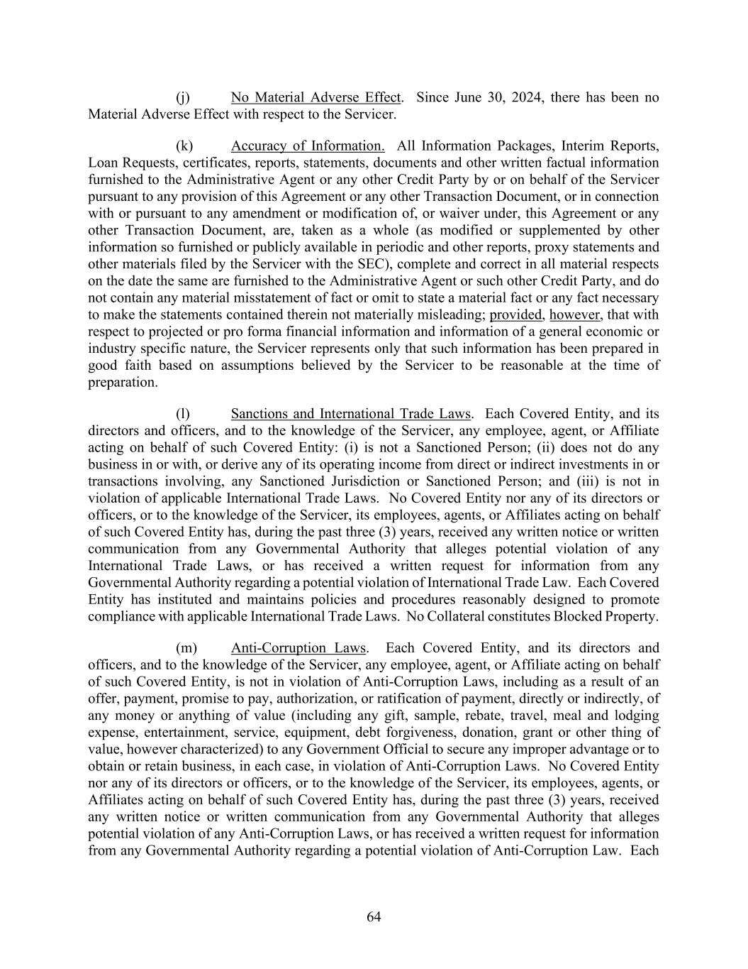 64 (j) No Material Adverse Effect. Since June 30, 2024, there has been no Material Adverse Effect with respect to the Servicer. (k) Accuracy of Information. All Information Packages, Interim Reports, Loan Requests, certificates, reports, statements, documents and other written factual information furnished to the Administrative Agent or any other Credit Party by or on behalf of the Servicer pursuant to any provision of this Agreement or any other Transaction Document, or in connection with or pursuant to any amendment or modification of, or waiver under, this Agreement or any other Transaction Document, are, taken as a whole (as modified or supplemented by other information so furnished or publicly available in periodic and other reports, proxy statements and other materials filed by the Servicer with the SEC), complete and correct in all material respects on the date the same are furnished to the Administrative Agent or such other Credit Party, and do not contain any material misstatement of fact or omit to state a material fact or any fact necessary to make the statements contained therein not materially misleading; provided, however, that with respect to projected or pro forma financial information and information of a general economic or industry specific nature, the Servicer represents only that such information has been prepared in good faith based on assumptions believed by the Servicer to be reasonable at the time of preparation. (l) Sanctions and International Trade Laws. Each Covered Entity, and its directors and officers, and to the knowledge of the Servicer, any employee, agent, or Affiliate acting on behalf of such Covered Entity: (i) is not a Sanctioned Person; (ii) does not do any business in or with, or derive any of its operating income from direct or indirect investments in or transactions involving, any Sanctioned Jurisdiction or Sanctioned Person; and (iii) is not in violation of applicable International Trade Laws. No Covered Entity nor any of its directors or officers, or to the knowledge of the Servicer, its employees, agents, or Affiliates acting on behalf of such Covered Entity has, during the past three (3) years, received any written notice or written communication from any Governmental Authority that alleges potential violation of any International Trade Laws, or has received a written request for information from any Governmental Authority regarding a potential violation of International Trade Law. Each Covered Entity has instituted and maintains policies and procedures reasonably designed to promote compliance with applicable International Trade Laws. No Collateral constitutes Blocked Property. (m) Anti-Corruption Laws. Each Covered Entity, and its directors and officers, and to the knowledge of the Servicer, any employee, agent, or Affiliate acting on behalf of such Covered Entity, is not in violation of Anti-Corruption Laws, including as a result of an offer, payment, promise to pay, authorization, or ratification of payment, directly or indirectly, of any money or anything of value (including any gift, sample, rebate, travel, meal and lodging expense, entertainment, service, equipment, debt forgiveness, donation, grant or other thing of value, however characterized) to any Government Official to secure any improper advantage or to obtain or retain business, in each case, in violation of Anti-Corruption Laws. No Covered Entity nor any of its directors or officers, or to the knowledge of the Servicer, its employees, agents, or Affiliates acting on behalf of such Covered Entity has, during the past three (3) years, received any written notice or written communication from any Governmental Authority that alleges potential violation of any Anti-Corruption Laws, or has received a written request for information from any Governmental Authority regarding a potential violation of Anti-Corruption Law. Each
