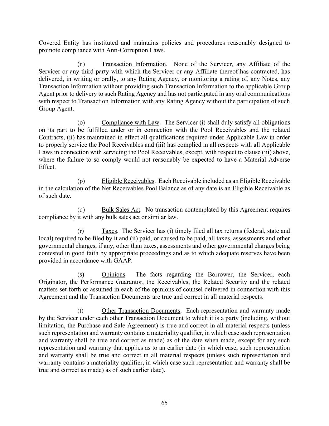 65 Covered Entity has instituted and maintains policies and procedures reasonably designed to promote compliance with Anti-Corruption Laws. (n) Transaction Information. None of the Servicer, any Affiliate of the Servicer or any third party with which the Servicer or any Affiliate thereof has contracted, has delivered, in writing or orally, to any Rating Agency, or monitoring a rating of, any Notes, any Transaction Information without providing such Transaction Information to the applicable Group Agent prior to delivery to such Rating Agency and has not participated in any oral communications with respect to Transaction Information with any Rating Agency without the participation of such Group Agent. (o) Compliance with Law. The Servicer (i) shall duly satisfy all obligations on its part to be fulfilled under or in connection with the Pool Receivables and the related Contracts, (ii) has maintained in effect all qualifications required under Applicable Law in order to properly service the Pool Receivables and (iii) has complied in all respects with all Applicable Laws in connection with servicing the Pool Receivables, except, with respect to clause (iii) above, where the failure to so comply would not reasonably be expected to have a Material Adverse Effect. (p) Eligible Receivables. Each Receivable included as an Eligible Receivable in the calculation of the Net Receivables Pool Balance as of any date is an Eligible Receivable as of such date. (q) Bulk Sales Act. No transaction contemplated by this Agreement requires compliance by it with any bulk sales act or similar law. (r) Taxes. The Servicer has (i) timely filed all tax returns (federal, state and local) required to be filed by it and (ii) paid, or caused to be paid, all taxes, assessments and other governmental charges, if any, other than taxes, assessments and other governmental charges being contested in good faith by appropriate proceedings and as to which adequate reserves have been provided in accordance with GAAP. (s) Opinions. The facts regarding the Borrower, the Servicer, each Originator, the Performance Guarantor, the Receivables, the Related Security and the related matters set forth or assumed in each of the opinions of counsel delivered in connection with this Agreement and the Transaction Documents are true and correct in all material respects. (t) Other Transaction Documents. Each representation and warranty made by the Servicer under each other Transaction Document to which it is a party (including, without limitation, the Purchase and Sale Agreement) is true and correct in all material respects (unless such representation and warranty contains a materiality qualifier, in which case such representation and warranty shall be true and correct as made) as of the date when made, except for any such representation and warranty that applies as to an earlier date (in which case, such representation and warranty shall be true and correct in all material respects (unless such representation and warranty contains a materiality qualifier, in which case such representation and warranty shall be true and correct as made) as of such earlier date).