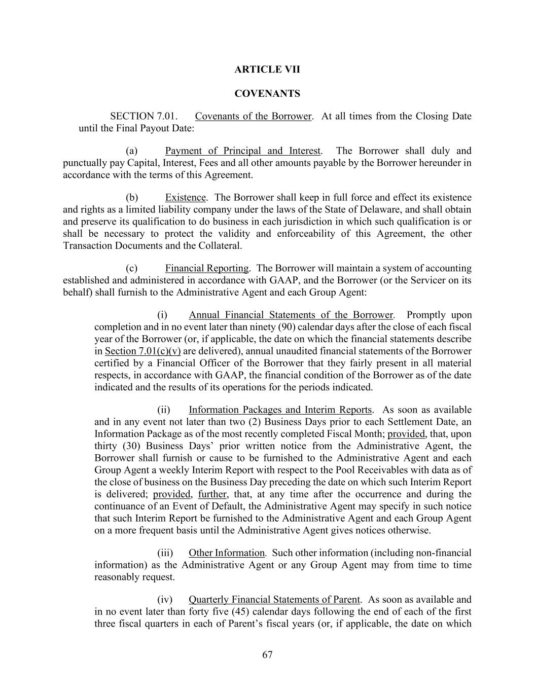 67 ARTICLE VII COVENANTS SECTION 7.01. Covenants of the Borrower. At all times from the Closing Date until the Final Payout Date: (a) Payment of Principal and Interest. The Borrower shall duly and punctually pay Capital, Interest, Fees and all other amounts payable by the Borrower hereunder in accordance with the terms of this Agreement. (b) Existence. The Borrower shall keep in full force and effect its existence and rights as a limited liability company under the laws of the State of Delaware, and shall obtain and preserve its qualification to do business in each jurisdiction in which such qualification is or shall be necessary to protect the validity and enforceability of this Agreement, the other Transaction Documents and the Collateral. (c) Financial Reporting. The Borrower will maintain a system of accounting established and administered in accordance with GAAP, and the Borrower (or the Servicer on its behalf) shall furnish to the Administrative Agent and each Group Agent: (i) Annual Financial Statements of the Borrower. Promptly upon completion and in no event later than ninety (90) calendar days after the close of each fiscal year of the Borrower (or, if applicable, the date on which the financial statements describe in Section 7.01(c)(v) are delivered), annual unaudited financial statements of the Borrower certified by a Financial Officer of the Borrower that they fairly present in all material respects, in accordance with GAAP, the financial condition of the Borrower as of the date indicated and the results of its operations for the periods indicated. (ii) Information Packages and Interim Reports. As soon as available and in any event not later than two (2) Business Days prior to each Settlement Date, an Information Package as of the most recently completed Fiscal Month; provided, that, upon thirty (30) Business Days’ prior written notice from the Administrative Agent, the Borrower shall furnish or cause to be furnished to the Administrative Agent and each Group Agent a weekly Interim Report with respect to the Pool Receivables with data as of the close of business on the Business Day preceding the date on which such Interim Report is delivered; provided, further, that, at any time after the occurrence and during the continuance of an Event of Default, the Administrative Agent may specify in such notice that such Interim Report be furnished to the Administrative Agent and each Group Agent on a more frequent basis until the Administrative Agent gives notices otherwise. (iii) Other Information. Such other information (including non-financial information) as the Administrative Agent or any Group Agent may from time to time reasonably request. (iv) Quarterly Financial Statements of Parent. As soon as available and in no event later than forty five (45) calendar days following the end of each of the first three fiscal quarters in each of Parent’s fiscal years (or, if applicable, the date on which