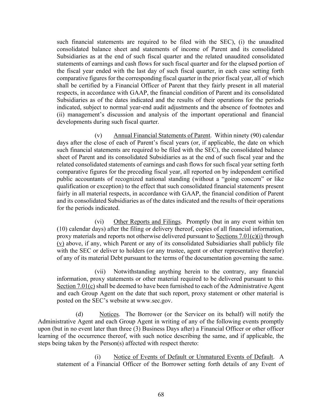 68 such financial statements are required to be filed with the SEC), (i) the unaudited consolidated balance sheet and statements of income of Parent and its consolidated Subsidiaries as at the end of such fiscal quarter and the related unaudited consolidated statements of earnings and cash flows for such fiscal quarter and for the elapsed portion of the fiscal year ended with the last day of such fiscal quarter, in each case setting forth comparative figures for the corresponding fiscal quarter in the prior fiscal year, all of which shall be certified by a Financial Officer of Parent that they fairly present in all material respects, in accordance with GAAP, the financial condition of Parent and its consolidated Subsidiaries as of the dates indicated and the results of their operations for the periods indicated, subject to normal year-end audit adjustments and the absence of footnotes and (ii) management’s discussion and analysis of the important operational and financial developments during such fiscal quarter. (v) Annual Financial Statements of Parent. Within ninety (90) calendar days after the close of each of Parent’s fiscal years (or, if applicable, the date on which such financial statements are required to be filed with the SEC), the consolidated balance sheet of Parent and its consolidated Subsidiaries as at the end of such fiscal year and the related consolidated statements of earnings and cash flows for such fiscal year setting forth comparative figures for the preceding fiscal year, all reported on by independent certified public accountants of recognized national standing (without a “going concern” or like qualification or exception) to the effect that such consolidated financial statements present fairly in all material respects, in accordance with GAAP, the financial condition of Parent and its consolidated Subsidiaries as of the dates indicated and the results of their operations for the periods indicated. (vi) Other Reports and Filings. Promptly (but in any event within ten (10) calendar days) after the filing or delivery thereof, copies of all financial information, proxy materials and reports not otherwise delivered pursuant to Sections 7.01(c)(i) through (v) above, if any, which Parent or any of its consolidated Subsidiaries shall publicly file with the SEC or deliver to holders (or any trustee, agent or other representative therefor) of any of its material Debt pursuant to the terms of the documentation governing the same. (vii) Notwithstanding anything herein to the contrary, any financial information, proxy statements or other material required to be delivered pursuant to this Section 7.01(c) shall be deemed to have been furnished to each of the Administrative Agent and each Group Agent on the date that such report, proxy statement or other material is posted on the SEC’s website at www.sec.gov. (d) Notices. The Borrower (or the Servicer on its behalf) will notify the Administrative Agent and each Group Agent in writing of any of the following events promptly upon (but in no event later than three (3) Business Days after) a Financial Officer or other officer learning of the occurrence thereof, with such notice describing the same, and if applicable, the steps being taken by the Person(s) affected with respect thereto: (i) Notice of Events of Default or Unmatured Events of Default. A statement of a Financial Officer of the Borrower setting forth details of any Event of