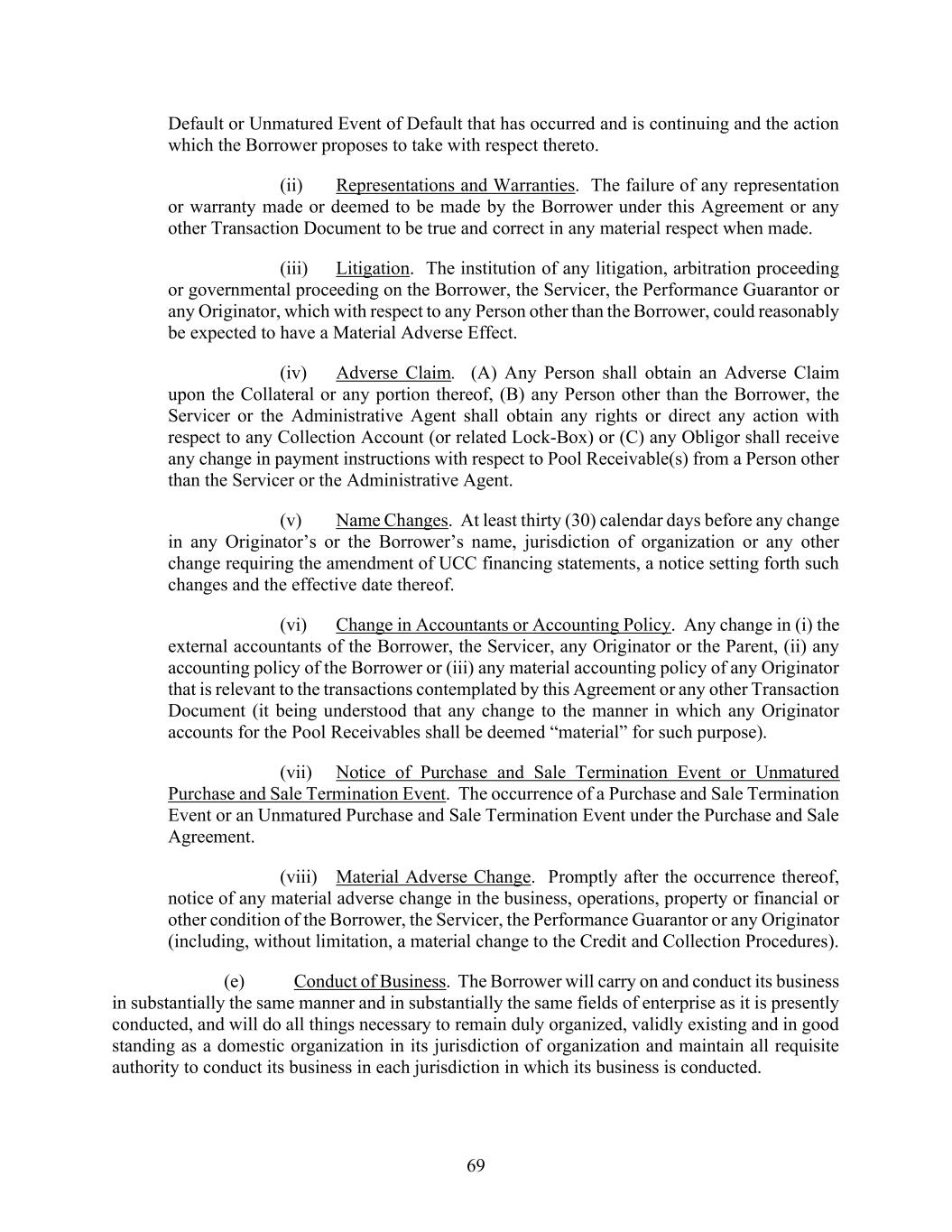 69 Default or Unmatured Event of Default that has occurred and is continuing and the action which the Borrower proposes to take with respect thereto. (ii) Representations and Warranties. The failure of any representation or warranty made or deemed to be made by the Borrower under this Agreement or any other Transaction Document to be true and correct in any material respect when made. (iii) Litigation. The institution of any litigation, arbitration proceeding or governmental proceeding on the Borrower, the Servicer, the Performance Guarantor or any Originator, which with respect to any Person other than the Borrower, could reasonably be expected to have a Material Adverse Effect. (iv) Adverse Claim. (A) Any Person shall obtain an Adverse Claim upon the Collateral or any portion thereof, (B) any Person other than the Borrower, the Servicer or the Administrative Agent shall obtain any rights or direct any action with respect to any Collection Account (or related Lock-Box) or (C) any Obligor shall receive any change in payment instructions with respect to Pool Receivable(s) from a Person other than the Servicer or the Administrative Agent. (v) Name Changes. At least thirty (30) calendar days before any change in any Originator’s or the Borrower’s name, jurisdiction of organization or any other change requiring the amendment of UCC financing statements, a notice setting forth such changes and the effective date thereof. (vi) Change in Accountants or Accounting Policy. Any change in (i) the external accountants of the Borrower, the Servicer, any Originator or the Parent, (ii) any accounting policy of the Borrower or (iii) any material accounting policy of any Originator that is relevant to the transactions contemplated by this Agreement or any other Transaction Document (it being understood that any change to the manner in which any Originator accounts for the Pool Receivables shall be deemed “material” for such purpose). (vii) Notice of Purchase and Sale Termination Event or Unmatured Purchase and Sale Termination Event. The occurrence of a Purchase and Sale Termination Event or an Unmatured Purchase and Sale Termination Event under the Purchase and Sale Agreement. (viii) Material Adverse Change. Promptly after the occurrence thereof, notice of any material adverse change in the business, operations, property or financial or other condition of the Borrower, the Servicer, the Performance Guarantor or any Originator (including, without limitation, a material change to the Credit and Collection Procedures). (e) Conduct of Business. The Borrower will carry on and conduct its business in substantially the same manner and in substantially the same fields of enterprise as it is presently conducted, and will do all things necessary to remain duly organized, validly existing and in good standing as a domestic organization in its jurisdiction of organization and maintain all requisite authority to conduct its business in each jurisdiction in which its business is conducted.