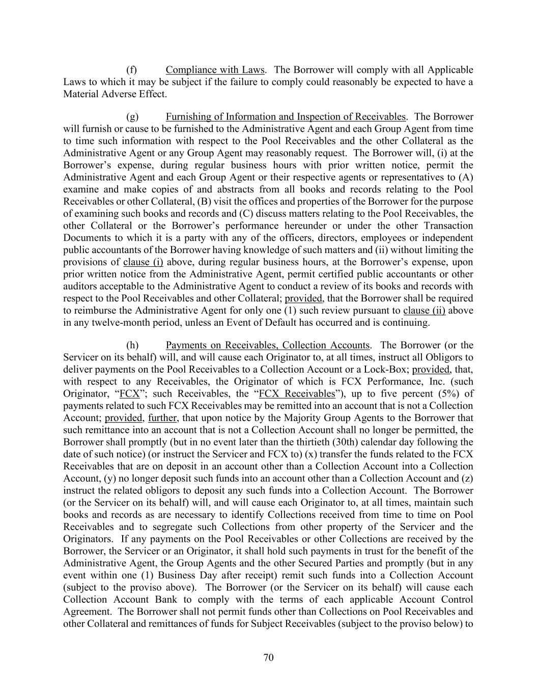 70 (f) Compliance with Laws. The Borrower will comply with all Applicable Laws to which it may be subject if the failure to comply could reasonably be expected to have a Material Adverse Effect. (g) Furnishing of Information and Inspection of Receivables. The Borrower will furnish or cause to be furnished to the Administrative Agent and each Group Agent from time to time such information with respect to the Pool Receivables and the other Collateral as the Administrative Agent or any Group Agent may reasonably request. The Borrower will, (i) at the Borrower’s expense, during regular business hours with prior written notice, permit the Administrative Agent and each Group Agent or their respective agents or representatives to (A) examine and make copies of and abstracts from all books and records relating to the Pool Receivables or other Collateral, (B) visit the offices and properties of the Borrower for the purpose of examining such books and records and (C) discuss matters relating to the Pool Receivables, the other Collateral or the Borrower’s performance hereunder or under the other Transaction Documents to which it is a party with any of the officers, directors, employees or independent public accountants of the Borrower having knowledge of such matters and (ii) without limiting the provisions of clause (i) above, during regular business hours, at the Borrower’s expense, upon prior written notice from the Administrative Agent, permit certified public accountants or other auditors acceptable to the Administrative Agent to conduct a review of its books and records with respect to the Pool Receivables and other Collateral; provided, that the Borrower shall be required to reimburse the Administrative Agent for only one (1) such review pursuant to clause (ii) above in any twelve-month period, unless an Event of Default has occurred and is continuing. (h) Payments on Receivables, Collection Accounts. The Borrower (or the Servicer on its behalf) will, and will cause each Originator to, at all times, instruct all Obligors to deliver payments on the Pool Receivables to a Collection Account or a Lock-Box; provided, that, with respect to any Receivables, the Originator of which is FCX Performance, Inc. (such Originator, “FCX”; such Receivables, the “FCX Receivables”), up to five percent (5%) of payments related to such FCX Receivables may be remitted into an account that is not a Collection Account; provided, further, that upon notice by the Majority Group Agents to the Borrower that such remittance into an account that is not a Collection Account shall no longer be permitted, the Borrower shall promptly (but in no event later than the thirtieth (30th) calendar day following the date of such notice) (or instruct the Servicer and FCX to) (x) transfer the funds related to the FCX Receivables that are on deposit in an account other than a Collection Account into a Collection Account, (y) no longer deposit such funds into an account other than a Collection Account and (z) instruct the related obligors to deposit any such funds into a Collection Account. The Borrower (or the Servicer on its behalf) will, and will cause each Originator to, at all times, maintain such books and records as are necessary to identify Collections received from time to time on Pool Receivables and to segregate such Collections from other property of the Servicer and the Originators. If any payments on the Pool Receivables or other Collections are received by the Borrower, the Servicer or an Originator, it shall hold such payments in trust for the benefit of the Administrative Agent, the Group Agents and the other Secured Parties and promptly (but in any event within one (1) Business Day after receipt) remit such funds into a Collection Account (subject to the proviso above). The Borrower (or the Servicer on its behalf) will cause each Collection Account Bank to comply with the terms of each applicable Account Control Agreement. The Borrower shall not permit funds other than Collections on Pool Receivables and other Collateral and remittances of funds for Subject Receivables (subject to the proviso below) to
