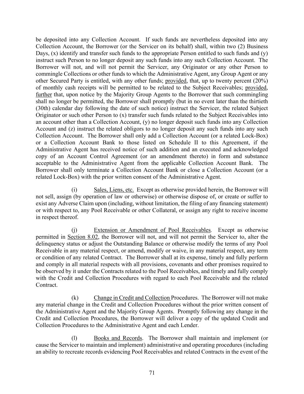 71 be deposited into any Collection Account. If such funds are nevertheless deposited into any Collection Account, the Borrower (or the Servicer on its behalf) shall, within two (2) Business Days, (x) identify and transfer such funds to the appropriate Person entitled to such funds and (y) instruct such Person to no longer deposit any such funds into any such Collection Account. The Borrower will not, and will not permit the Servicer, any Originator or any other Person to commingle Collections or other funds to which the Administrative Agent, any Group Agent or any other Secured Party is entitled, with any other funds; provided, that, up to twenty percent (20%) of monthly cash receipts will be permitted to be related to the Subject Receivables; provided, further that, upon notice by the Majority Group Agents to the Borrower that such commingling shall no longer be permitted, the Borrower shall promptly (but in no event later than the thirtieth (30th) calendar day following the date of such notice) instruct the Servicer, the related Subject Originator or such other Person to (x) transfer such funds related to the Subject Receivables into an account other than a Collection Account, (y) no longer deposit such funds into any Collection Account and (z) instruct the related obligors to no longer deposit any such funds into any such Collection Account. The Borrower shall only add a Collection Account (or a related Lock-Box) or a Collection Account Bank to those listed on Schedule II to this Agreement, if the Administrative Agent has received notice of such addition and an executed and acknowledged copy of an Account Control Agreement (or an amendment thereto) in form and substance acceptable to the Administrative Agent from the applicable Collection Account Bank. The Borrower shall only terminate a Collection Account Bank or close a Collection Account (or a related Lock-Box) with the prior written consent of the Administrative Agent. (i) Sales, Liens, etc. Except as otherwise provided herein, the Borrower will not sell, assign (by operation of law or otherwise) or otherwise dispose of, or create or suffer to exist any Adverse Claim upon (including, without limitation, the filing of any financing statement) or with respect to, any Pool Receivable or other Collateral, or assign any right to receive income in respect thereof. (j) Extension or Amendment of Pool Receivables. Except as otherwise permitted in Section 8.02, the Borrower will not, and will not permit the Servicer to, alter the delinquency status or adjust the Outstanding Balance or otherwise modify the terms of any Pool Receivable in any material respect, or amend, modify or waive, in any material respect, any term or condition of any related Contract. The Borrower shall at its expense, timely and fully perform and comply in all material respects with all provisions, covenants and other promises required to be observed by it under the Contracts related to the Pool Receivables, and timely and fully comply with the Credit and Collection Procedures with regard to each Pool Receivable and the related Contract. (k) Change in Credit and Collection Procedures. The Borrower will not make any material change in the Credit and Collection Procedures without the prior written consent of the Administrative Agent and the Majority Group Agents. Promptly following any change in the Credit and Collection Procedures, the Borrower will deliver a copy of the updated Credit and Collection Procedures to the Administrative Agent and each Lender. (l) Books and Records. The Borrower shall maintain and implement (or cause the Servicer to maintain and implement) administrative and operating procedures (including an ability to recreate records evidencing Pool Receivables and related Contracts in the event of the