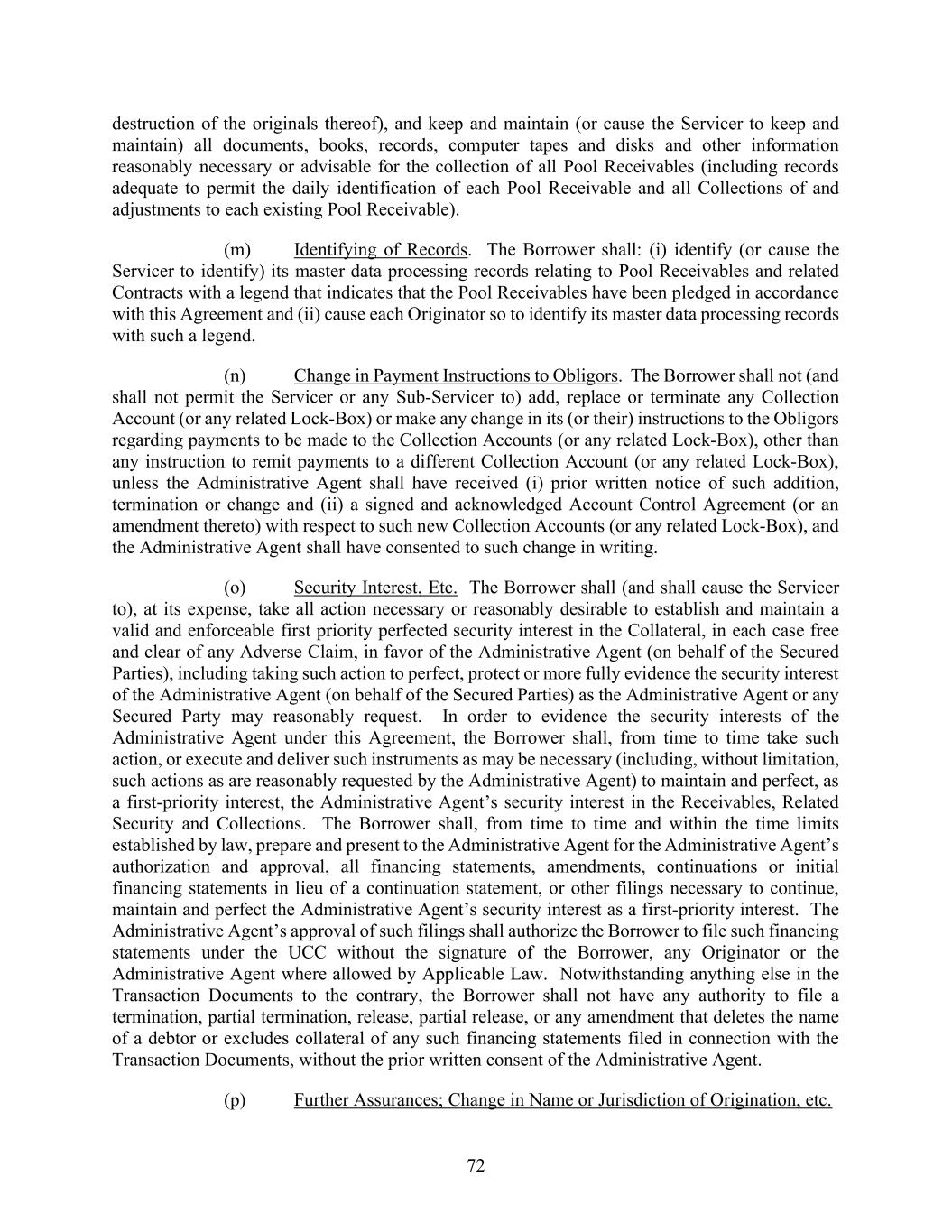 72 destruction of the originals thereof), and keep and maintain (or cause the Servicer to keep and maintain) all documents, books, records, computer tapes and disks and other information reasonably necessary or advisable for the collection of all Pool Receivables (including records adequate to permit the daily identification of each Pool Receivable and all Collections of and adjustments to each existing Pool Receivable). (m) Identifying of Records. The Borrower shall: (i) identify (or cause the Servicer to identify) its master data processing records relating to Pool Receivables and related Contracts with a legend that indicates that the Pool Receivables have been pledged in accordance with this Agreement and (ii) cause each Originator so to identify its master data processing records with such a legend. (n) Change in Payment Instructions to Obligors. The Borrower shall not (and shall not permit the Servicer or any Sub-Servicer to) add, replace or terminate any Collection Account (or any related Lock-Box) or make any change in its (or their) instructions to the Obligors regarding payments to be made to the Collection Accounts (or any related Lock-Box), other than any instruction to remit payments to a different Collection Account (or any related Lock-Box), unless the Administrative Agent shall have received (i) prior written notice of such addition, termination or change and (ii) a signed and acknowledged Account Control Agreement (or an amendment thereto) with respect to such new Collection Accounts (or any related Lock-Box), and the Administrative Agent shall have consented to such change in writing. (o) Security Interest, Etc. The Borrower shall (and shall cause the Servicer to), at its expense, take all action necessary or reasonably desirable to establish and maintain a valid and enforceable first priority perfected security interest in the Collateral, in each case free and clear of any Adverse Claim, in favor of the Administrative Agent (on behalf of the Secured Parties), including taking such action to perfect, protect or more fully evidence the security interest of the Administrative Agent (on behalf of the Secured Parties) as the Administrative Agent or any Secured Party may reasonably request. In order to evidence the security interests of the Administrative Agent under this Agreement, the Borrower shall, from time to time take such action, or execute and deliver such instruments as may be necessary (including, without limitation, such actions as are reasonably requested by the Administrative Agent) to maintain and perfect, as a first-priority interest, the Administrative Agent’s security interest in the Receivables, Related Security and Collections. The Borrower shall, from time to time and within the time limits established by law, prepare and present to the Administrative Agent for the Administrative Agent’s authorization and approval, all financing statements, amendments, continuations or initial financing statements in lieu of a continuation statement, or other filings necessary to continue, maintain and perfect the Administrative Agent’s security interest as a first-priority interest. The Administrative Agent’s approval of such filings shall authorize the Borrower to file such financing statements under the UCC without the signature of the Borrower, any Originator or the Administrative Agent where allowed by Applicable Law. Notwithstanding anything else in the Transaction Documents to the contrary, the Borrower shall not have any authority to file a termination, partial termination, release, partial release, or any amendment that deletes the name of a debtor or excludes collateral of any such financing statements filed in connection with the Transaction Documents, without the prior written consent of the Administrative Agent. (p) Further Assurances; Change in Name or Jurisdiction of Origination, etc.