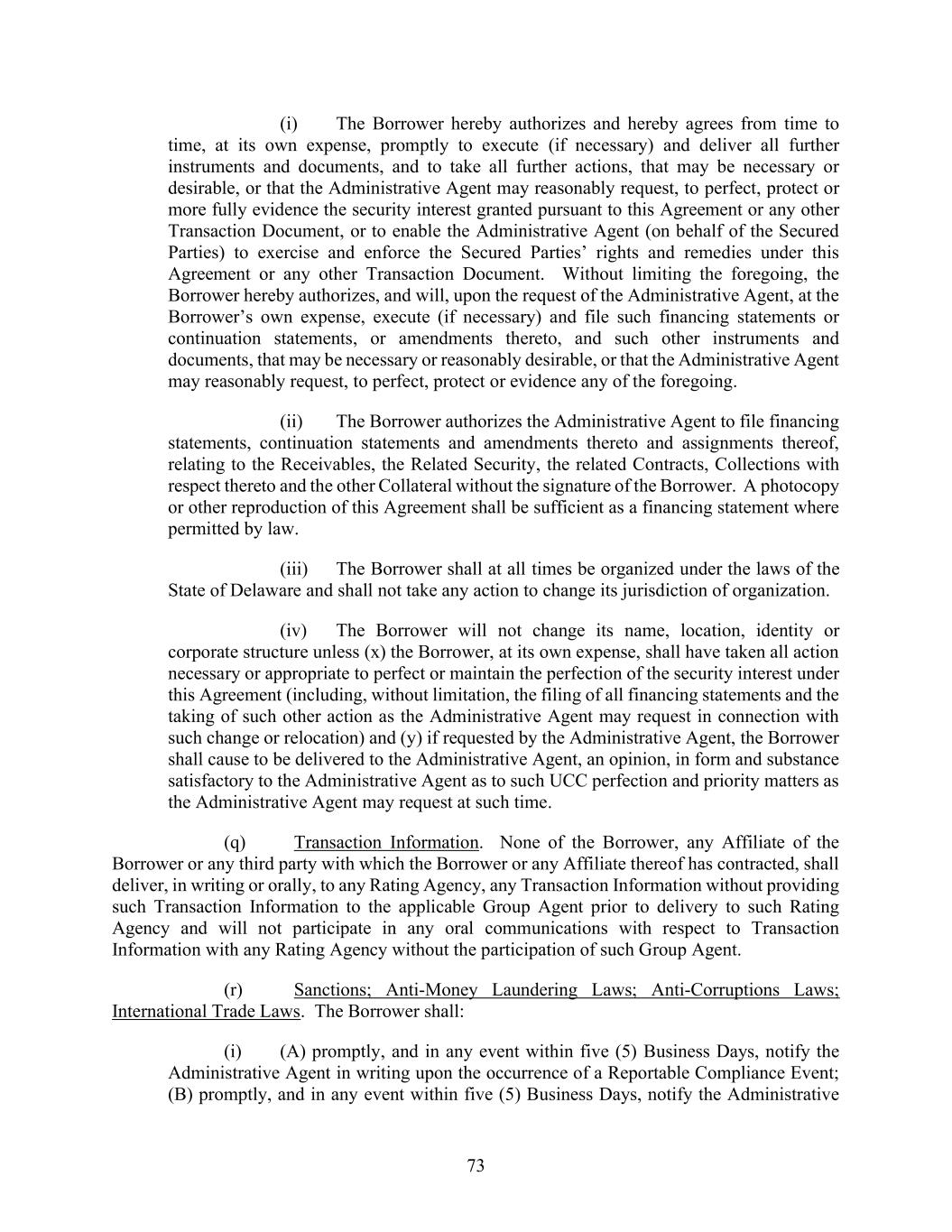 73 (i) The Borrower hereby authorizes and hereby agrees from time to time, at its own expense, promptly to execute (if necessary) and deliver all further instruments and documents, and to take all further actions, that may be necessary or desirable, or that the Administrative Agent may reasonably request, to perfect, protect or more fully evidence the security interest granted pursuant to this Agreement or any other Transaction Document, or to enable the Administrative Agent (on behalf of the Secured Parties) to exercise and enforce the Secured Parties’ rights and remedies under this Agreement or any other Transaction Document. Without limiting the foregoing, the Borrower hereby authorizes, and will, upon the request of the Administrative Agent, at the Borrower’s own expense, execute (if necessary) and file such financing statements or continuation statements, or amendments thereto, and such other instruments and documents, that may be necessary or reasonably desirable, or that the Administrative Agent may reasonably request, to perfect, protect or evidence any of the foregoing. (ii) The Borrower authorizes the Administrative Agent to file financing statements, continuation statements and amendments thereto and assignments thereof, relating to the Receivables, the Related Security, the related Contracts, Collections with respect thereto and the other Collateral without the signature of the Borrower. A photocopy or other reproduction of this Agreement shall be sufficient as a financing statement where permitted by law. (iii) The Borrower shall at all times be organized under the laws of the State of Delaware and shall not take any action to change its jurisdiction of organization. (iv) The Borrower will not change its name, location, identity or corporate structure unless (x) the Borrower, at its own expense, shall have taken all action necessary or appropriate to perfect or maintain the perfection of the security interest under this Agreement (including, without limitation, the filing of all financing statements and the taking of such other action as the Administrative Agent may request in connection with such change or relocation) and (y) if requested by the Administrative Agent, the Borrower shall cause to be delivered to the Administrative Agent, an opinion, in form and substance satisfactory to the Administrative Agent as to such UCC perfection and priority matters as the Administrative Agent may request at such time. (q) Transaction Information. None of the Borrower, any Affiliate of the Borrower or any third party with which the Borrower or any Affiliate thereof has contracted, shall deliver, in writing or orally, to any Rating Agency, any Transaction Information without providing such Transaction Information to the applicable Group Agent prior to delivery to such Rating Agency and will not participate in any oral communications with respect to Transaction Information with any Rating Agency without the participation of such Group Agent. (r) Sanctions; Anti-Money Laundering Laws; Anti-Corruptions Laws; International Trade Laws. The Borrower shall: (i) (A) promptly, and in any event within five (5) Business Days, notify the Administrative Agent in writing upon the occurrence of a Reportable Compliance Event; (B) promptly, and in any event within five (5) Business Days, notify the Administrative