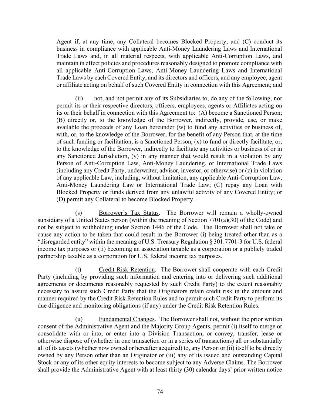 74 Agent if, at any time, any Collateral becomes Blocked Property; and (C) conduct its business in compliance with applicable Anti-Money Laundering Laws and International Trade Laws and, in all material respects, with applicable Anti-Corruption Laws, and maintain in effect policies and procedures reasonably designed to promote compliance with all applicable Anti-Corruption Laws, Anti-Money Laundering Laws and International Trade Laws by each Covered Entity, and its directors and officers, and any employee, agent or affiliate acting on behalf of such Covered Entity in connection with this Agreement; and (ii) not, and not permit any of its Subsidiaries to, do any of the following, nor permit its or their respective directors, officers, employees, agents or Affiliates acting on its or their behalf in connection with this Agreement to: (A) become a Sanctioned Person; (B) directly or, to the knowledge of the Borrower, indirectly, provide, use, or make available the proceeds of any Loan hereunder (w) to fund any activities or business of, with, or, to the knowledge of the Borrower, for the benefit of any Person that, at the time of such funding or facilitation, is a Sanctioned Person, (x) to fund or directly facilitate, or, to the knowledge of the Borrower, indirectly to facilitate any activities or business of or in any Sanctioned Jurisdiction, (y) in any manner that would result in a violation by any Person of Anti-Corruption Law, Anti-Money Laundering, or International Trade Laws (including any Credit Party, underwriter, advisor, investor, or otherwise) or (z) in violation of any applicable Law, including, without limitation, any applicable Anti-Corruption Law, Anti-Money Laundering Law or International Trade Law; (C) repay any Loan with Blocked Property or funds derived from any unlawful activity of any Covered Entity; or (D) permit any Collateral to become Blocked Property. (s) Borrower’s Tax Status. The Borrower will remain a wholly-owned subsidiary of a United States person (within the meaning of Section 7701(a)(30) of the Code) and not be subject to withholding under Section 1446 of the Code. The Borrower shall not take or cause any action to be taken that could result in the Borrower (i) being treated other than as a “disregarded entity” within the meaning of U.S. Treasury Regulation § 301.7701-3 for U.S. federal income tax purposes or (ii) becoming an association taxable as a corporation or a publicly traded partnership taxable as a corporation for U.S. federal income tax purposes. (t) Credit Risk Retention. The Borrower shall cooperate with each Credit Party (including by providing such information and entering into or delivering such additional agreements or documents reasonably requested by such Credit Party) to the extent reasonably necessary to assure such Credit Party that the Originators retain credit risk in the amount and manner required by the Credit Risk Retention Rules and to permit such Credit Party to perform its due diligence and monitoring obligations (if any) under the Credit Risk Retention Rules. (u) Fundamental Changes. The Borrower shall not, without the prior written consent of the Administrative Agent and the Majority Group Agents, permit (i) itself to merge or consolidate with or into, or enter into a Division Transaction, or convey, transfer, lease or otherwise dispose of (whether in one transaction or in a series of transactions) all or substantially all of its assets (whether now owned or hereafter acquired) to, any Person or (ii) itself to be directly owned by any Person other than an Originator or (iii) any of its issued and outstanding Capital Stock or any of its other equity interests to become subject to any Adverse Claims. The Borrower shall provide the Administrative Agent with at least thirty (30) calendar days’ prior written notice