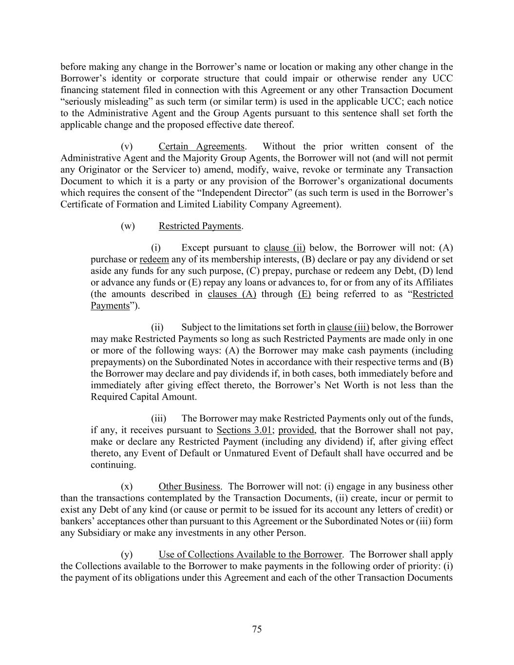 75 before making any change in the Borrower’s name or location or making any other change in the Borrower’s identity or corporate structure that could impair or otherwise render any UCC financing statement filed in connection with this Agreement or any other Transaction Document “seriously misleading” as such term (or similar term) is used in the applicable UCC; each notice to the Administrative Agent and the Group Agents pursuant to this sentence shall set forth the applicable change and the proposed effective date thereof. (v) Certain Agreements. Without the prior written consent of the Administrative Agent and the Majority Group Agents, the Borrower will not (and will not permit any Originator or the Servicer to) amend, modify, waive, revoke or terminate any Transaction Document to which it is a party or any provision of the Borrower’s organizational documents which requires the consent of the “Independent Director” (as such term is used in the Borrower’s Certificate of Formation and Limited Liability Company Agreement). (w) Restricted Payments. (i) Except pursuant to clause (ii) below, the Borrower will not: (A) purchase or redeem any of its membership interests, (B) declare or pay any dividend or set aside any funds for any such purpose, (C) prepay, purchase or redeem any Debt, (D) lend or advance any funds or (E) repay any loans or advances to, for or from any of its Affiliates (the amounts described in clauses (A) through (E) being referred to as “Restricted Payments”). (ii) Subject to the limitations set forth in clause (iii) below, the Borrower may make Restricted Payments so long as such Restricted Payments are made only in one or more of the following ways: (A) the Borrower may make cash payments (including prepayments) on the Subordinated Notes in accordance with their respective terms and (B) the Borrower may declare and pay dividends if, in both cases, both immediately before and immediately after giving effect thereto, the Borrower’s Net Worth is not less than the Required Capital Amount. (iii) The Borrower may make Restricted Payments only out of the funds, if any, it receives pursuant to Sections 3.01; provided, that the Borrower shall not pay, make or declare any Restricted Payment (including any dividend) if, after giving effect thereto, any Event of Default or Unmatured Event of Default shall have occurred and be continuing. (x) Other Business. The Borrower will not: (i) engage in any business other than the transactions contemplated by the Transaction Documents, (ii) create, incur or permit to exist any Debt of any kind (or cause or permit to be issued for its account any letters of credit) or bankers’ acceptances other than pursuant to this Agreement or the Subordinated Notes or (iii) form any Subsidiary or make any investments in any other Person. (y) Use of Collections Available to the Borrower. The Borrower shall apply the Collections available to the Borrower to make payments in the following order of priority: (i) the payment of its obligations under this Agreement and each of the other Transaction Documents