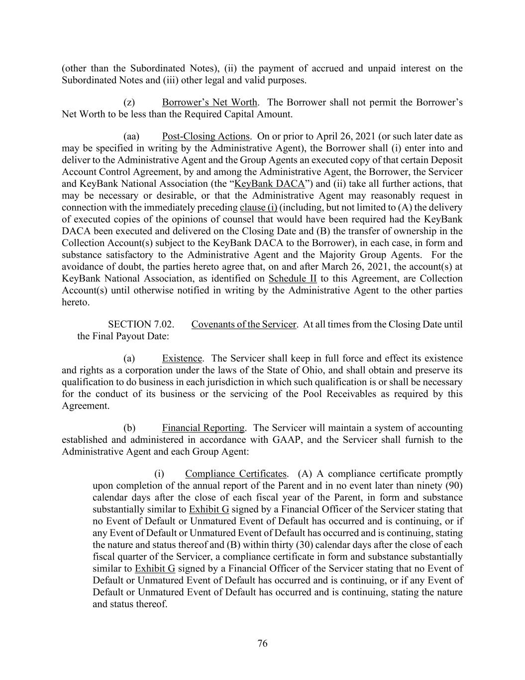 76 (other than the Subordinated Notes), (ii) the payment of accrued and unpaid interest on the Subordinated Notes and (iii) other legal and valid purposes. (z) Borrower’s Net Worth. The Borrower shall not permit the Borrower’s Net Worth to be less than the Required Capital Amount. (aa) Post-Closing Actions. On or prior to April 26, 2021 (or such later date as may be specified in writing by the Administrative Agent), the Borrower shall (i) enter into and deliver to the Administrative Agent and the Group Agents an executed copy of that certain Deposit Account Control Agreement, by and among the Administrative Agent, the Borrower, the Servicer and KeyBank National Association (the “KeyBank DACA”) and (ii) take all further actions, that may be necessary or desirable, or that the Administrative Agent may reasonably request in connection with the immediately preceding clause (i) (including, but not limited to (A) the delivery of executed copies of the opinions of counsel that would have been required had the KeyBank DACA been executed and delivered on the Closing Date and (B) the transfer of ownership in the Collection Account(s) subject to the KeyBank DACA to the Borrower), in each case, in form and substance satisfactory to the Administrative Agent and the Majority Group Agents. For the avoidance of doubt, the parties hereto agree that, on and after March 26, 2021, the account(s) at KeyBank National Association, as identified on Schedule II to this Agreement, are Collection Account(s) until otherwise notified in writing by the Administrative Agent to the other parties hereto. SECTION 7.02. Covenants of the Servicer. At all times from the Closing Date until the Final Payout Date: (a) Existence. The Servicer shall keep in full force and effect its existence and rights as a corporation under the laws of the State of Ohio, and shall obtain and preserve its qualification to do business in each jurisdiction in which such qualification is or shall be necessary for the conduct of its business or the servicing of the Pool Receivables as required by this Agreement. (b) Financial Reporting. The Servicer will maintain a system of accounting established and administered in accordance with GAAP, and the Servicer shall furnish to the Administrative Agent and each Group Agent: (i) Compliance Certificates. (A) A compliance certificate promptly upon completion of the annual report of the Parent and in no event later than ninety (90) calendar days after the close of each fiscal year of the Parent, in form and substance substantially similar to Exhibit G signed by a Financial Officer of the Servicer stating that no Event of Default or Unmatured Event of Default has occurred and is continuing, or if any Event of Default or Unmatured Event of Default has occurred and is continuing, stating the nature and status thereof and (B) within thirty (30) calendar days after the close of each fiscal quarter of the Servicer, a compliance certificate in form and substance substantially similar to Exhibit G signed by a Financial Officer of the Servicer stating that no Event of Default or Unmatured Event of Default has occurred and is continuing, or if any Event of Default or Unmatured Event of Default has occurred and is continuing, stating the nature and status thereof.
