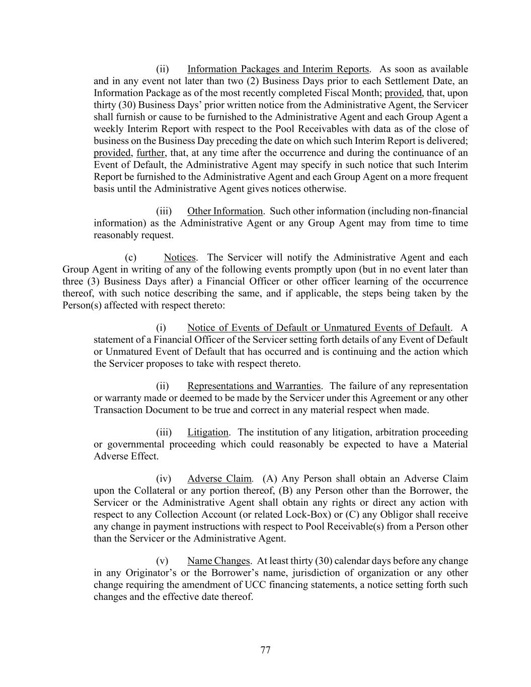77 (ii) Information Packages and Interim Reports. As soon as available and in any event not later than two (2) Business Days prior to each Settlement Date, an Information Package as of the most recently completed Fiscal Month; provided, that, upon thirty (30) Business Days’ prior written notice from the Administrative Agent, the Servicer shall furnish or cause to be furnished to the Administrative Agent and each Group Agent a weekly Interim Report with respect to the Pool Receivables with data as of the close of business on the Business Day preceding the date on which such Interim Report is delivered; provided, further, that, at any time after the occurrence and during the continuance of an Event of Default, the Administrative Agent may specify in such notice that such Interim Report be furnished to the Administrative Agent and each Group Agent on a more frequent basis until the Administrative Agent gives notices otherwise. (iii) Other Information. Such other information (including non-financial information) as the Administrative Agent or any Group Agent may from time to time reasonably request. (c) Notices. The Servicer will notify the Administrative Agent and each Group Agent in writing of any of the following events promptly upon (but in no event later than three (3) Business Days after) a Financial Officer or other officer learning of the occurrence thereof, with such notice describing the same, and if applicable, the steps being taken by the Person(s) affected with respect thereto: (i) Notice of Events of Default or Unmatured Events of Default. A statement of a Financial Officer of the Servicer setting forth details of any Event of Default or Unmatured Event of Default that has occurred and is continuing and the action which the Servicer proposes to take with respect thereto. (ii) Representations and Warranties. The failure of any representation or warranty made or deemed to be made by the Servicer under this Agreement or any other Transaction Document to be true and correct in any material respect when made. (iii) Litigation. The institution of any litigation, arbitration proceeding or governmental proceeding which could reasonably be expected to have a Material Adverse Effect. (iv) Adverse Claim. (A) Any Person shall obtain an Adverse Claim upon the Collateral or any portion thereof, (B) any Person other than the Borrower, the Servicer or the Administrative Agent shall obtain any rights or direct any action with respect to any Collection Account (or related Lock-Box) or (C) any Obligor shall receive any change in payment instructions with respect to Pool Receivable(s) from a Person other than the Servicer or the Administrative Agent. (v) Name Changes. At least thirty (30) calendar days before any change in any Originator’s or the Borrower’s name, jurisdiction of organization or any other change requiring the amendment of UCC financing statements, a notice setting forth such changes and the effective date thereof.