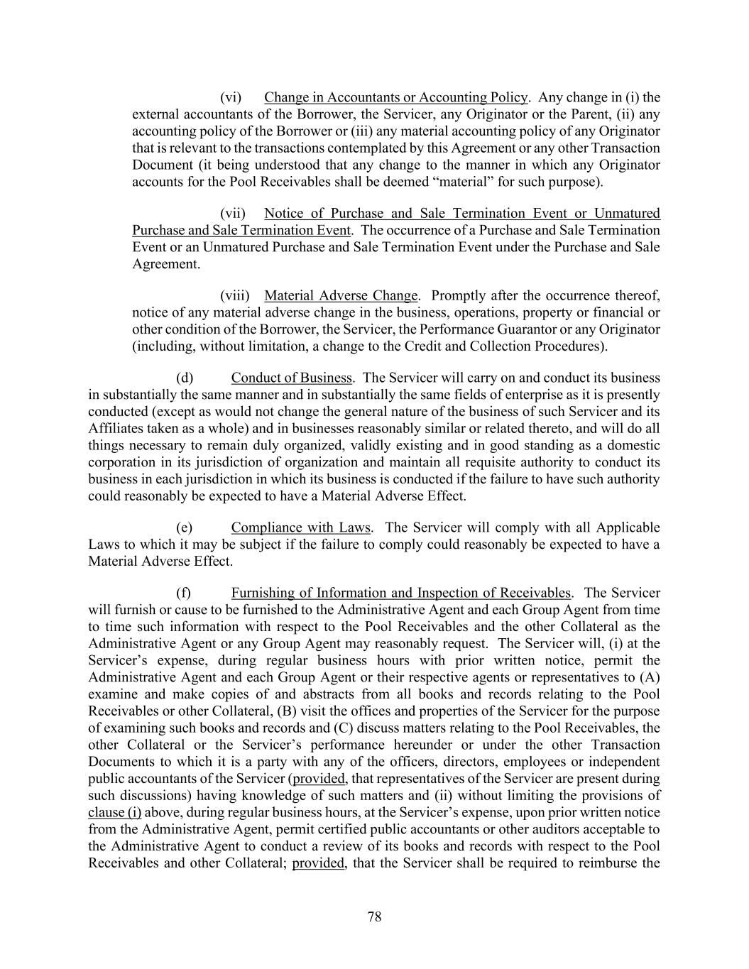 78 (vi) Change in Accountants or Accounting Policy. Any change in (i) the external accountants of the Borrower, the Servicer, any Originator or the Parent, (ii) any accounting policy of the Borrower or (iii) any material accounting policy of any Originator that is relevant to the transactions contemplated by this Agreement or any other Transaction Document (it being understood that any change to the manner in which any Originator accounts for the Pool Receivables shall be deemed “material” for such purpose). (vii) Notice of Purchase and Sale Termination Event or Unmatured Purchase and Sale Termination Event. The occurrence of a Purchase and Sale Termination Event or an Unmatured Purchase and Sale Termination Event under the Purchase and Sale Agreement. (viii) Material Adverse Change. Promptly after the occurrence thereof, notice of any material adverse change in the business, operations, property or financial or other condition of the Borrower, the Servicer, the Performance Guarantor or any Originator (including, without limitation, a change to the Credit and Collection Procedures). (d) Conduct of Business. The Servicer will carry on and conduct its business in substantially the same manner and in substantially the same fields of enterprise as it is presently conducted (except as would not change the general nature of the business of such Servicer and its Affiliates taken as a whole) and in businesses reasonably similar or related thereto, and will do all things necessary to remain duly organized, validly existing and in good standing as a domestic corporation in its jurisdiction of organization and maintain all requisite authority to conduct its business in each jurisdiction in which its business is conducted if the failure to have such authority could reasonably be expected to have a Material Adverse Effect. (e) Compliance with Laws. The Servicer will comply with all Applicable Laws to which it may be subject if the failure to comply could reasonably be expected to have a Material Adverse Effect. (f) Furnishing of Information and Inspection of Receivables. The Servicer will furnish or cause to be furnished to the Administrative Agent and each Group Agent from time to time such information with respect to the Pool Receivables and the other Collateral as the Administrative Agent or any Group Agent may reasonably request. The Servicer will, (i) at the Servicer’s expense, during regular business hours with prior written notice, permit the Administrative Agent and each Group Agent or their respective agents or representatives to (A) examine and make copies of and abstracts from all books and records relating to the Pool Receivables or other Collateral, (B) visit the offices and properties of the Servicer for the purpose of examining such books and records and (C) discuss matters relating to the Pool Receivables, the other Collateral or the Servicer’s performance hereunder or under the other Transaction Documents to which it is a party with any of the officers, directors, employees or independent public accountants of the Servicer (provided, that representatives of the Servicer are present during such discussions) having knowledge of such matters and (ii) without limiting the provisions of clause (i) above, during regular business hours, at the Servicer’s expense, upon prior written notice from the Administrative Agent, permit certified public accountants or other auditors acceptable to the Administrative Agent to conduct a review of its books and records with respect to the Pool Receivables and other Collateral; provided, that the Servicer shall be required to reimburse the