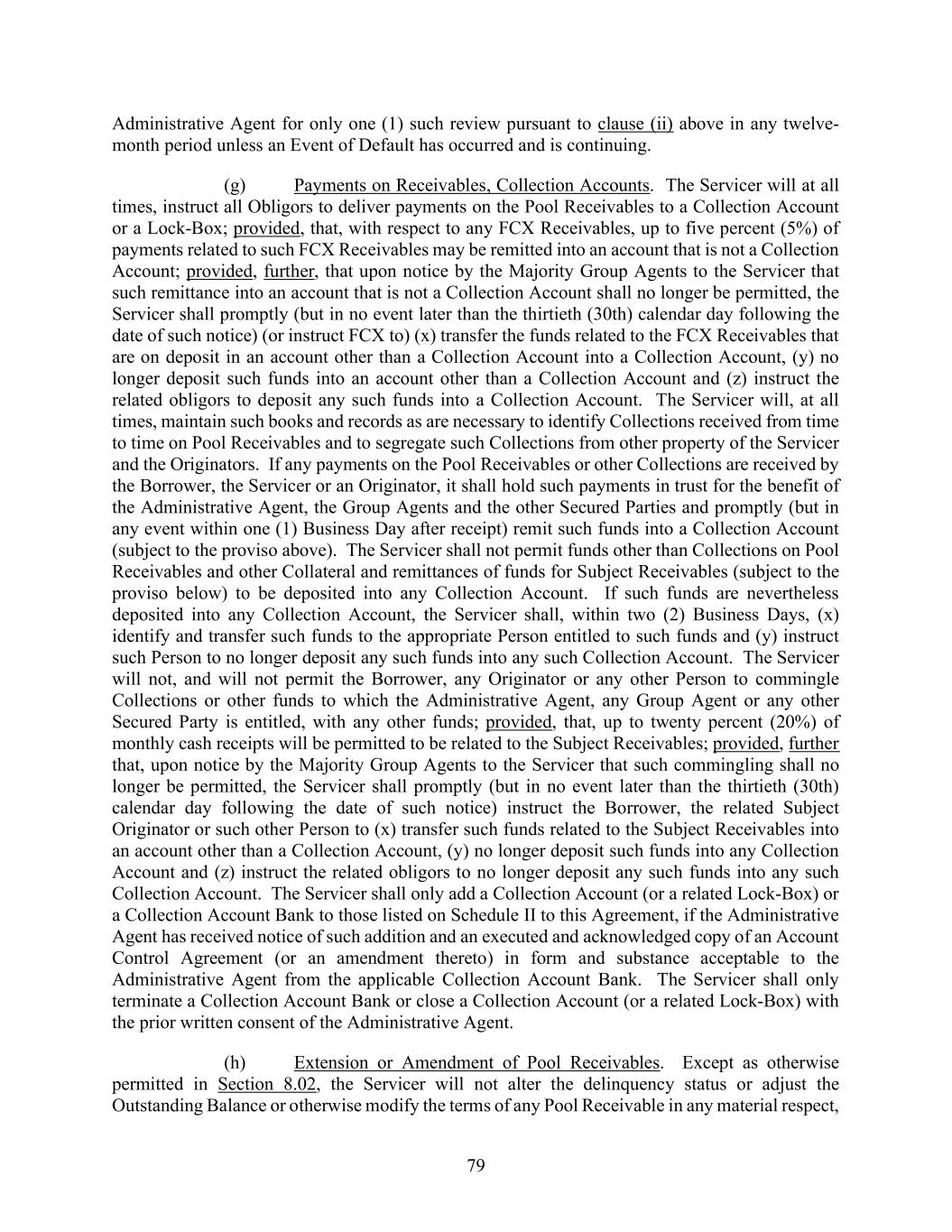 79 Administrative Agent for only one (1) such review pursuant to clause (ii) above in any twelve- month period unless an Event of Default has occurred and is continuing. (g) Payments on Receivables, Collection Accounts. The Servicer will at all times, instruct all Obligors to deliver payments on the Pool Receivables to a Collection Account or a Lock-Box; provided, that, with respect to any FCX Receivables, up to five percent (5%) of payments related to such FCX Receivables may be remitted into an account that is not a Collection Account; provided, further, that upon notice by the Majority Group Agents to the Servicer that such remittance into an account that is not a Collection Account shall no longer be permitted, the Servicer shall promptly (but in no event later than the thirtieth (30th) calendar day following the date of such notice) (or instruct FCX to) (x) transfer the funds related to the FCX Receivables that are on deposit in an account other than a Collection Account into a Collection Account, (y) no longer deposit such funds into an account other than a Collection Account and (z) instruct the related obligors to deposit any such funds into a Collection Account. The Servicer will, at all times, maintain such books and records as are necessary to identify Collections received from time to time on Pool Receivables and to segregate such Collections from other property of the Servicer and the Originators. If any payments on the Pool Receivables or other Collections are received by the Borrower, the Servicer or an Originator, it shall hold such payments in trust for the benefit of the Administrative Agent, the Group Agents and the other Secured Parties and promptly (but in any event within one (1) Business Day after receipt) remit such funds into a Collection Account (subject to the proviso above). The Servicer shall not permit funds other than Collections on Pool Receivables and other Collateral and remittances of funds for Subject Receivables (subject to the proviso below) to be deposited into any Collection Account. If such funds are nevertheless deposited into any Collection Account, the Servicer shall, within two (2) Business Days, (x) identify and transfer such funds to the appropriate Person entitled to such funds and (y) instruct such Person to no longer deposit any such funds into any such Collection Account. The Servicer will not, and will not permit the Borrower, any Originator or any other Person to commingle Collections or other funds to which the Administrative Agent, any Group Agent or any other Secured Party is entitled, with any other funds; provided, that, up to twenty percent (20%) of monthly cash receipts will be permitted to be related to the Subject Receivables; provided, further that, upon notice by the Majority Group Agents to the Servicer that such commingling shall no longer be permitted, the Servicer shall promptly (but in no event later than the thirtieth (30th) calendar day following the date of such notice) instruct the Borrower, the related Subject Originator or such other Person to (x) transfer such funds related to the Subject Receivables into an account other than a Collection Account, (y) no longer deposit such funds into any Collection Account and (z) instruct the related obligors to no longer deposit any such funds into any such Collection Account. The Servicer shall only add a Collection Account (or a related Lock-Box) or a Collection Account Bank to those listed on Schedule II to this Agreement, if the Administrative Agent has received notice of such addition and an executed and acknowledged copy of an Account Control Agreement (or an amendment thereto) in form and substance acceptable to the Administrative Agent from the applicable Collection Account Bank. The Servicer shall only terminate a Collection Account Bank or close a Collection Account (or a related Lock-Box) with the prior written consent of the Administrative Agent. (h) Extension or Amendment of Pool Receivables. Except as otherwise permitted in Section 8.02, the Servicer will not alter the delinquency status or adjust the Outstanding Balance or otherwise modify the terms of any Pool Receivable in any material respect,