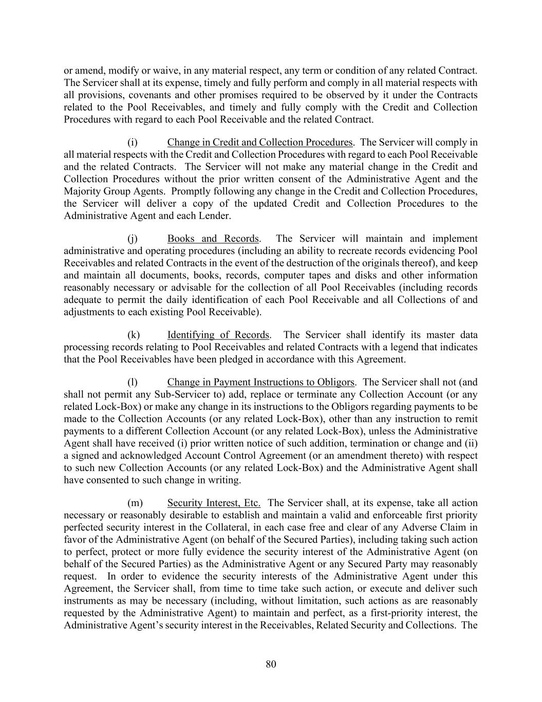 80 or amend, modify or waive, in any material respect, any term or condition of any related Contract. The Servicer shall at its expense, timely and fully perform and comply in all material respects with all provisions, covenants and other promises required to be observed by it under the Contracts related to the Pool Receivables, and timely and fully comply with the Credit and Collection Procedures with regard to each Pool Receivable and the related Contract. (i) Change in Credit and Collection Procedures. The Servicer will comply in all material respects with the Credit and Collection Procedures with regard to each Pool Receivable and the related Contracts. The Servicer will not make any material change in the Credit and Collection Procedures without the prior written consent of the Administrative Agent and the Majority Group Agents. Promptly following any change in the Credit and Collection Procedures, the Servicer will deliver a copy of the updated Credit and Collection Procedures to the Administrative Agent and each Lender. (j) Books and Records. The Servicer will maintain and implement administrative and operating procedures (including an ability to recreate records evidencing Pool Receivables and related Contracts in the event of the destruction of the originals thereof), and keep and maintain all documents, books, records, computer tapes and disks and other information reasonably necessary or advisable for the collection of all Pool Receivables (including records adequate to permit the daily identification of each Pool Receivable and all Collections of and adjustments to each existing Pool Receivable). (k) Identifying of Records. The Servicer shall identify its master data processing records relating to Pool Receivables and related Contracts with a legend that indicates that the Pool Receivables have been pledged in accordance with this Agreement. (l) Change in Payment Instructions to Obligors. The Servicer shall not (and shall not permit any Sub-Servicer to) add, replace or terminate any Collection Account (or any related Lock-Box) or make any change in its instructions to the Obligors regarding payments to be made to the Collection Accounts (or any related Lock-Box), other than any instruction to remit payments to a different Collection Account (or any related Lock-Box), unless the Administrative Agent shall have received (i) prior written notice of such addition, termination or change and (ii) a signed and acknowledged Account Control Agreement (or an amendment thereto) with respect to such new Collection Accounts (or any related Lock-Box) and the Administrative Agent shall have consented to such change in writing. (m) Security Interest, Etc. The Servicer shall, at its expense, take all action necessary or reasonably desirable to establish and maintain a valid and enforceable first priority perfected security interest in the Collateral, in each case free and clear of any Adverse Claim in favor of the Administrative Agent (on behalf of the Secured Parties), including taking such action to perfect, protect or more fully evidence the security interest of the Administrative Agent (on behalf of the Secured Parties) as the Administrative Agent or any Secured Party may reasonably request. In order to evidence the security interests of the Administrative Agent under this Agreement, the Servicer shall, from time to time take such action, or execute and deliver such instruments as may be necessary (including, without limitation, such actions as are reasonably requested by the Administrative Agent) to maintain and perfect, as a first-priority interest, the Administrative Agent’s security interest in the Receivables, Related Security and Collections. The
