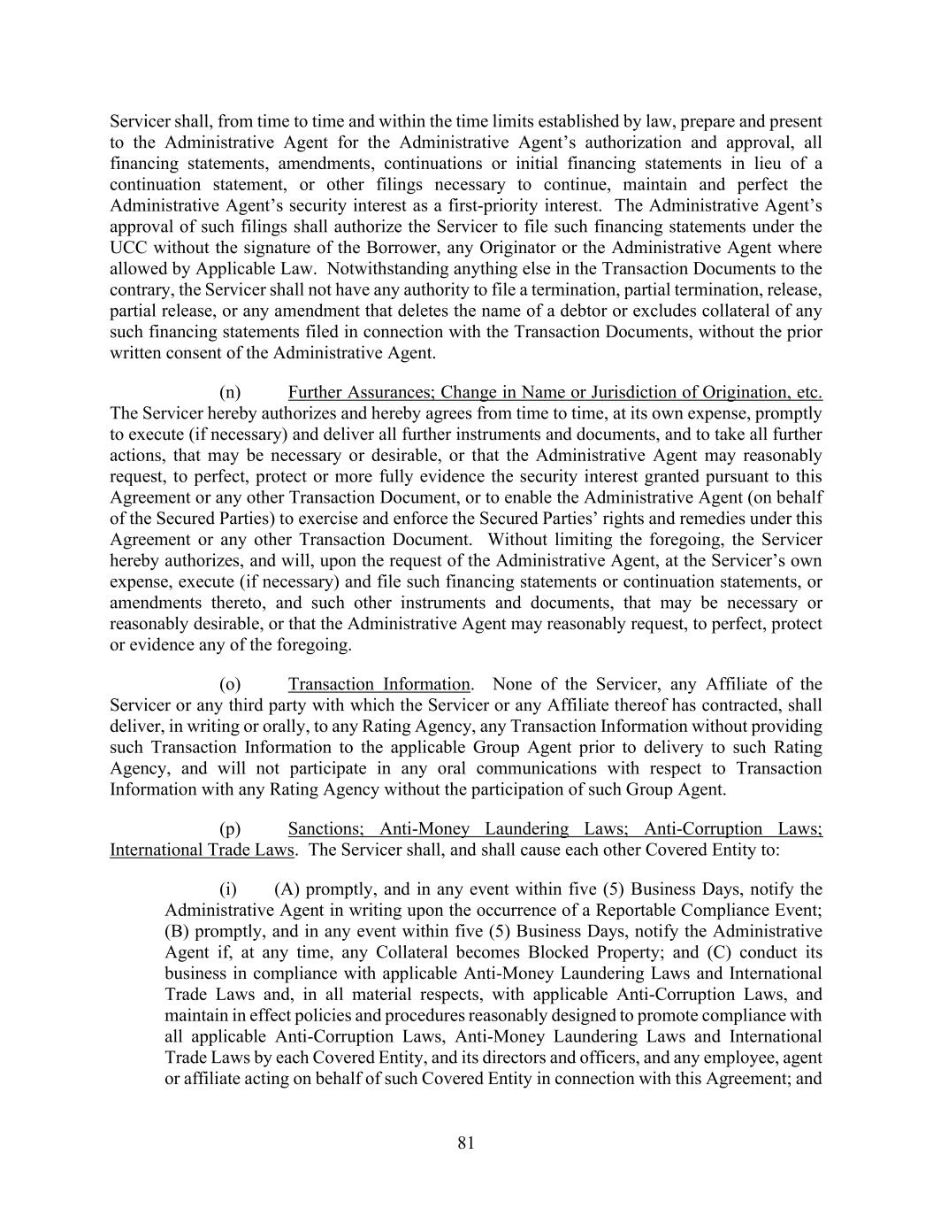 81 Servicer shall, from time to time and within the time limits established by law, prepare and present to the Administrative Agent for the Administrative Agent’s authorization and approval, all financing statements, amendments, continuations or initial financing statements in lieu of a continuation statement, or other filings necessary to continue, maintain and perfect the Administrative Agent’s security interest as a first-priority interest. The Administrative Agent’s approval of such filings shall authorize the Servicer to file such financing statements under the UCC without the signature of the Borrower, any Originator or the Administrative Agent where allowed by Applicable Law. Notwithstanding anything else in the Transaction Documents to the contrary, the Servicer shall not have any authority to file a termination, partial termination, release, partial release, or any amendment that deletes the name of a debtor or excludes collateral of any such financing statements filed in connection with the Transaction Documents, without the prior written consent of the Administrative Agent. (n) Further Assurances; Change in Name or Jurisdiction of Origination, etc. The Servicer hereby authorizes and hereby agrees from time to time, at its own expense, promptly to execute (if necessary) and deliver all further instruments and documents, and to take all further actions, that may be necessary or desirable, or that the Administrative Agent may reasonably request, to perfect, protect or more fully evidence the security interest granted pursuant to this Agreement or any other Transaction Document, or to enable the Administrative Agent (on behalf of the Secured Parties) to exercise and enforce the Secured Parties’ rights and remedies under this Agreement or any other Transaction Document. Without limiting the foregoing, the Servicer hereby authorizes, and will, upon the request of the Administrative Agent, at the Servicer’s own expense, execute (if necessary) and file such financing statements or continuation statements, or amendments thereto, and such other instruments and documents, that may be necessary or reasonably desirable, or that the Administrative Agent may reasonably request, to perfect, protect or evidence any of the foregoing. (o) Transaction Information. None of the Servicer, any Affiliate of the Servicer or any third party with which the Servicer or any Affiliate thereof has contracted, shall deliver, in writing or orally, to any Rating Agency, any Transaction Information without providing such Transaction Information to the applicable Group Agent prior to delivery to such Rating Agency, and will not participate in any oral communications with respect to Transaction Information with any Rating Agency without the participation of such Group Agent. (p) Sanctions; Anti-Money Laundering Laws; Anti-Corruption Laws; International Trade Laws. The Servicer shall, and shall cause each other Covered Entity to: (i) (A) promptly, and in any event within five (5) Business Days, notify the Administrative Agent in writing upon the occurrence of a Reportable Compliance Event; (B) promptly, and in any event within five (5) Business Days, notify the Administrative Agent if, at any time, any Collateral becomes Blocked Property; and (C) conduct its business in compliance with applicable Anti-Money Laundering Laws and International Trade Laws and, in all material respects, with applicable Anti-Corruption Laws, and maintain in effect policies and procedures reasonably designed to promote compliance with all applicable Anti-Corruption Laws, Anti-Money Laundering Laws and International Trade Laws by each Covered Entity, and its directors and officers, and any employee, agent or affiliate acting on behalf of such Covered Entity in connection with this Agreement; and