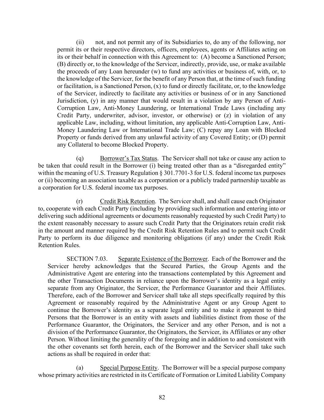 82 (ii) not, and not permit any of its Subsidiaries to, do any of the following, nor permit its or their respective directors, officers, employees, agents or Affiliates acting on its or their behalf in connection with this Agreement to: (A) become a Sanctioned Person; (B) directly or, to the knowledge of the Servicer, indirectly, provide, use, or make available the proceeds of any Loan hereunder (w) to fund any activities or business of, with, or, to the knowledge of the Servicer, for the benefit of any Person that, at the time of such funding or facilitation, is a Sanctioned Person, (x) to fund or directly facilitate, or, to the knowledge of the Servicer, indirectly to facilitate any activities or business of or in any Sanctioned Jurisdiction, (y) in any manner that would result in a violation by any Person of Anti- Corruption Law, Anti-Money Laundering, or International Trade Laws (including any Credit Party, underwriter, advisor, investor, or otherwise) or (z) in violation of any applicable Law, including, without limitation, any applicable Anti-Corruption Law, Anti- Money Laundering Law or International Trade Law; (C) repay any Loan with Blocked Property or funds derived from any unlawful activity of any Covered Entity; or (D) permit any Collateral to become Blocked Property. (q) Borrower’s Tax Status. The Servicer shall not take or cause any action to be taken that could result in the Borrower (i) being treated other than as a “disregarded entity” within the meaning of U.S. Treasury Regulation § 301.7701-3 for U.S. federal income tax purposes or (ii) becoming an association taxable as a corporation or a publicly traded partnership taxable as a corporation for U.S. federal income tax purposes. (r) Credit Risk Retention. The Servicer shall, and shall cause each Originator to, cooperate with each Credit Party (including by providing such information and entering into or delivering such additional agreements or documents reasonably requested by such Credit Party) to the extent reasonably necessary to assure such Credit Party that the Originators retain credit risk in the amount and manner required by the Credit Risk Retention Rules and to permit such Credit Party to perform its due diligence and monitoring obligations (if any) under the Credit Risk Retention Rules. SECTION 7.03. Separate Existence of the Borrower. Each of the Borrower and the Servicer hereby acknowledges that the Secured Parties, the Group Agents and the Administrative Agent are entering into the transactions contemplated by this Agreement and the other Transaction Documents in reliance upon the Borrower’s identity as a legal entity separate from any Originator, the Servicer, the Performance Guarantor and their Affiliates. Therefore, each of the Borrower and Servicer shall take all steps specifically required by this Agreement or reasonably required by the Administrative Agent or any Group Agent to continue the Borrower’s identity as a separate legal entity and to make it apparent to third Persons that the Borrower is an entity with assets and liabilities distinct from those of the Performance Guarantor, the Originators, the Servicer and any other Person, and is not a division of the Performance Guarantor, the Originators, the Servicer, its Affiliates or any other Person. Without limiting the generality of the foregoing and in addition to and consistent with the other covenants set forth herein, each of the Borrower and the Servicer shall take such actions as shall be required in order that: (a) Special Purpose Entity. The Borrower will be a special purpose company whose primary activities are restricted in its Certificate of Formation or Limited Liability Company