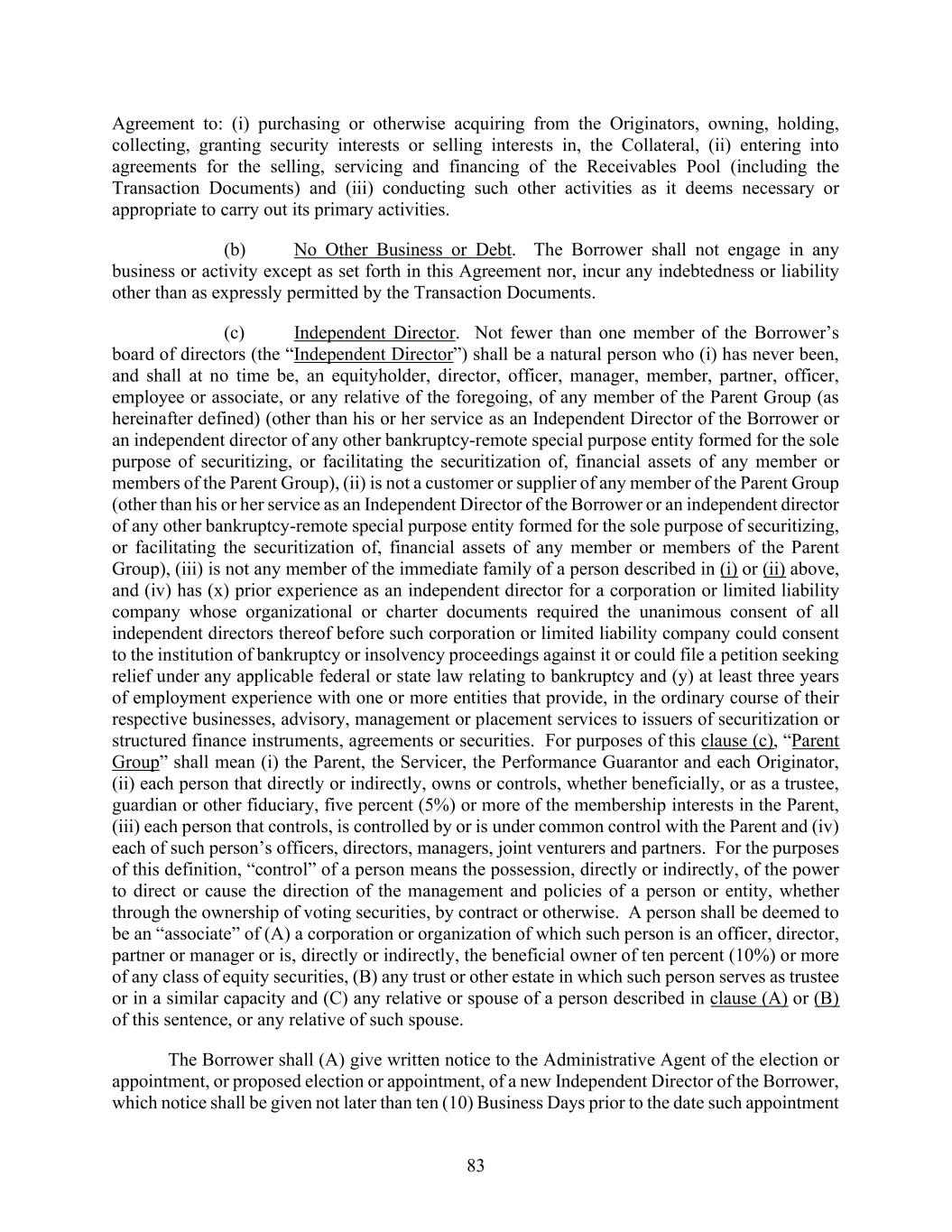 83 Agreement to: (i) purchasing or otherwise acquiring from the Originators, owning, holding, collecting, granting security interests or selling interests in, the Collateral, (ii) entering into agreements for the selling, servicing and financing of the Receivables Pool (including the Transaction Documents) and (iii) conducting such other activities as it deems necessary or appropriate to carry out its primary activities. (b) No Other Business or Debt. The Borrower shall not engage in any business or activity except as set forth in this Agreement nor, incur any indebtedness or liability other than as expressly permitted by the Transaction Documents. (c) Independent Director. Not fewer than one member of the Borrower’s board of directors (the “Independent Director”) shall be a natural person who (i) has never been, and shall at no time be, an equityholder, director, officer, manager, member, partner, officer, employee or associate, or any relative of the foregoing, of any member of the Parent Group (as hereinafter defined) (other than his or her service as an Independent Director of the Borrower or an independent director of any other bankruptcy-remote special purpose entity formed for the sole purpose of securitizing, or facilitating the securitization of, financial assets of any member or members of the Parent Group), (ii) is not a customer or supplier of any member of the Parent Group (other than his or her service as an Independent Director of the Borrower or an independent director of any other bankruptcy-remote special purpose entity formed for the sole purpose of securitizing, or facilitating the securitization of, financial assets of any member or members of the Parent Group), (iii) is not any member of the immediate family of a person described in (i) or (ii) above, and (iv) has (x) prior experience as an independent director for a corporation or limited liability company whose organizational or charter documents required the unanimous consent of all independent directors thereof before such corporation or limited liability company could consent to the institution of bankruptcy or insolvency proceedings against it or could file a petition seeking relief under any applicable federal or state law relating to bankruptcy and (y) at least three years of employment experience with one or more entities that provide, in the ordinary course of their respective businesses, advisory, management or placement services to issuers of securitization or structured finance instruments, agreements or securities. For purposes of this clause (c), “Parent Group” shall mean (i) the Parent, the Servicer, the Performance Guarantor and each Originator, (ii) each person that directly or indirectly, owns or controls, whether beneficially, or as a trustee, guardian or other fiduciary, five percent (5%) or more of the membership interests in the Parent, (iii) each person that controls, is controlled by or is under common control with the Parent and (iv) each of such person’s officers, directors, managers, joint venturers and partners. For the purposes of this definition, “control” of a person means the possession, directly or indirectly, of the power to direct or cause the direction of the management and policies of a person or entity, whether through the ownership of voting securities, by contract or otherwise. A person shall be deemed to be an “associate” of (A) a corporation or organization of which such person is an officer, director, partner or manager or is, directly or indirectly, the beneficial owner of ten percent (10%) or more of any class of equity securities, (B) any trust or other estate in which such person serves as trustee or in a similar capacity and (C) any relative or spouse of a person described in clause (A) or (B) of this sentence, or any relative of such spouse. The Borrower shall (A) give written notice to the Administrative Agent of the election or appointment, or proposed election or appointment, of a new Independent Director of the Borrower, which notice shall be given not later than ten (10) Business Days prior to the date such appointment