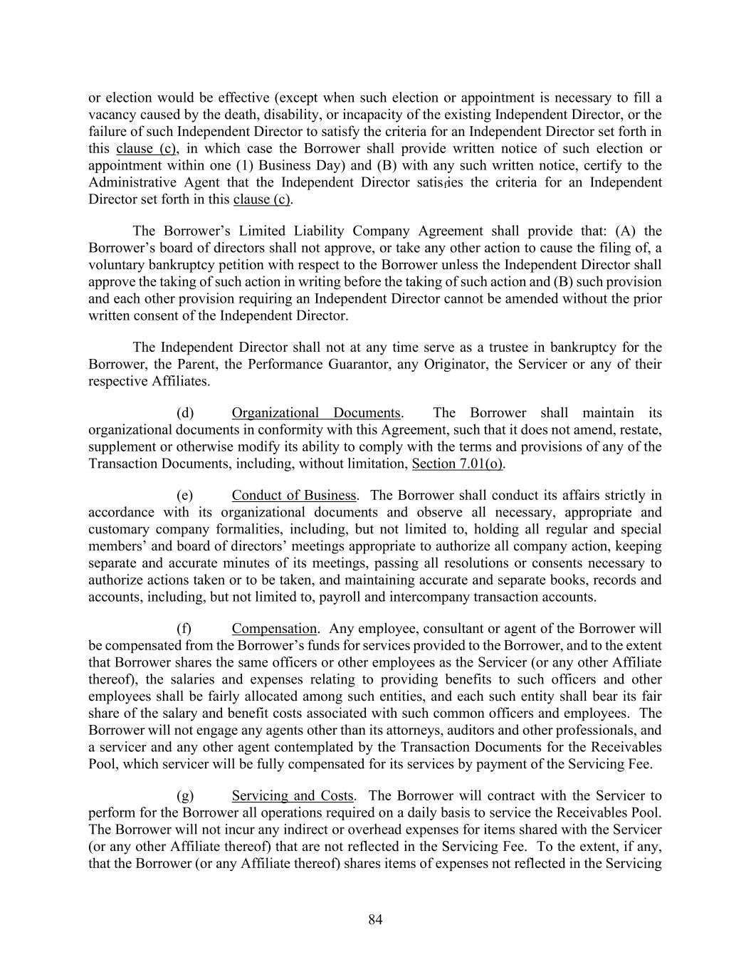 84 or election would be effective (except when such election or appointment is necessary to fill a vacancy caused by the death, disability, or incapacity of the existing Independent Director, or the failure of such Independent Director to satisfy the criteria for an Independent Director set forth in this clause (c), in which case the Borrower shall provide written notice of such election or appointment within one (1) Business Day) and (B) with any such written notice, certify to the Administrative Agent that the Independent Director satisfies the criteria for an Independent Director set forth in this clause (c). The Borrower’s Limited Liability Company Agreement shall provide that: (A) the Borrower’s board of directors shall not approve, or take any other action to cause the filing of, a voluntary bankruptcy petition with respect to the Borrower unless the Independent Director shall approve the taking of such action in writing before the taking of such action and (B) such provision and each other provision requiring an Independent Director cannot be amended without the prior written consent of the Independent Director. The Independent Director shall not at any time serve as a trustee in bankruptcy for the Borrower, the Parent, the Performance Guarantor, any Originator, the Servicer or any of their respective Affiliates. (d) Organizational Documents. The Borrower shall maintain its organizational documents in conformity with this Agreement, such that it does not amend, restate, supplement or otherwise modify its ability to comply with the terms and provisions of any of the Transaction Documents, including, without limitation, Section 7.01(o). (e) Conduct of Business. The Borrower shall conduct its affairs strictly in accordance with its organizational documents and observe all necessary, appropriate and customary company formalities, including, but not limited to, holding all regular and special members’ and board of directors’ meetings appropriate to authorize all company action, keeping separate and accurate minutes of its meetings, passing all resolutions or consents necessary to authorize actions taken or to be taken, and maintaining accurate and separate books, records and accounts, including, but not limited to, payroll and intercompany transaction accounts. (f) Compensation. Any employee, consultant or agent of the Borrower will be compensated from the Borrower’s funds for services provided to the Borrower, and to the extent that Borrower shares the same officers or other employees as the Servicer (or any other Affiliate thereof), the salaries and expenses relating to providing benefits to such officers and other employees shall be fairly allocated among such entities, and each such entity shall bear its fair share of the salary and benefit costs associated with such common officers and employees. The Borrower will not engage any agents other than its attorneys, auditors and other professionals, and a servicer and any other agent contemplated by the Transaction Documents for the Receivables Pool, which servicer will be fully compensated for its services by payment of the Servicing Fee. (g) Servicing and Costs. The Borrower will contract with the Servicer to perform for the Borrower all operations required on a daily basis to service the Receivables Pool. The Borrower will not incur any indirect or overhead expenses for items shared with the Servicer (or any other Affiliate thereof) that are not reflected in the Servicing Fee. To the extent, if any, that the Borrower (or any Affiliate thereof) shares items of expenses not reflected in the Servicing