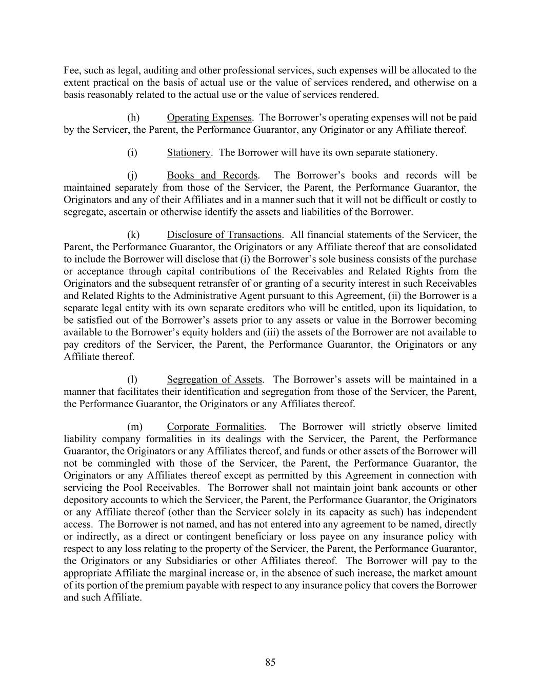 85 Fee, such as legal, auditing and other professional services, such expenses will be allocated to the extent practical on the basis of actual use or the value of services rendered, and otherwise on a basis reasonably related to the actual use or the value of services rendered. (h) Operating Expenses. The Borrower’s operating expenses will not be paid by the Servicer, the Parent, the Performance Guarantor, any Originator or any Affiliate thereof. (i) Stationery. The Borrower will have its own separate stationery. (j) Books and Records. The Borrower’s books and records will be maintained separately from those of the Servicer, the Parent, the Performance Guarantor, the Originators and any of their Affiliates and in a manner such that it will not be difficult or costly to segregate, ascertain or otherwise identify the assets and liabilities of the Borrower. (k) Disclosure of Transactions. All financial statements of the Servicer, the Parent, the Performance Guarantor, the Originators or any Affiliate thereof that are consolidated to include the Borrower will disclose that (i) the Borrower’s sole business consists of the purchase or acceptance through capital contributions of the Receivables and Related Rights from the Originators and the subsequent retransfer of or granting of a security interest in such Receivables and Related Rights to the Administrative Agent pursuant to this Agreement, (ii) the Borrower is a separate legal entity with its own separate creditors who will be entitled, upon its liquidation, to be satisfied out of the Borrower’s assets prior to any assets or value in the Borrower becoming available to the Borrower’s equity holders and (iii) the assets of the Borrower are not available to pay creditors of the Servicer, the Parent, the Performance Guarantor, the Originators or any Affiliate thereof. (l) Segregation of Assets. The Borrower’s assets will be maintained in a manner that facilitates their identification and segregation from those of the Servicer, the Parent, the Performance Guarantor, the Originators or any Affiliates thereof. (m) Corporate Formalities. The Borrower will strictly observe limited liability company formalities in its dealings with the Servicer, the Parent, the Performance Guarantor, the Originators or any Affiliates thereof, and funds or other assets of the Borrower will not be commingled with those of the Servicer, the Parent, the Performance Guarantor, the Originators or any Affiliates thereof except as permitted by this Agreement in connection with servicing the Pool Receivables. The Borrower shall not maintain joint bank accounts or other depository accounts to which the Servicer, the Parent, the Performance Guarantor, the Originators or any Affiliate thereof (other than the Servicer solely in its capacity as such) has independent access. The Borrower is not named, and has not entered into any agreement to be named, directly or indirectly, as a direct or contingent beneficiary or loss payee on any insurance policy with respect to any loss relating to the property of the Servicer, the Parent, the Performance Guarantor, the Originators or any Subsidiaries or other Affiliates thereof. The Borrower will pay to the appropriate Affiliate the marginal increase or, in the absence of such increase, the market amount of its portion of the premium payable with respect to any insurance policy that covers the Borrower and such Affiliate.